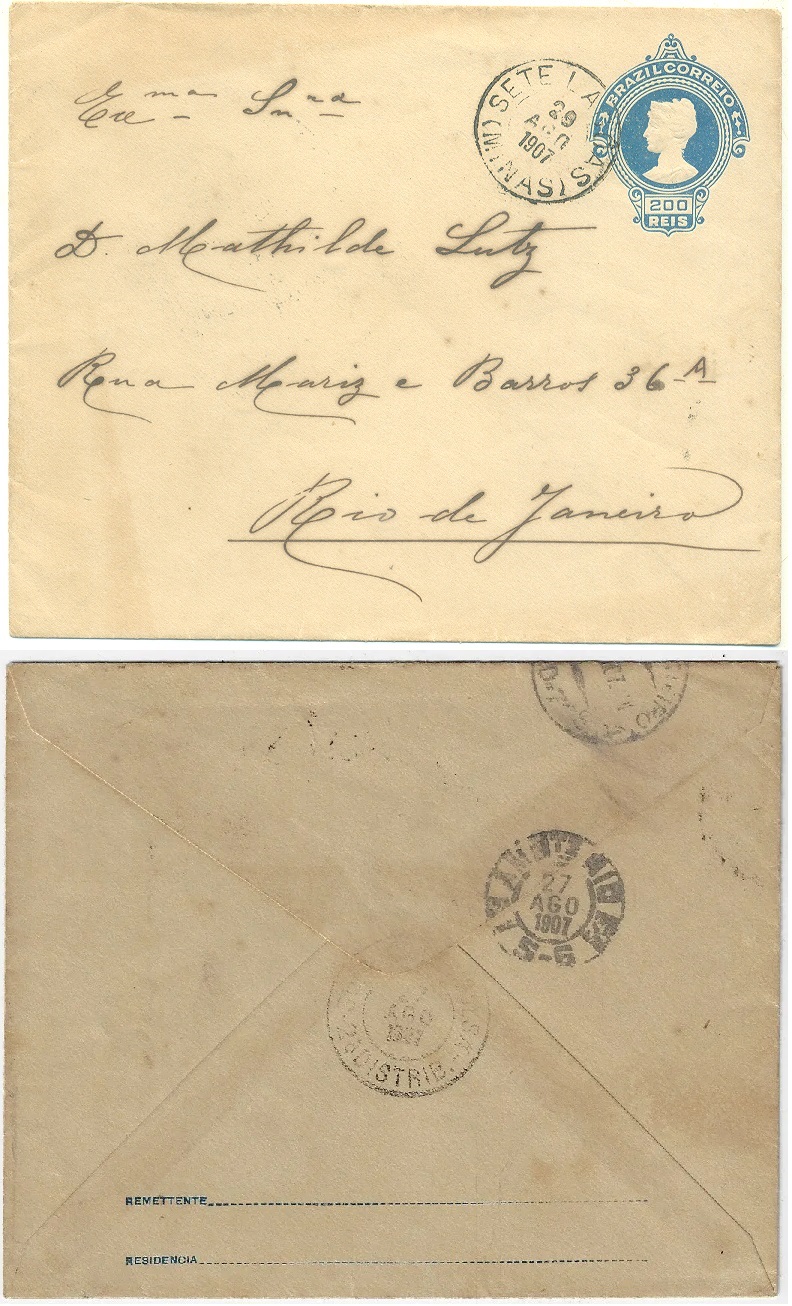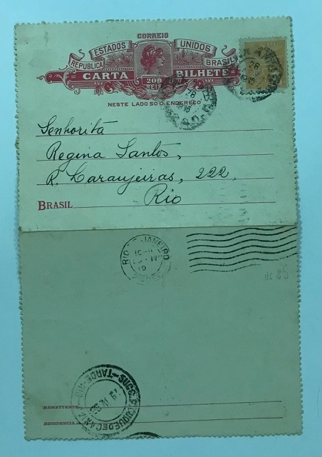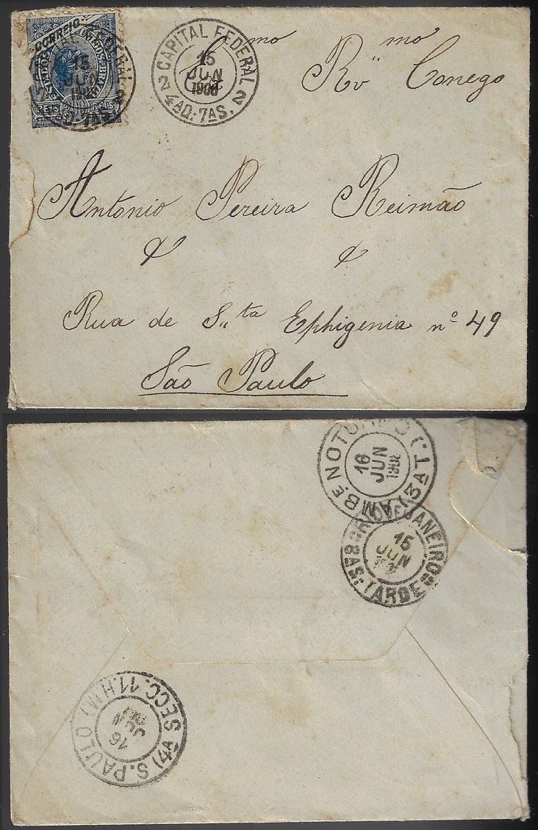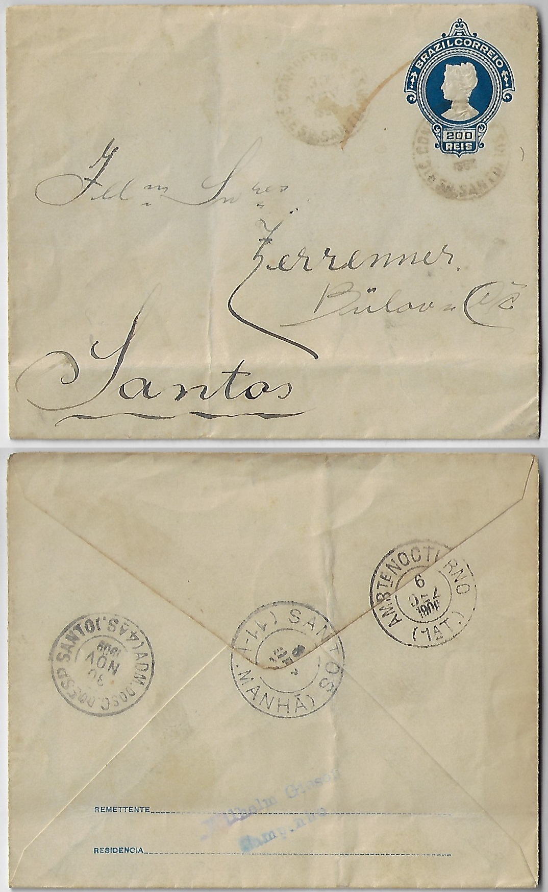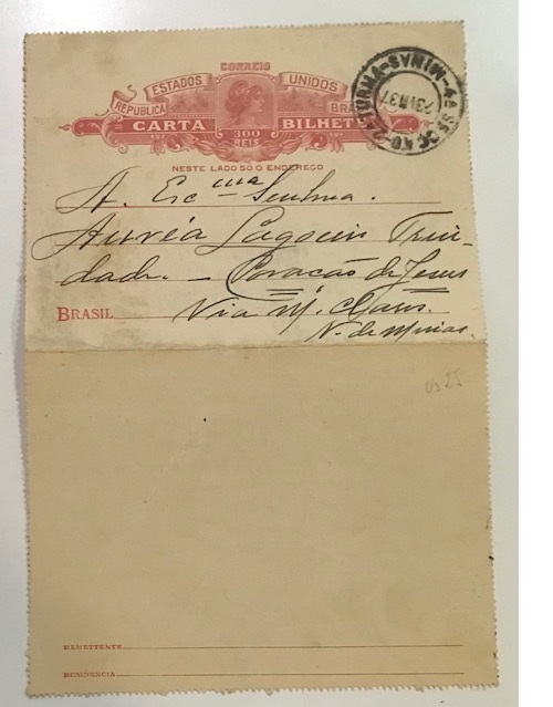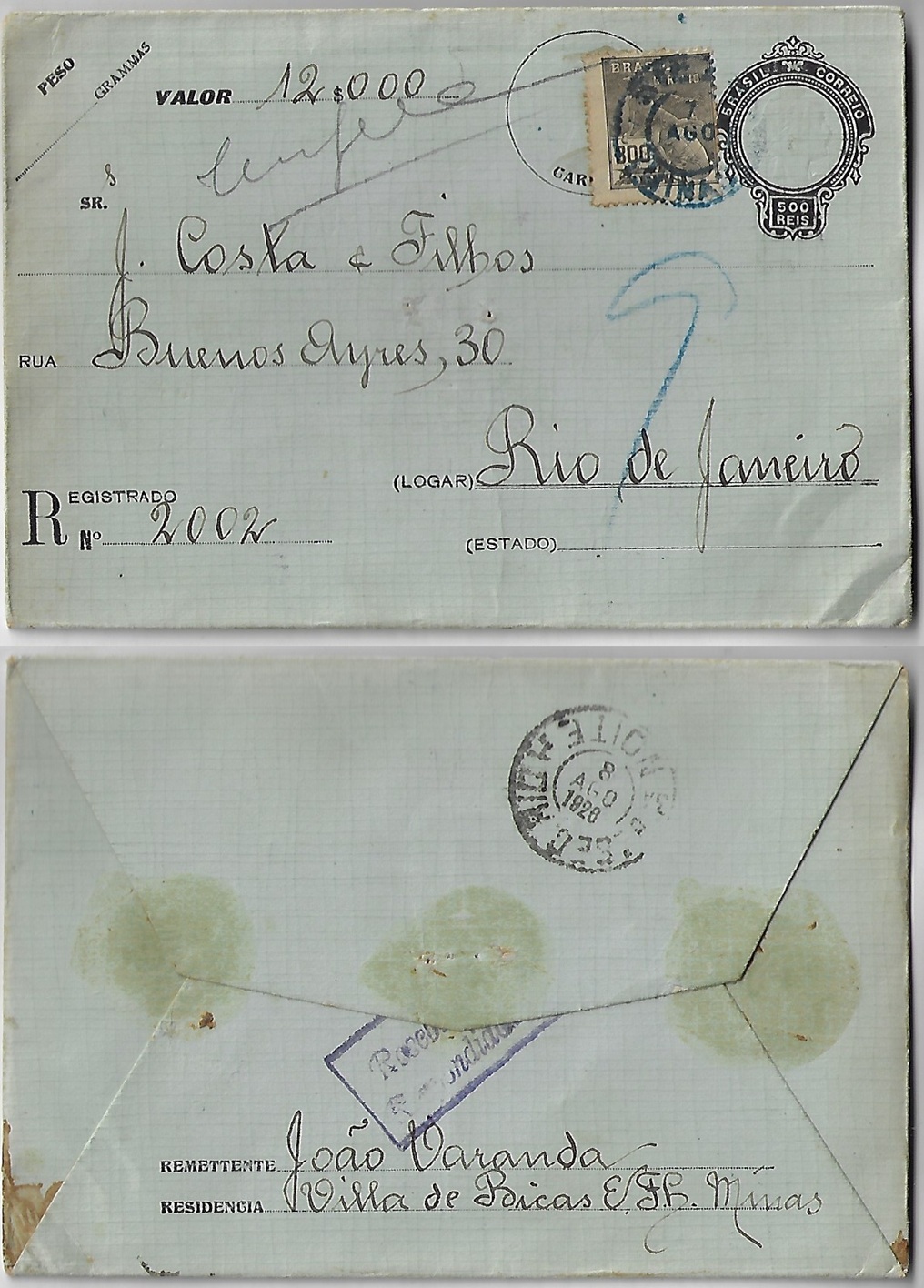 | 69599 | 1902, Inteiro postal EN-45 enviado de Bicas / MG (1/11) para São Paulo (2/11), carimbos Barra do Pirahy / RJ (1/11), "Ambe. Noturno" e "Ambte. Rio", oval aberta 1 mm, "Correio" com aproximadamente 10 mm, segundo "O" de "200" caído para esquerda (24 UF) | 33,00 | Foto |