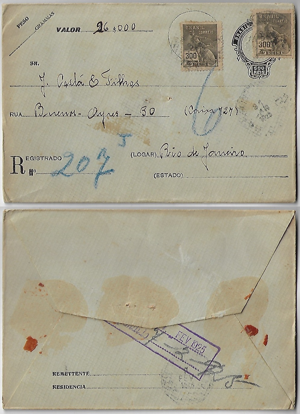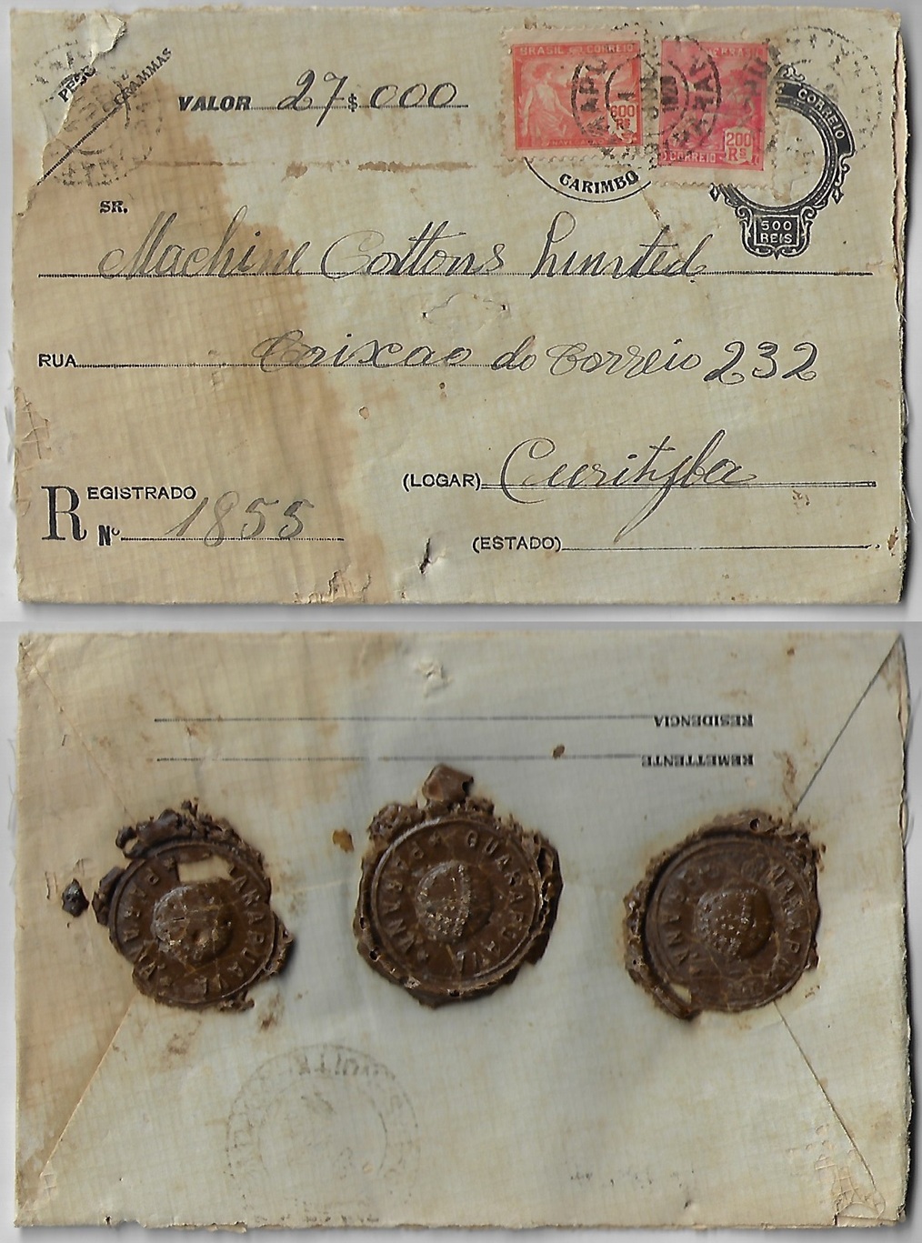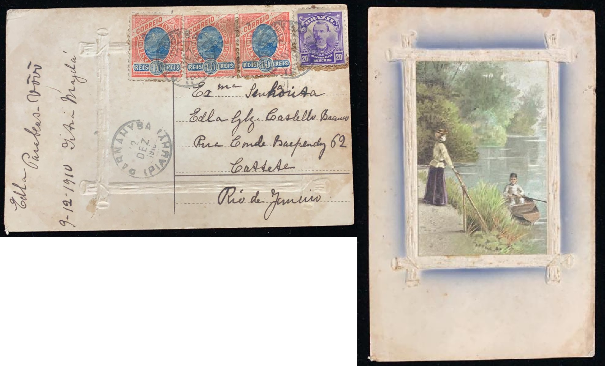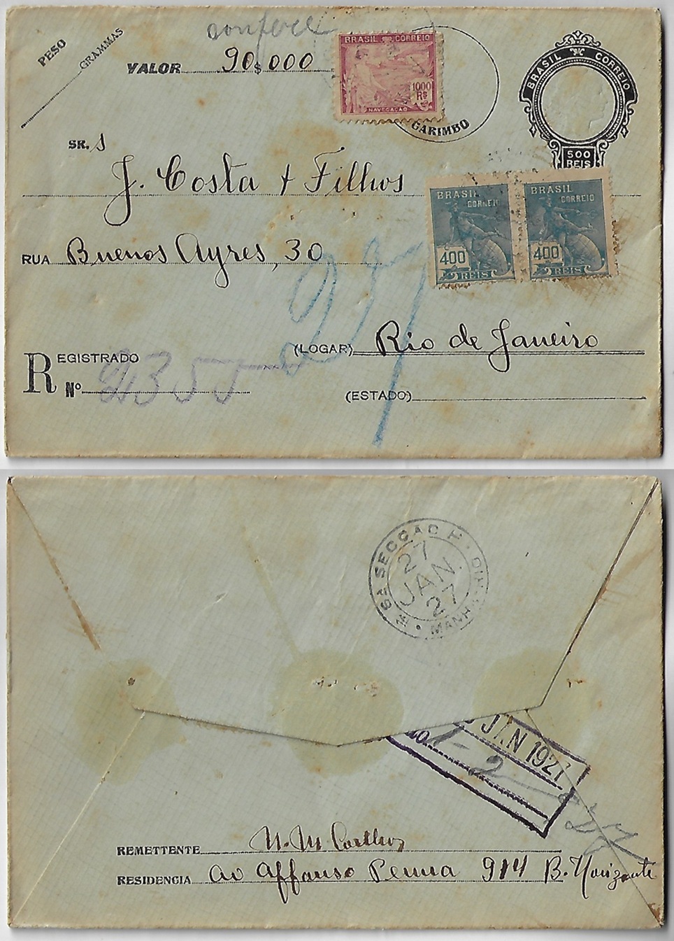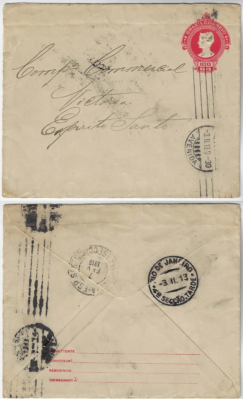 | 69599 | 1902, Inteiro postal EN-45 enviado de Bicas / MG (1/11) para São Paulo (2/11), carimbos Barra do Pirahy / RJ (1/11), "Ambe. Noturno" e "Ambte. Rio", oval aberta 1 mm, "Correio" com aproximadamente 10 mm, segundo "O" de "200" caído para esquerda (24 UF) | 33,00 | Foto |