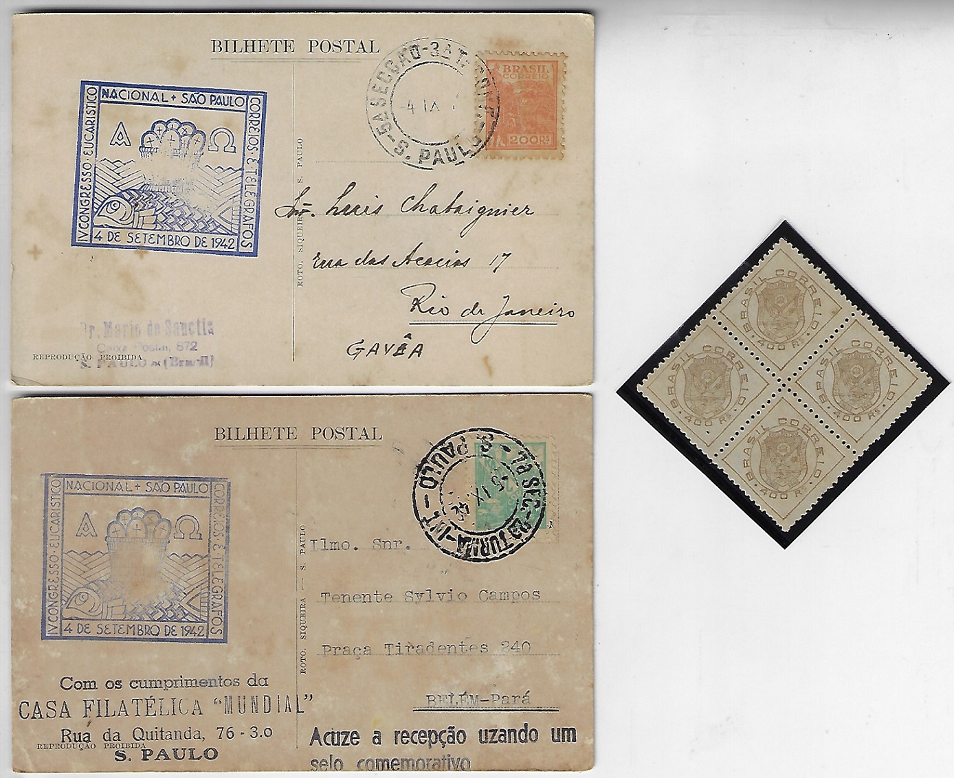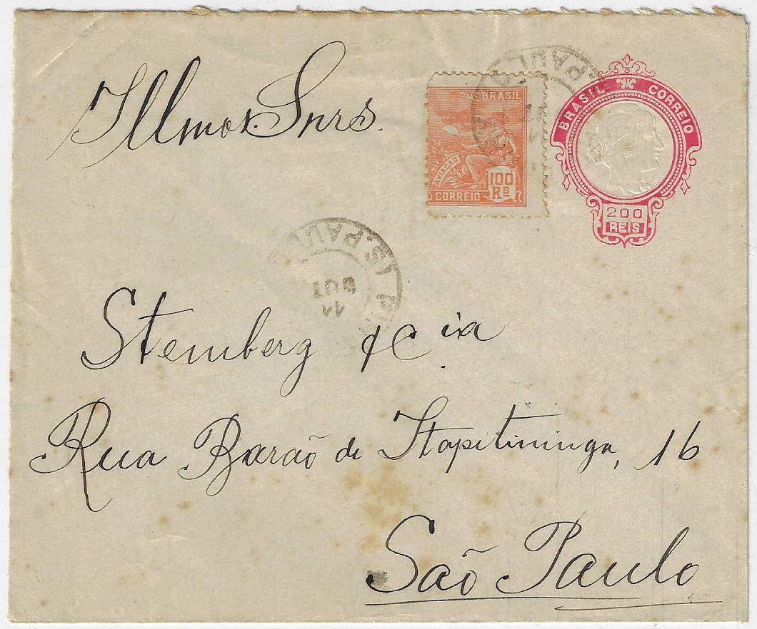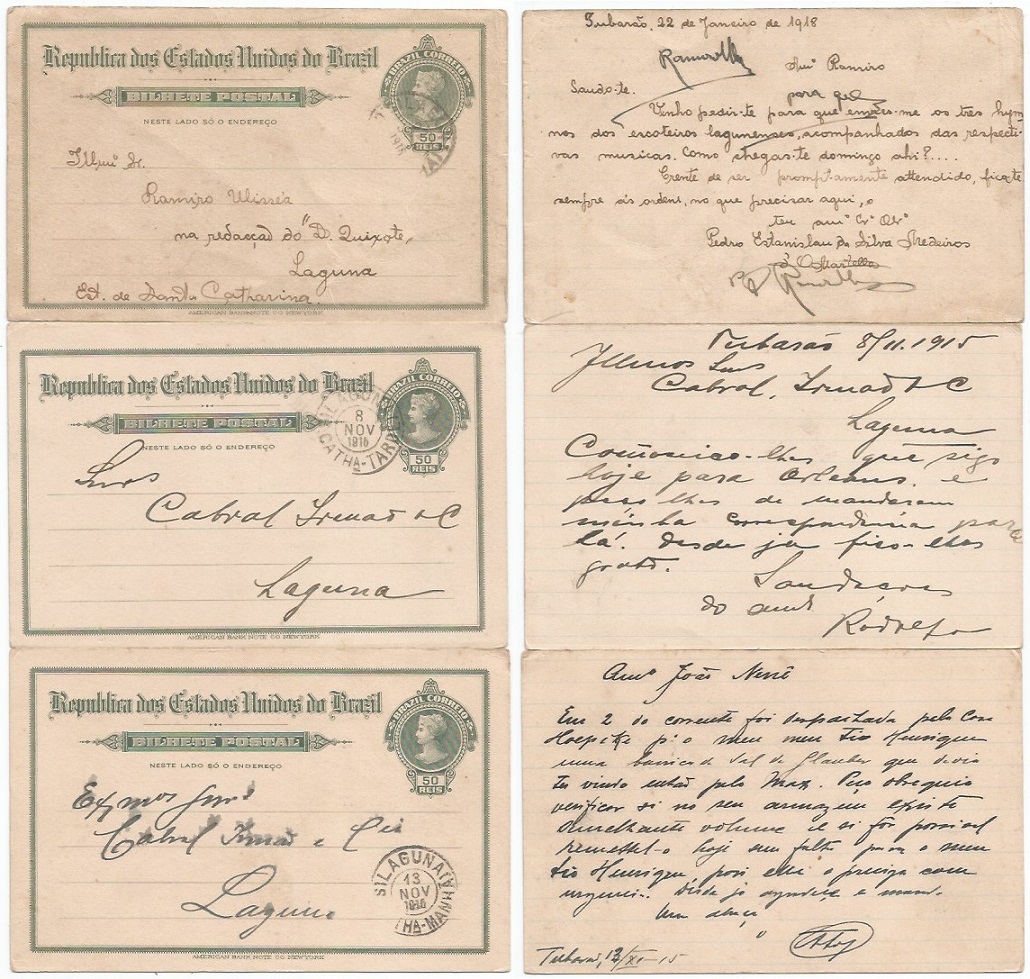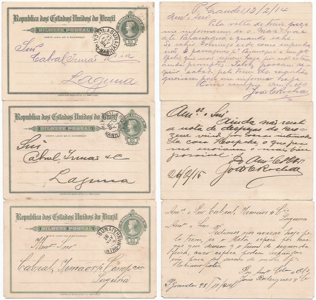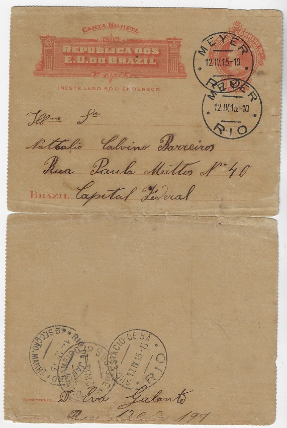 | 69599 | 1902, Inteiro postal EN-45 enviado de Bicas / MG (1/11) para São Paulo (2/11), carimbos Barra do Pirahy / RJ (1/11), "Ambe. Noturno" e "Ambte. Rio", oval aberta 1 mm, "Correio" com aproximadamente 10 mm, segundo "O" de "200" caído para esquerda (24 UF) | 33,00 | Foto |