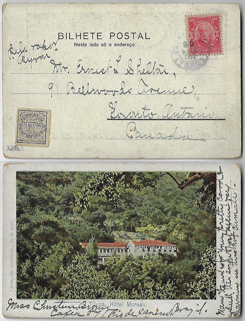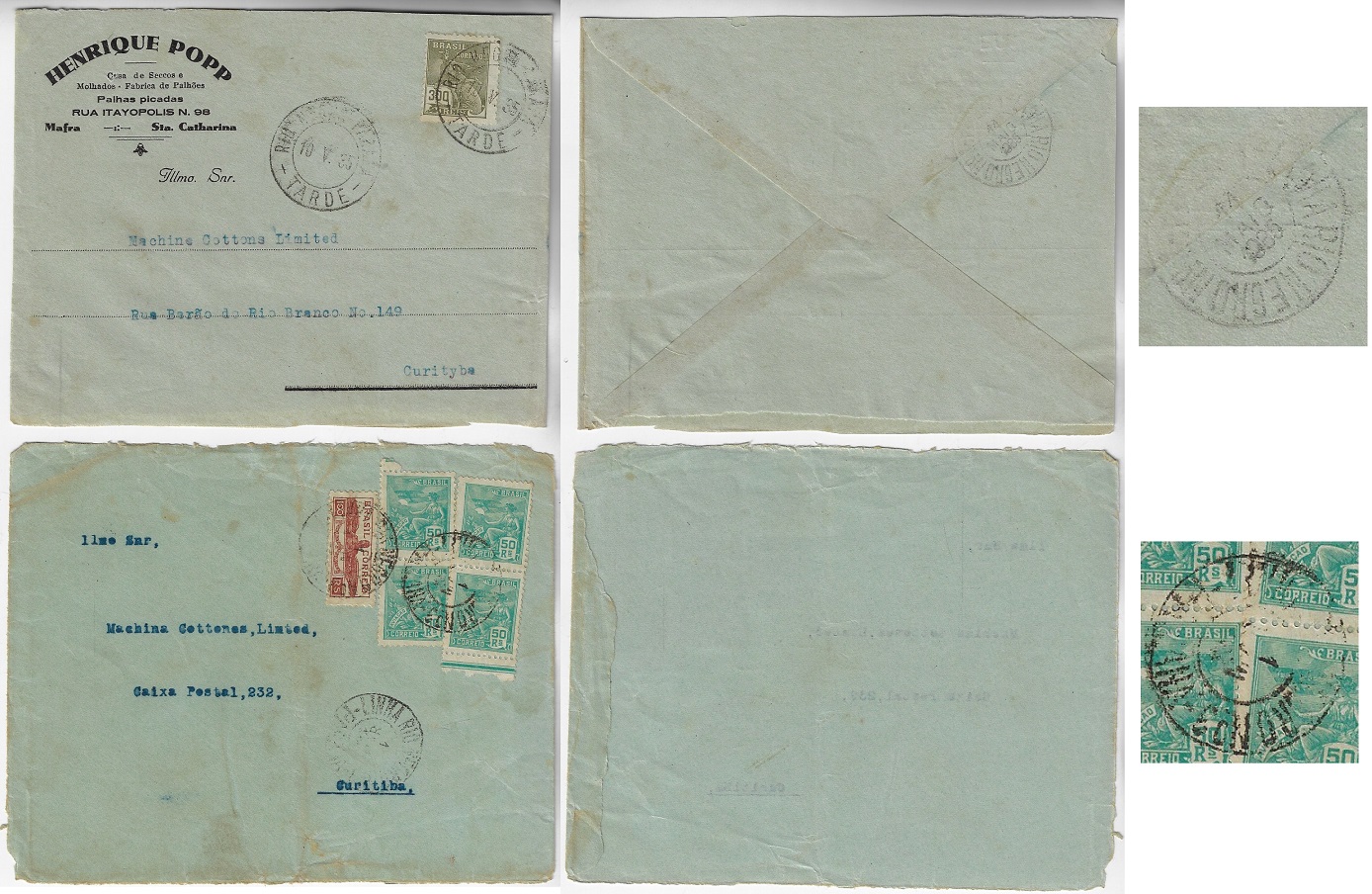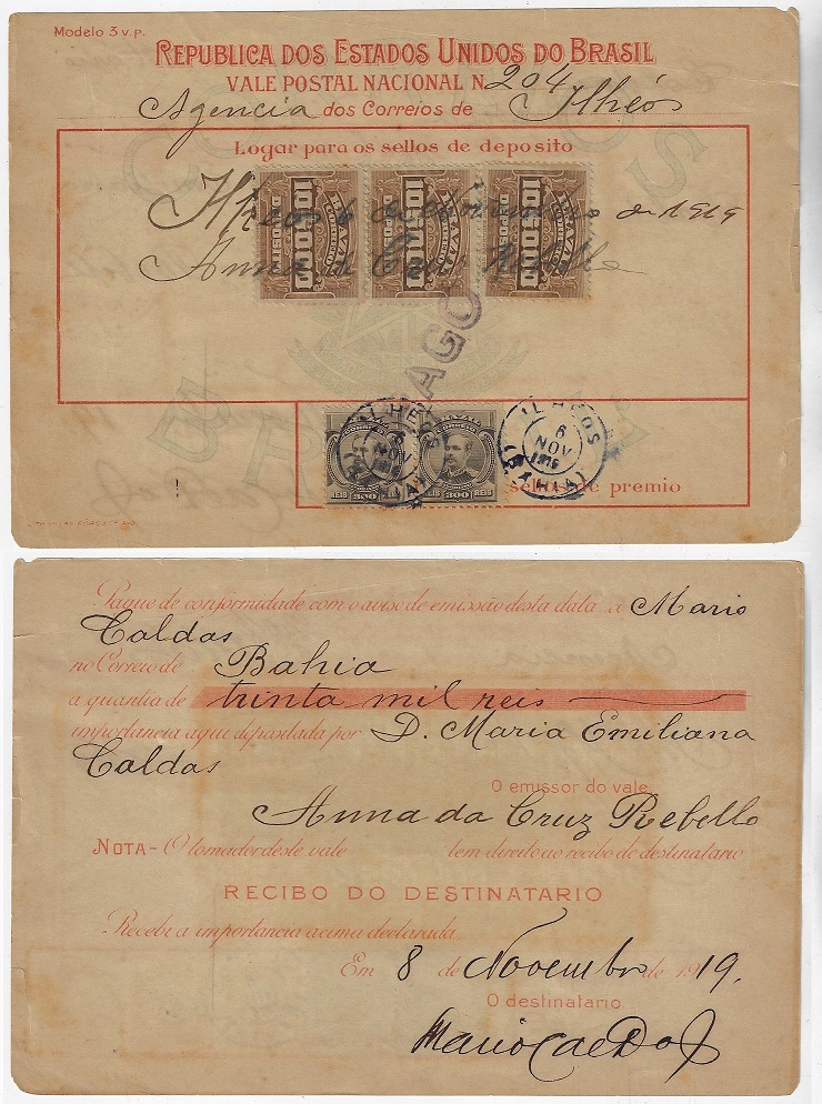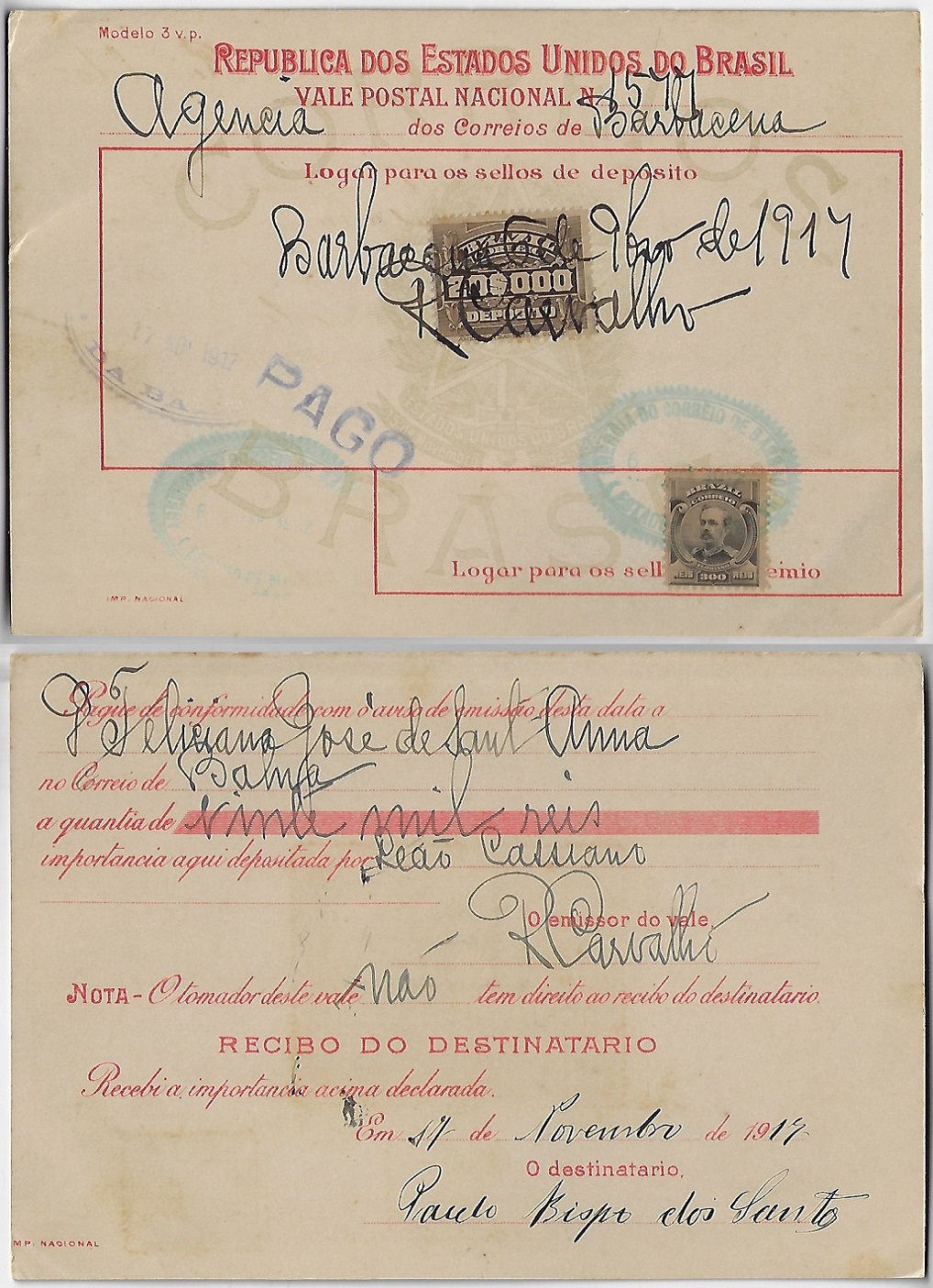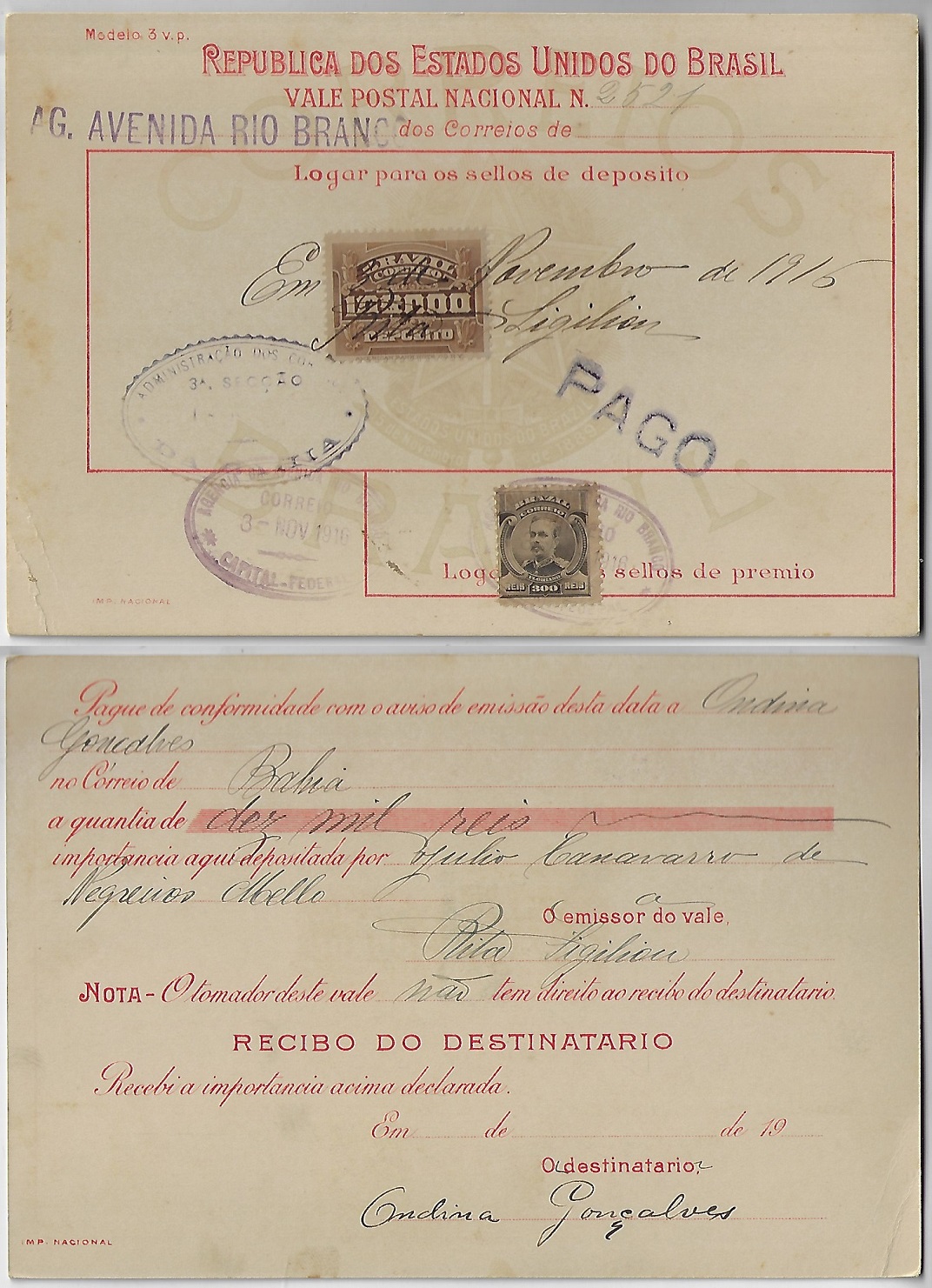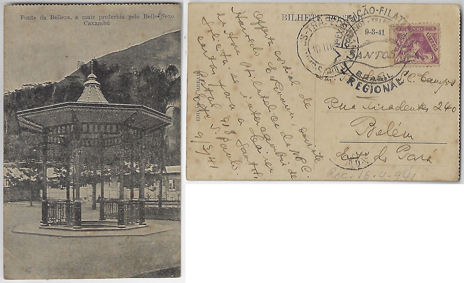 | 69599 | 1902, Inteiro postal EN-45 enviado de Bicas / MG (1/11) para São Paulo (2/11), carimbos Barra do Pirahy / RJ (1/11), "Ambe. Noturno" e "Ambte. Rio", oval aberta 1 mm, "Correio" com aproximadamente 10 mm, segundo "O" de "200" caído para esquerda (24 UF) | 33,00 | Foto |