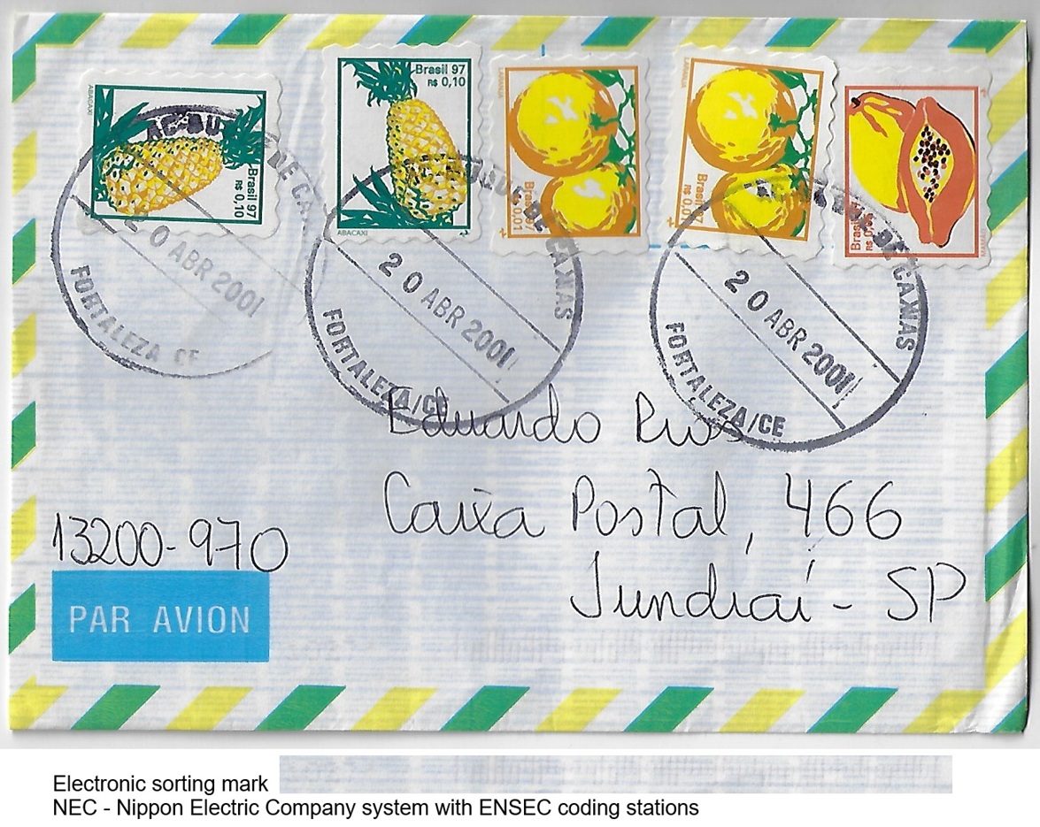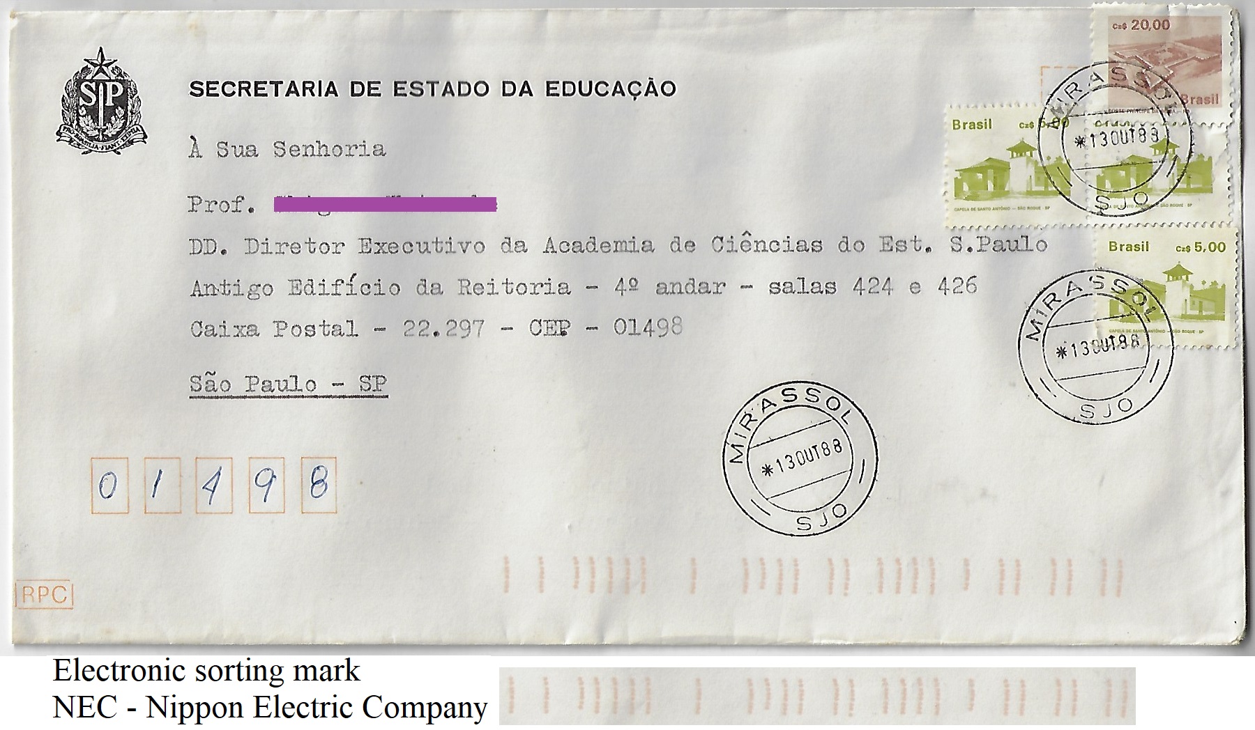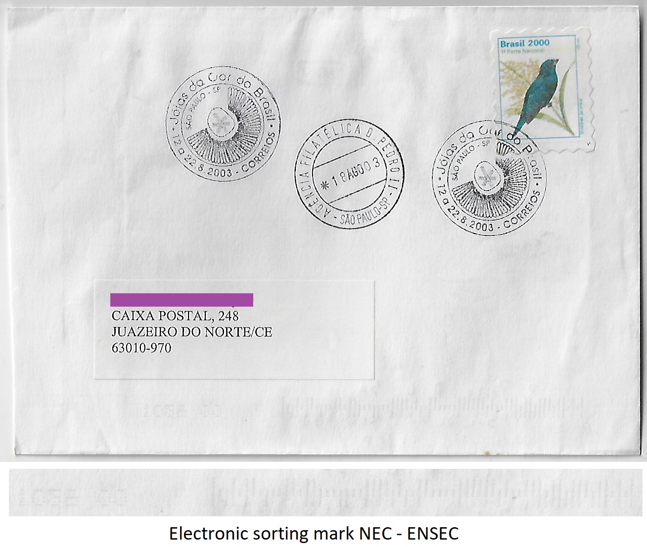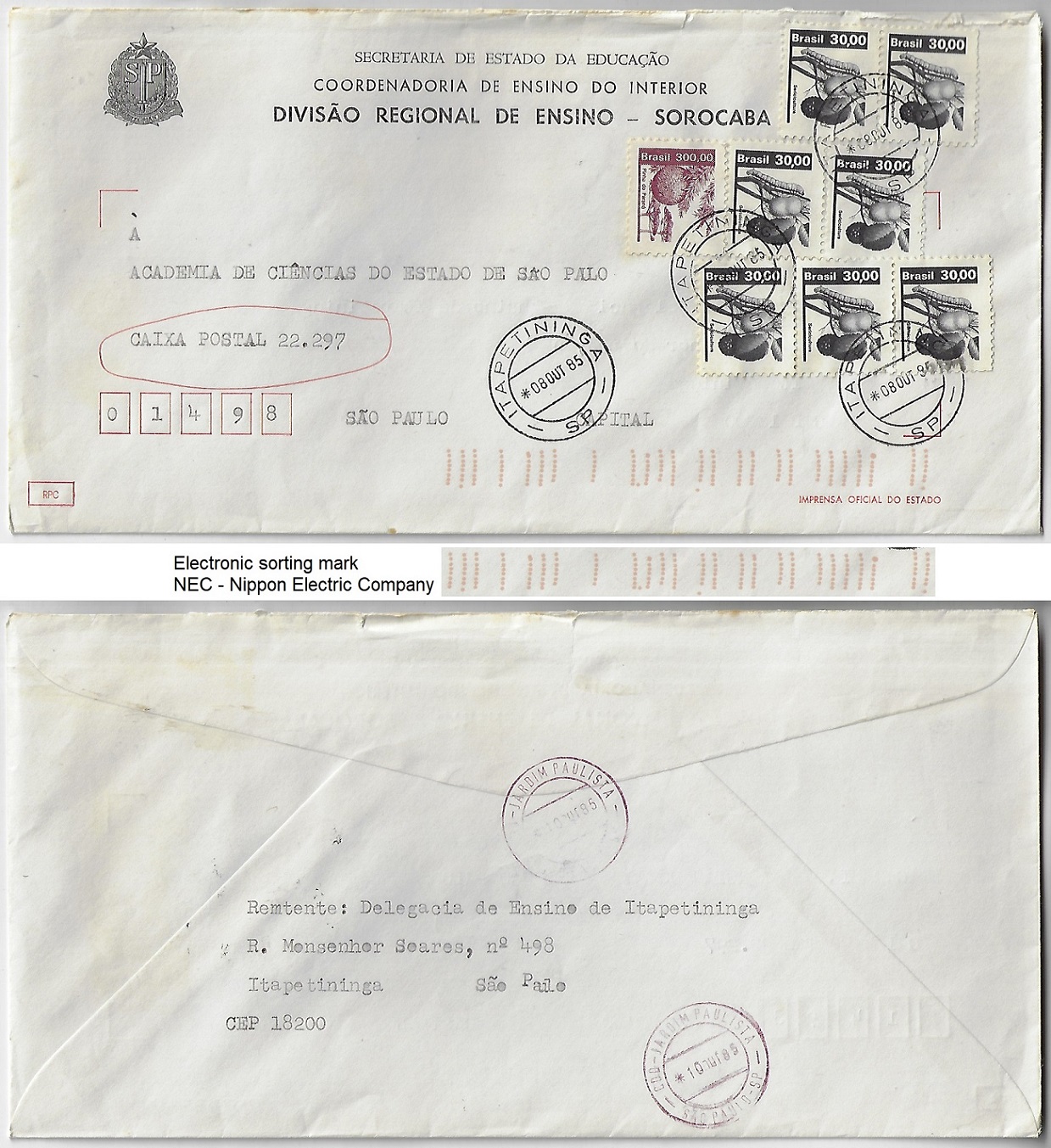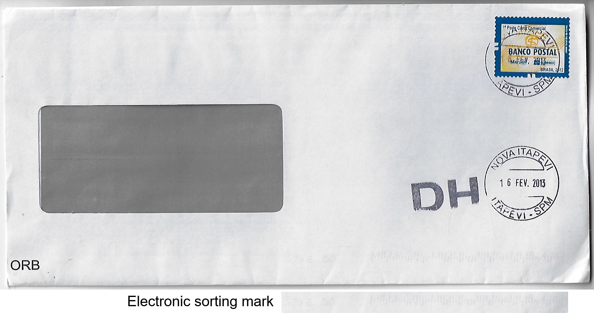 | 84782 | 2013, envelope janelado enviado de Itapevi, agência Nova Itapevi (16/2), porteado com selo Banco Postal, carimbo DH = Depois da Hora, marcas de triagem eletrônica do sistema NEC - Nippon Electric Company com postos de codificação ENSEC | 10,00 | Foto |