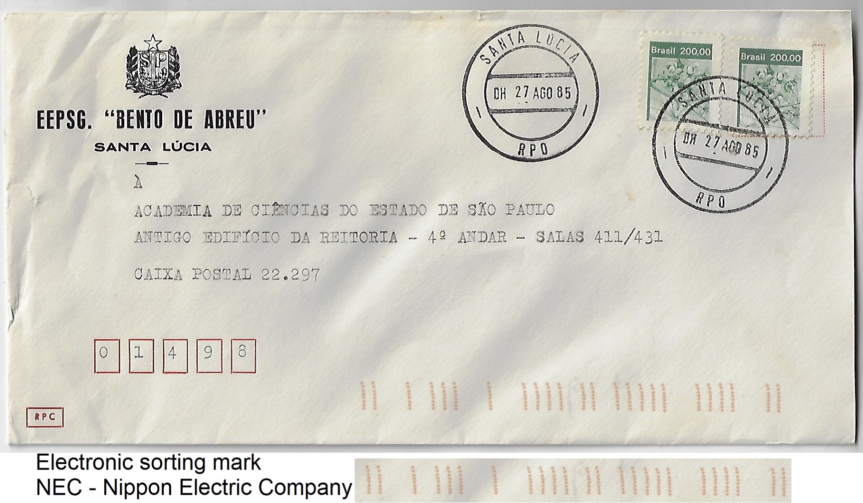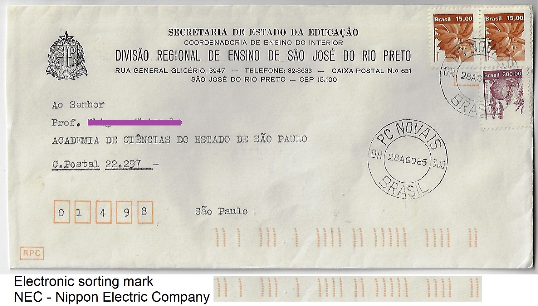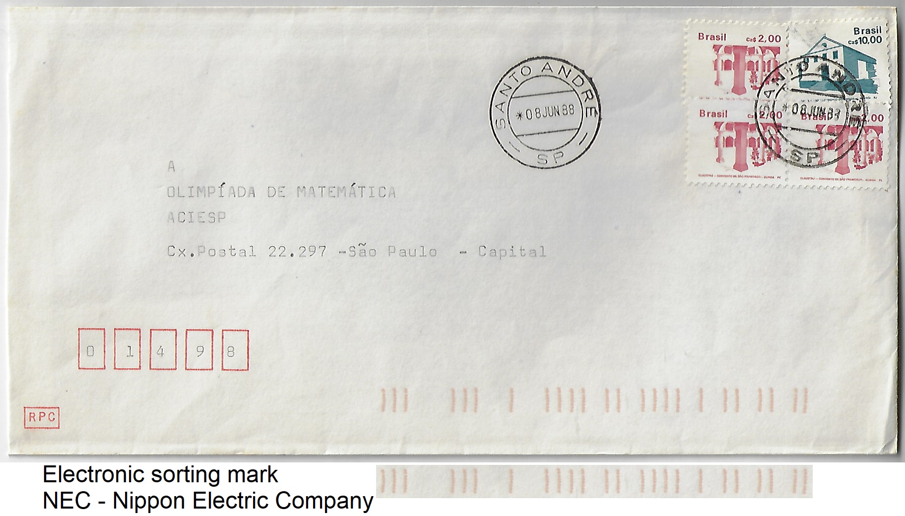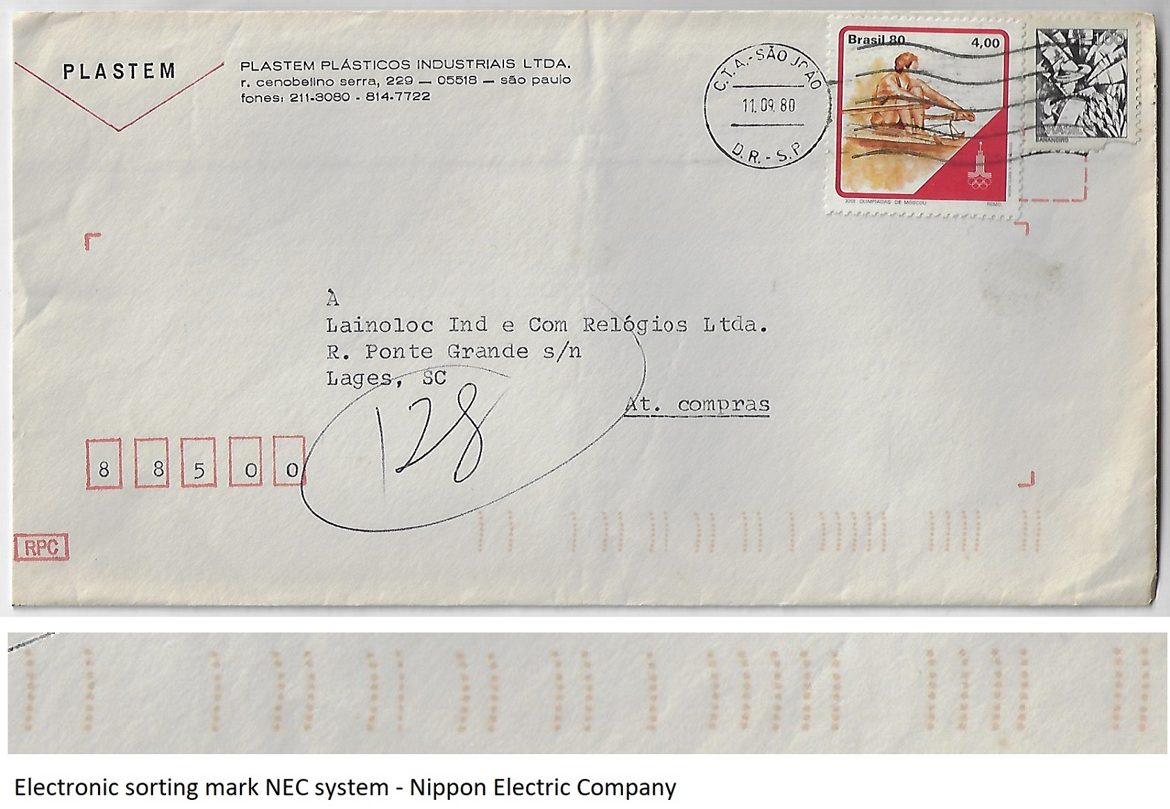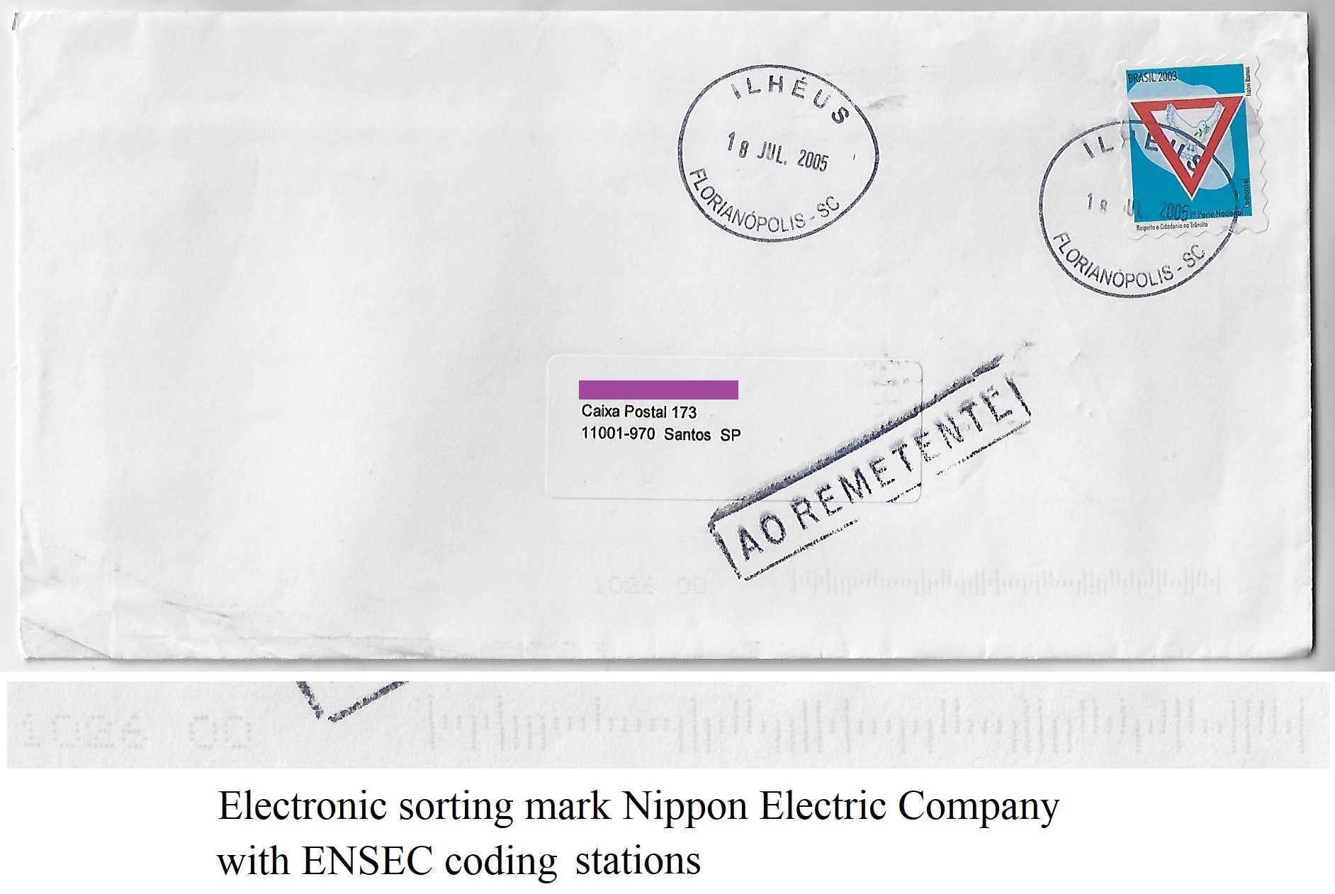 | 84782 | 2013, envelope janelado enviado de Itapevi, agência Nova Itapevi (16/2), porteado com selo Banco Postal, carimbo DH = Depois da Hora, marcas de triagem eletrônica do sistema NEC - Nippon Electric Company com postos de codificação ENSEC | 10,00 | Foto |