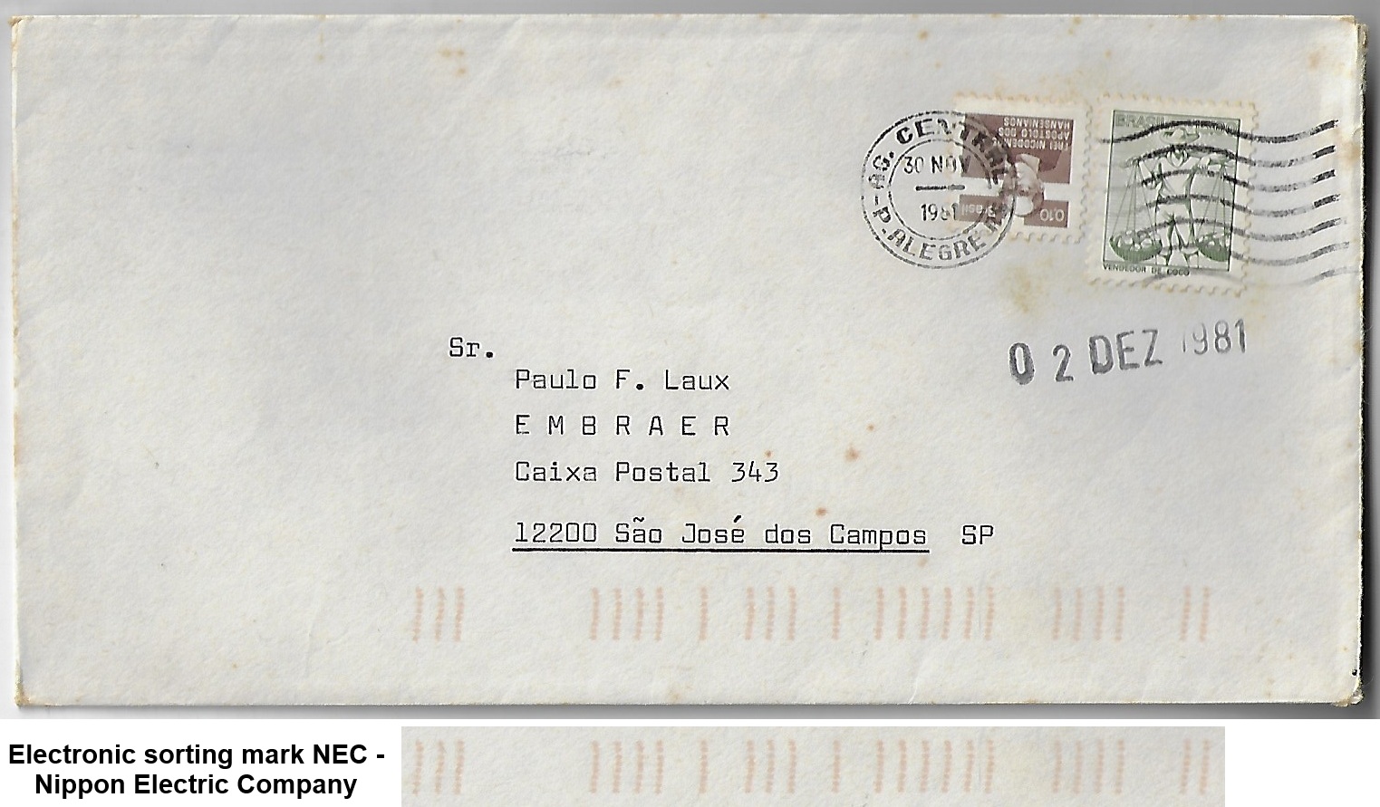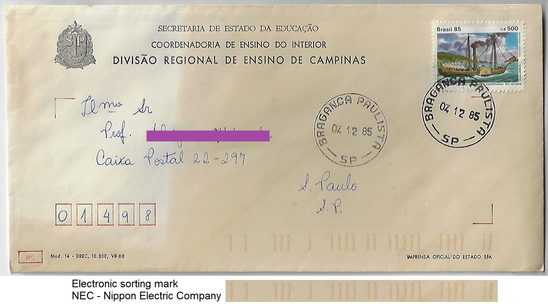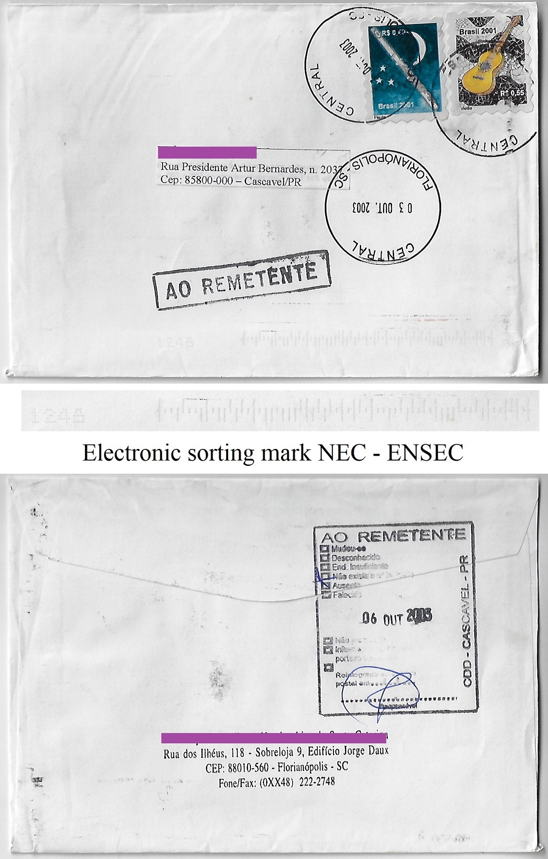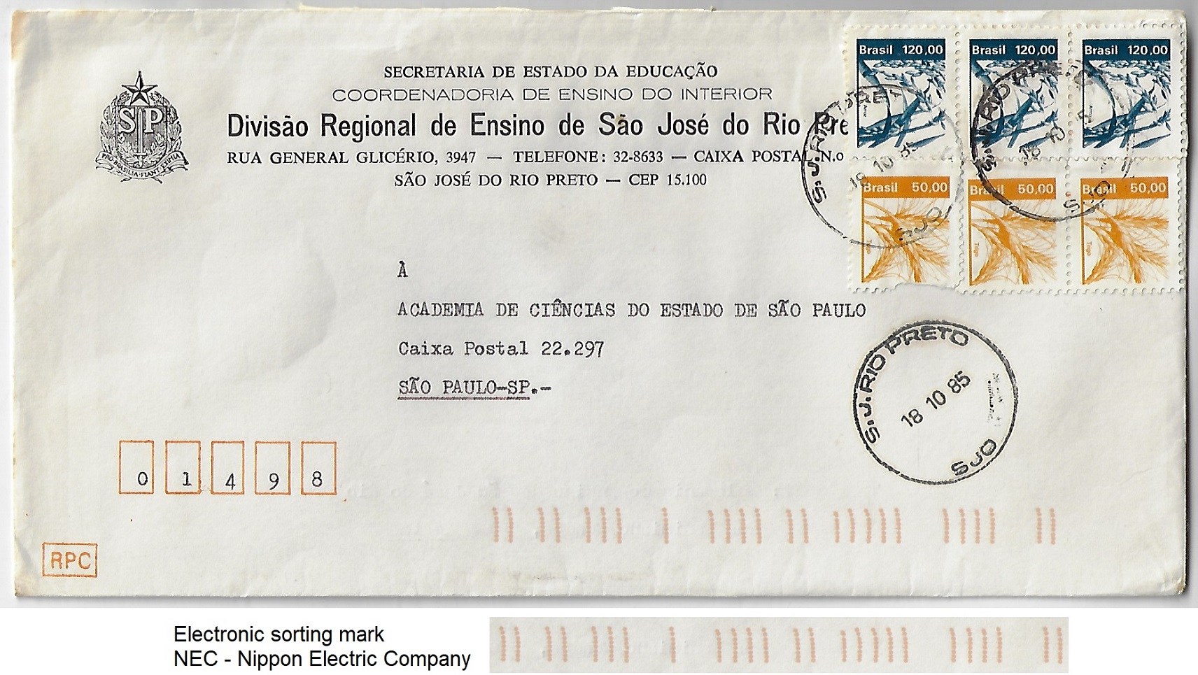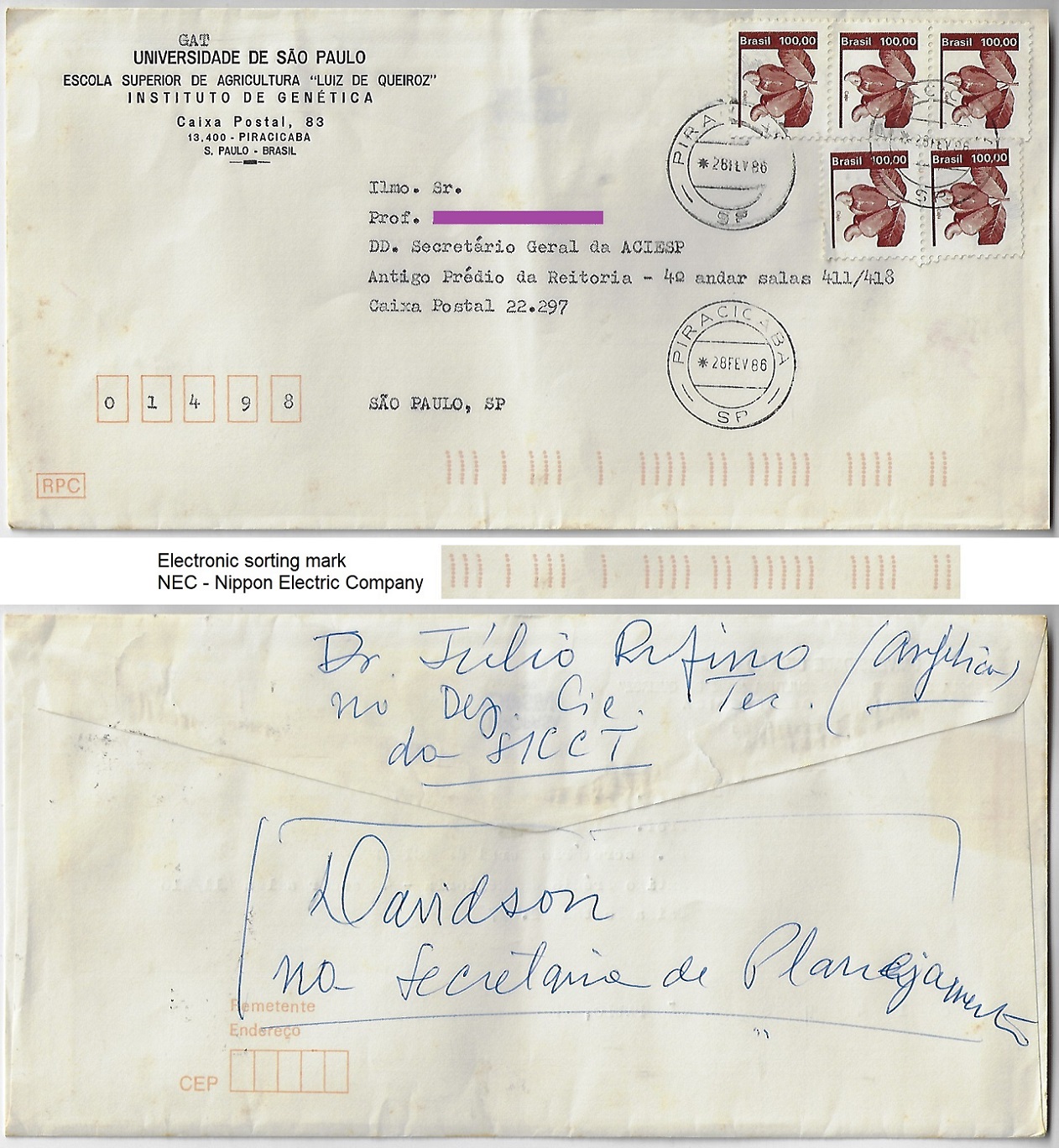 | 84782 | 2013, envelope janelado enviado de Itapevi, agência Nova Itapevi (16/2), porteado com selo Banco Postal, carimbo DH = Depois da Hora, marcas de triagem eletrônica do sistema NEC - Nippon Electric Company com postos de codificação ENSEC | 10,00 | Foto |
