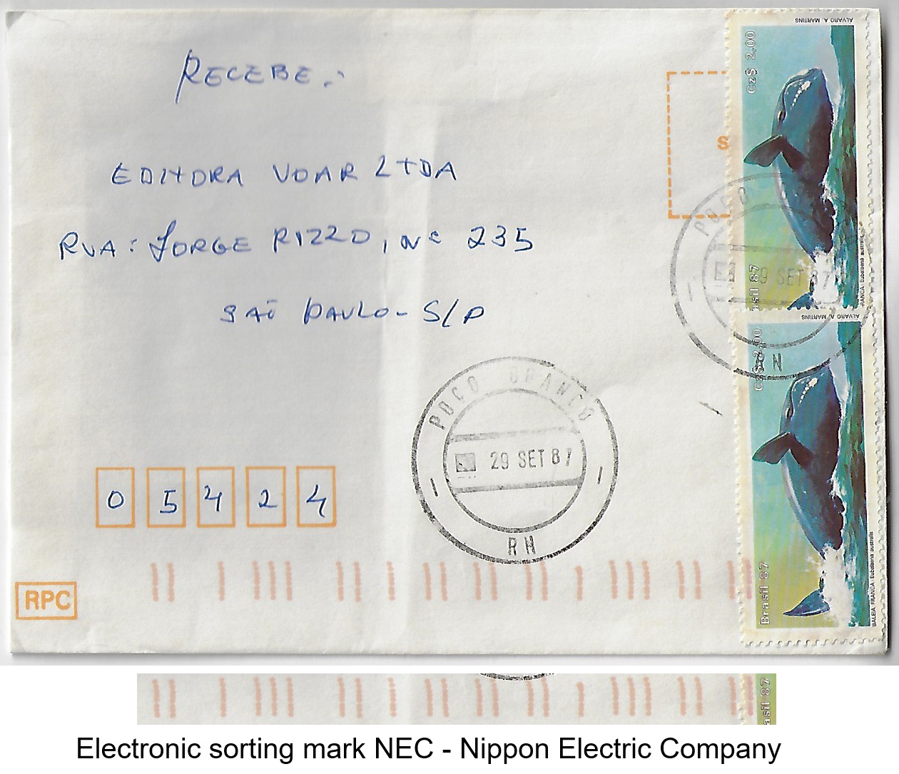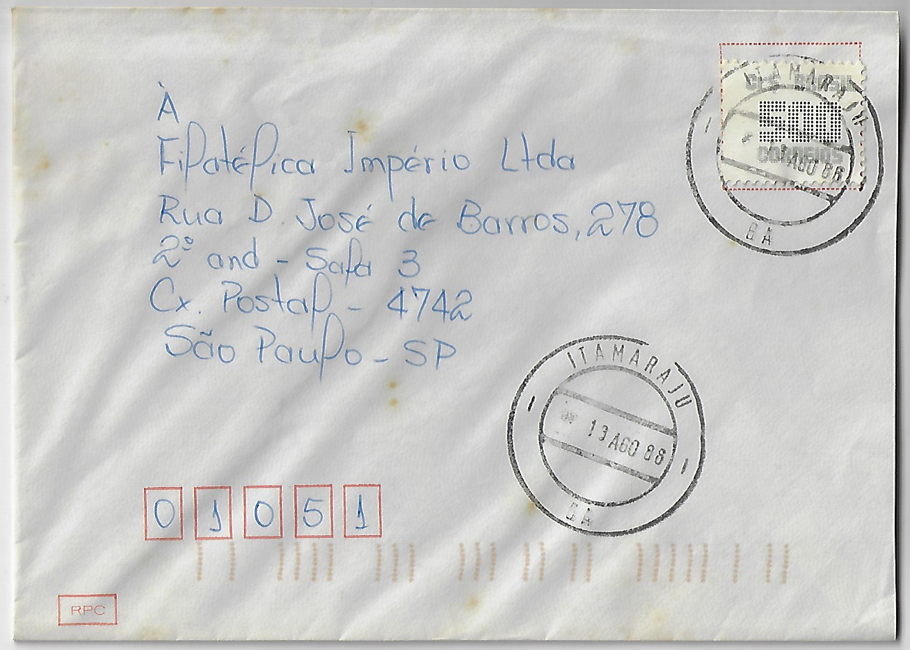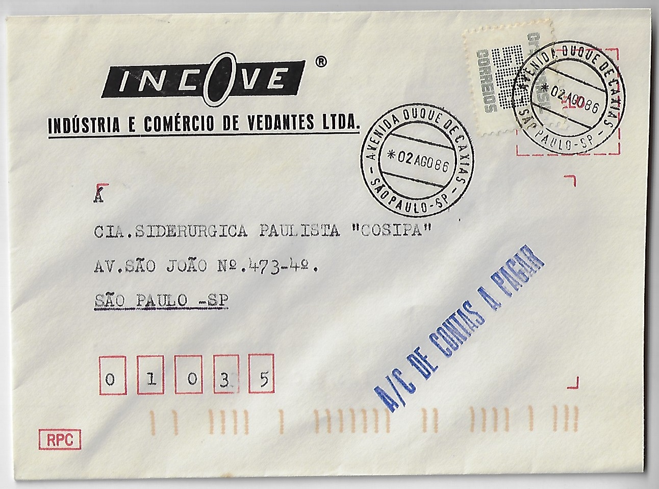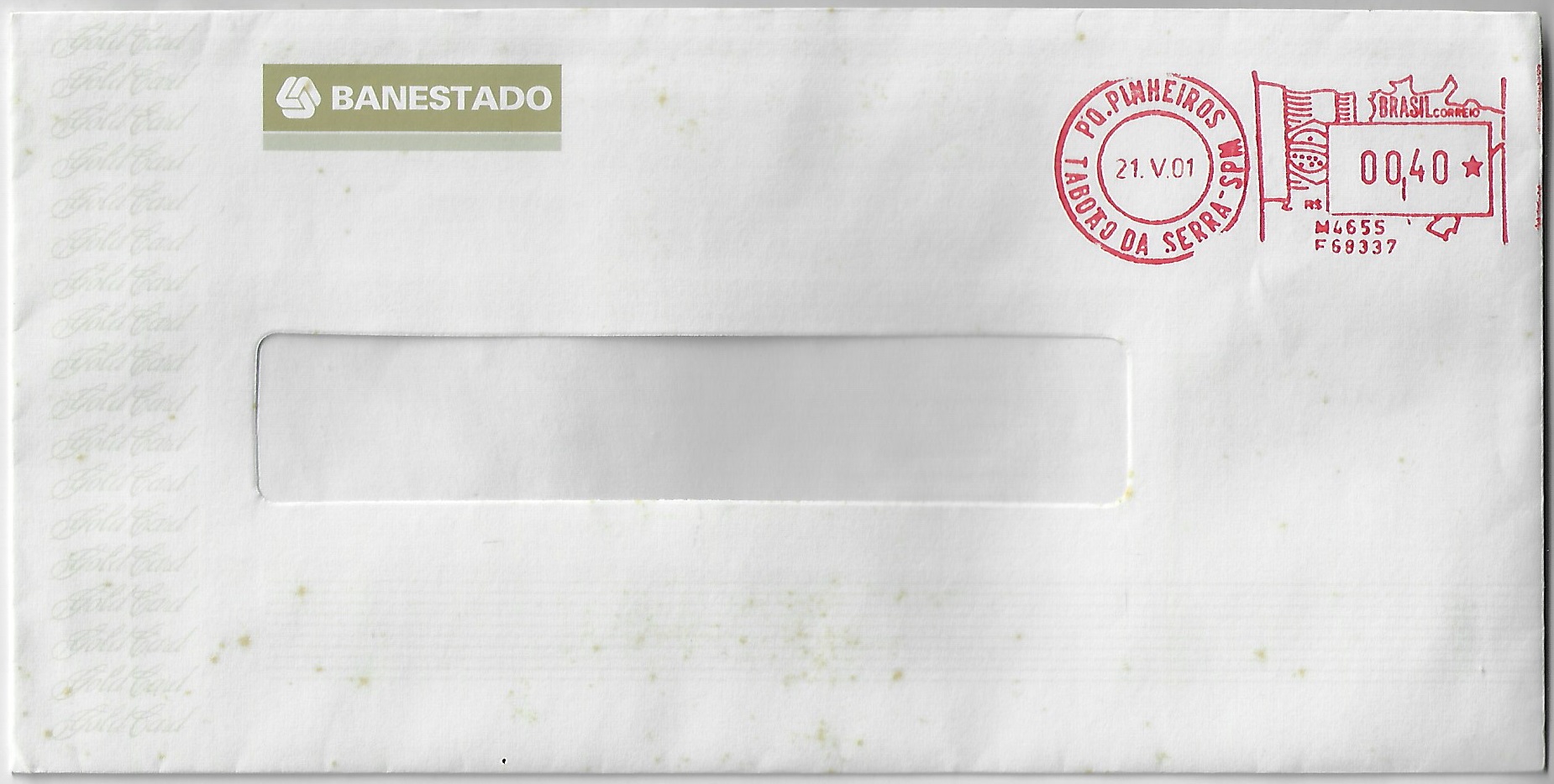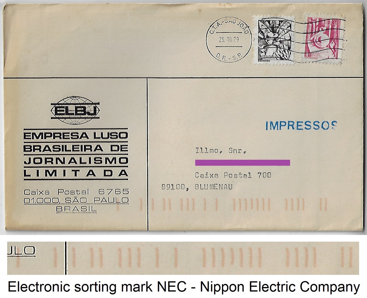 | 84782 | 2013, envelope janelado enviado de Itapevi, agência Nova Itapevi (16/2), porteado com selo Banco Postal, carimbo DH = Depois da Hora, marcas de triagem eletrônica do sistema NEC - Nippon Electric Company com postos de codificação ENSEC | 10,00 | Foto |