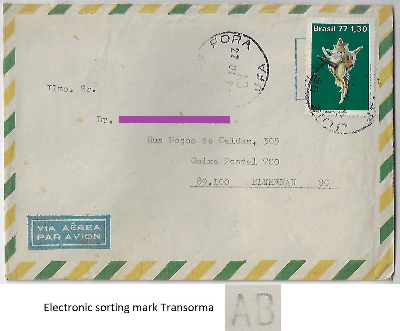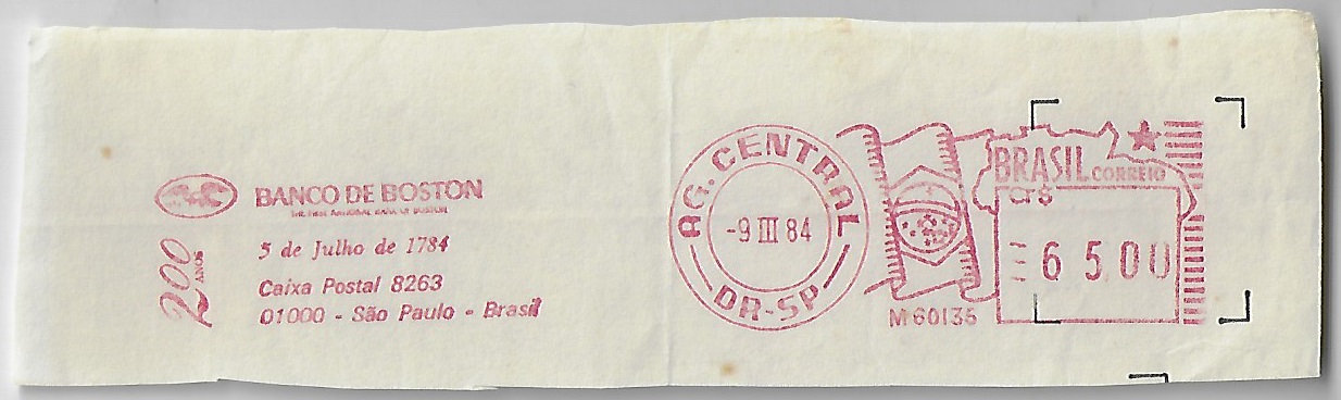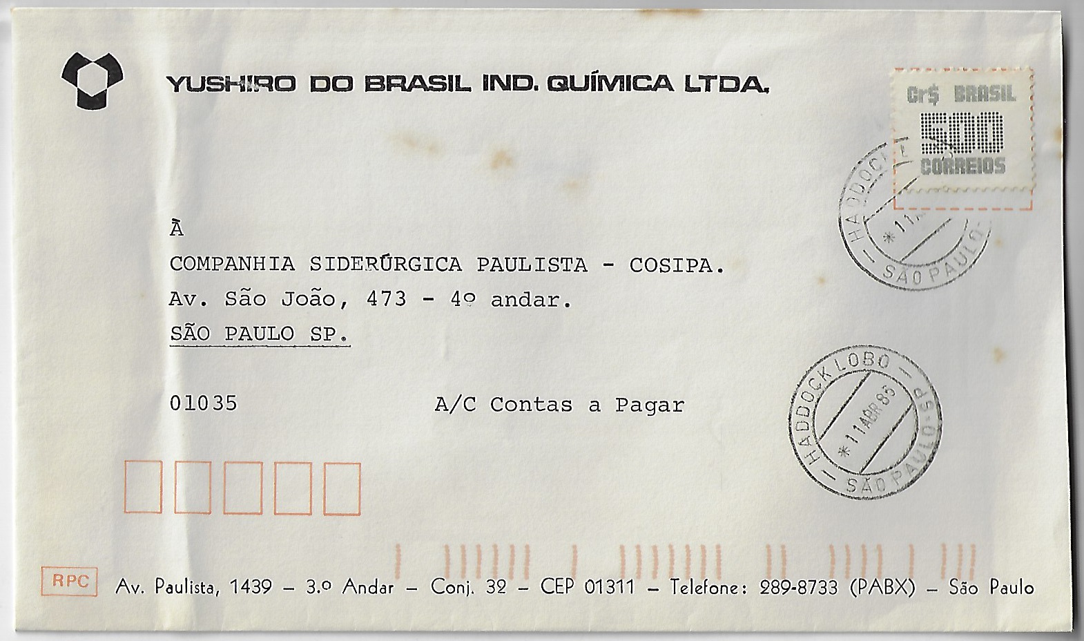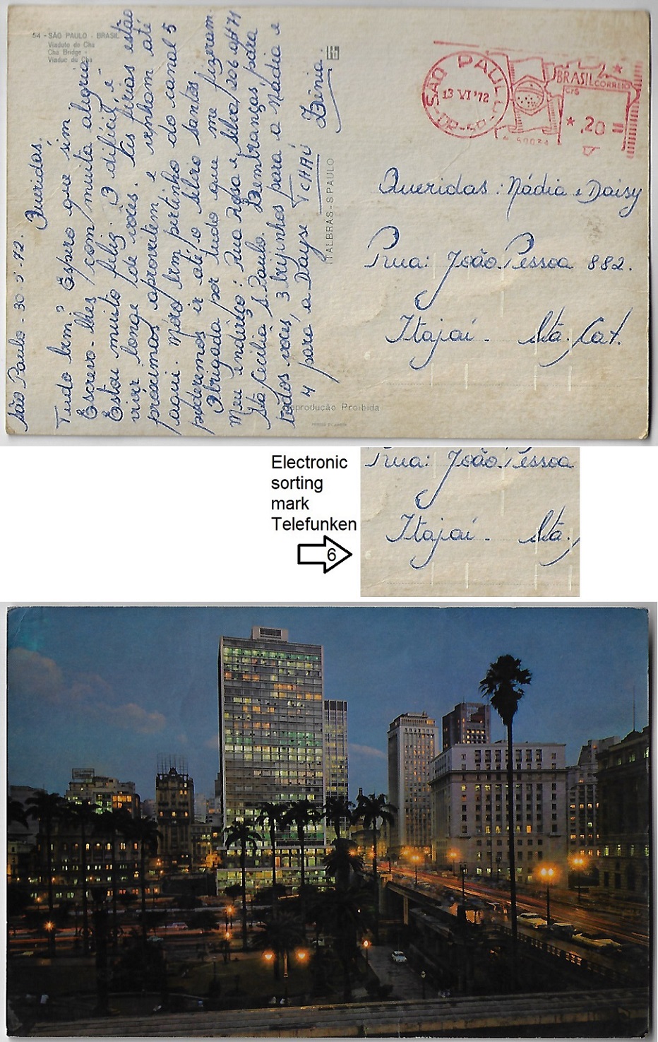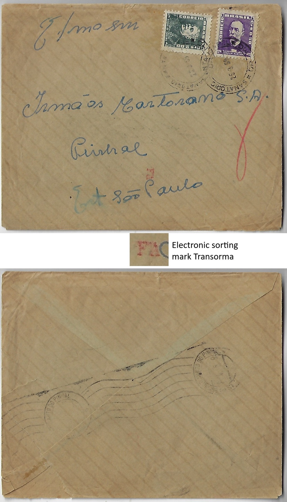 | 84782 | 2013, envelope janelado enviado de Itapevi, agência Nova Itapevi (16/2), porteado com selo Banco Postal, carimbo DH = Depois da Hora, marcas de triagem eletrônica do sistema NEC - Nippon Electric Company com postos de codificação ENSEC | 10,00 | Foto |