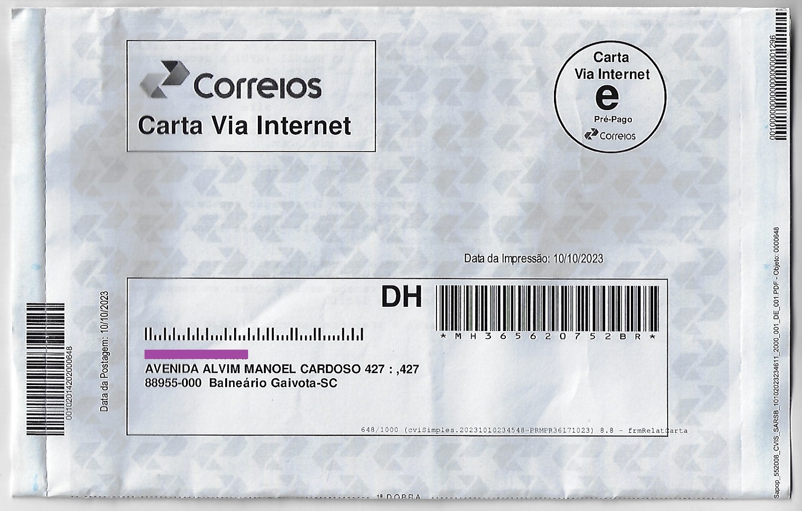 | 49036 | 2023, inteiro postal Carta Via Internet enviado em 10/10 para Balneário Gaivota, cobrança do serviço de Despacho Postal referente a encomenda internacional | 15,00 | Foto |