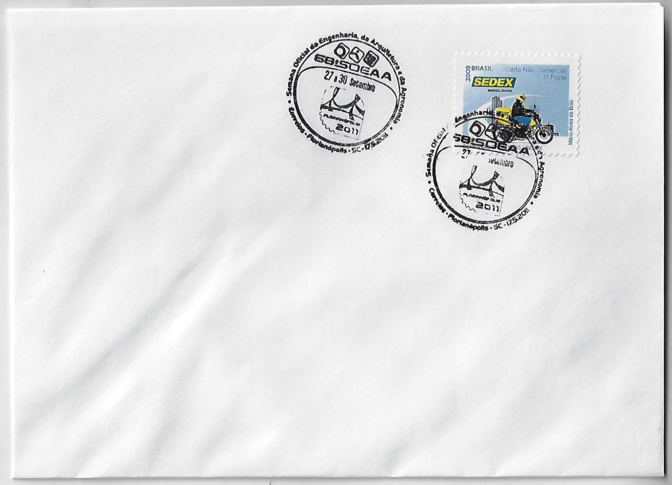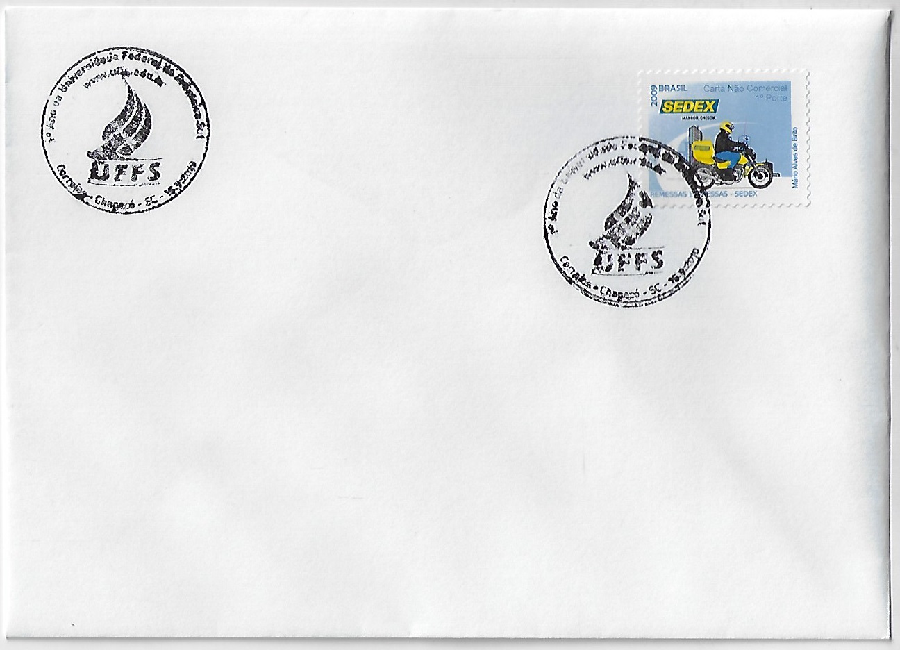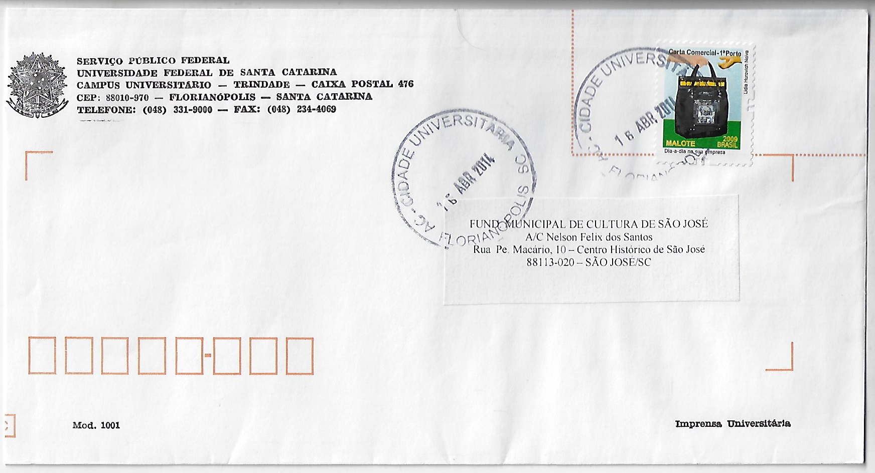 | 51840 | 2014, envelope timbrado da Universidade Federal de Santa Catarina enviado de Florianópolis, agência Cidade Universitária (16/4) para São José, selo RHM-853, Malote Postal | 10,00 | Foto |