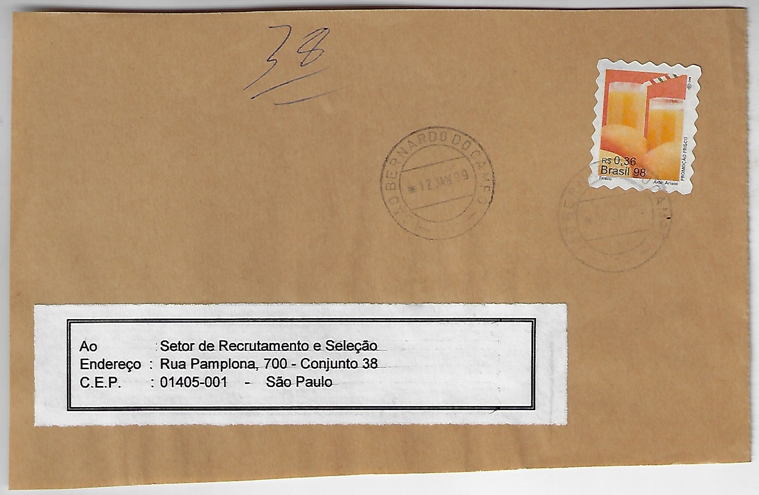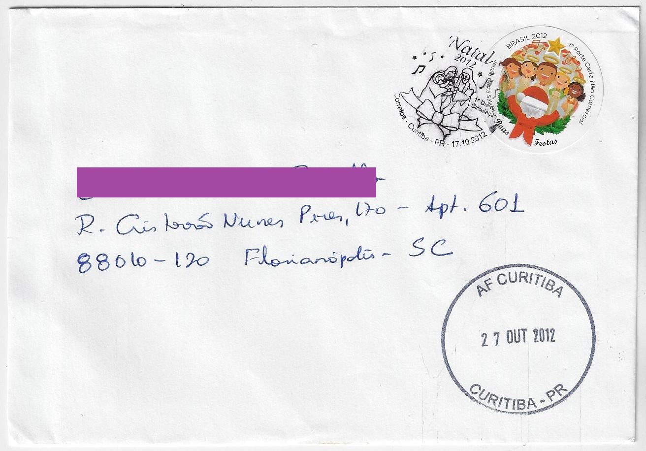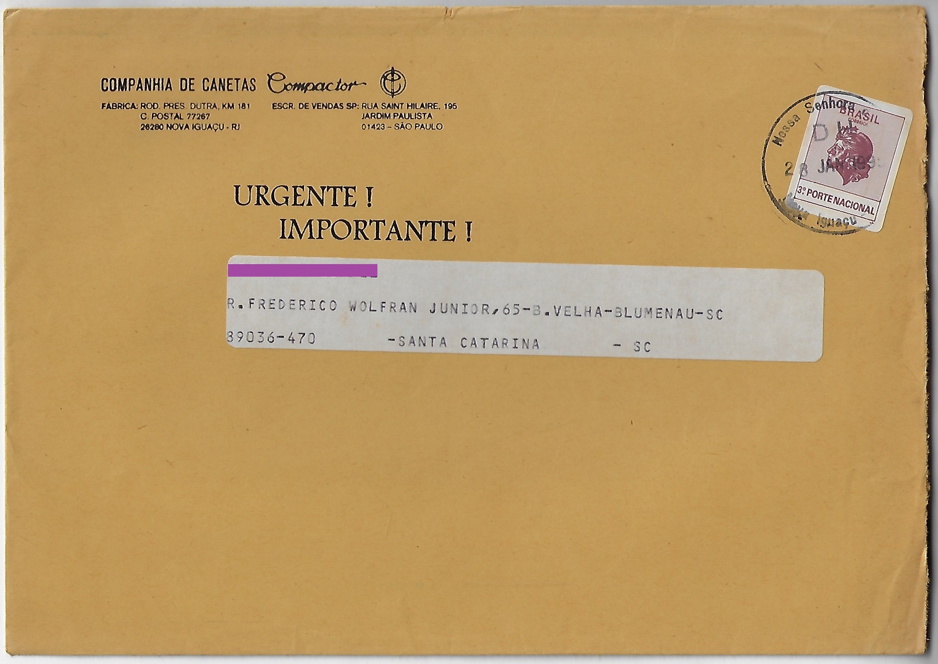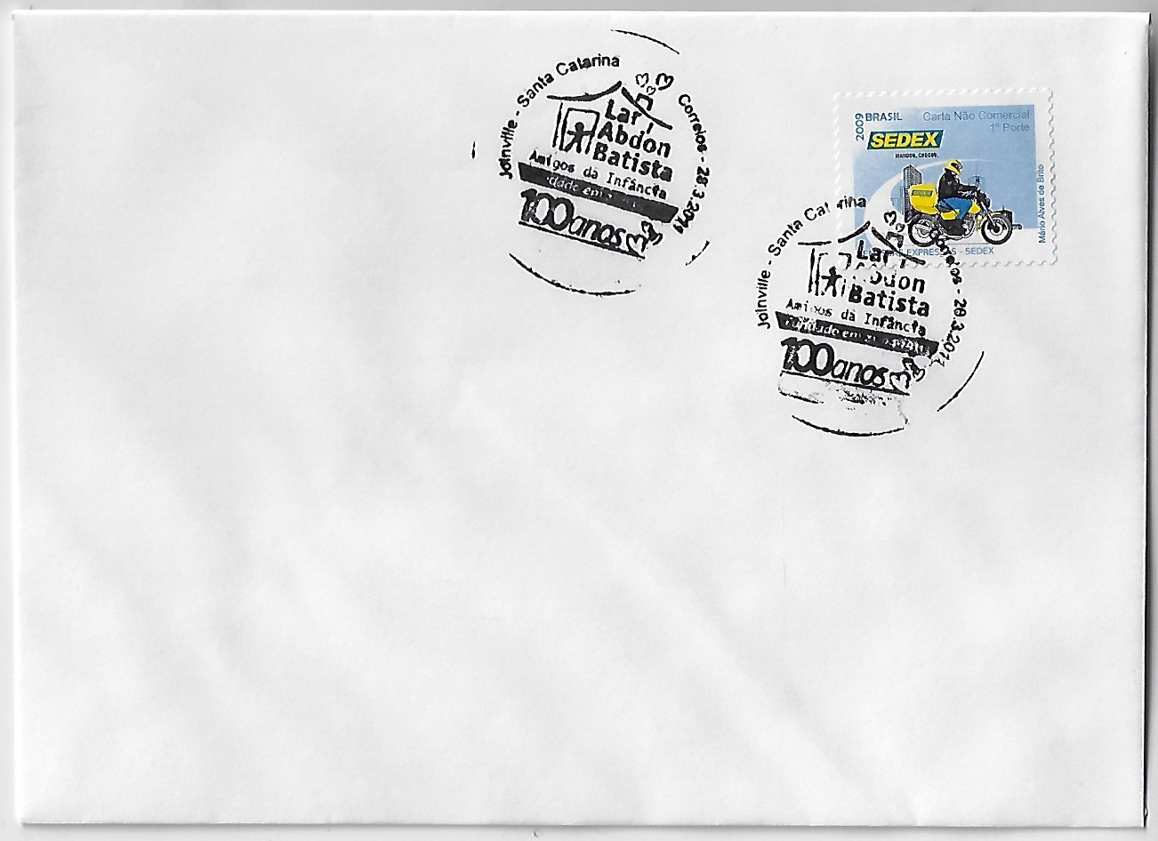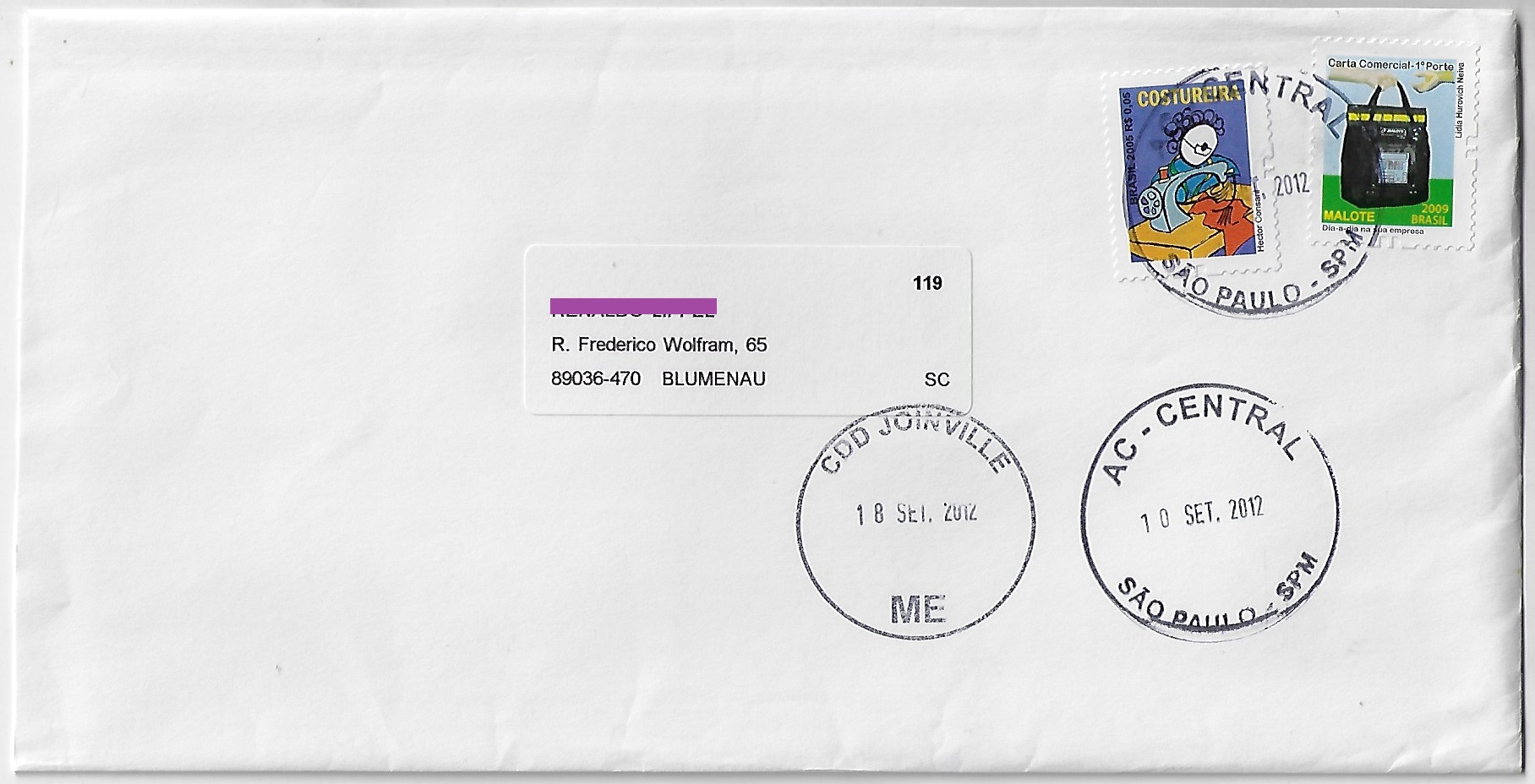 | 80355 | 2012, envelope enviado de São Paulo (10/9) para Blumenau, carimbo de ME - Mal Encaminhado para Joinville (18/9), 2 selos regulares | 10,00 | Foto |