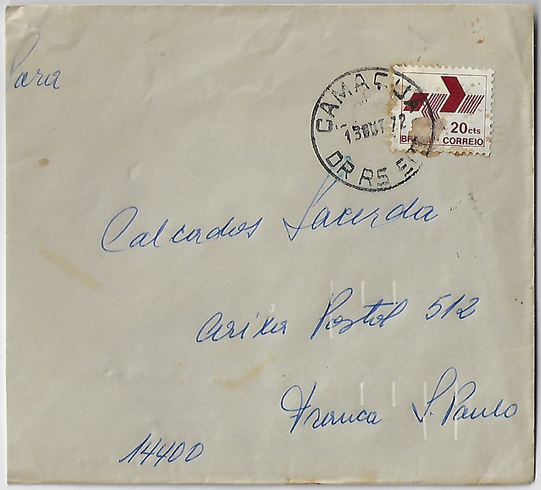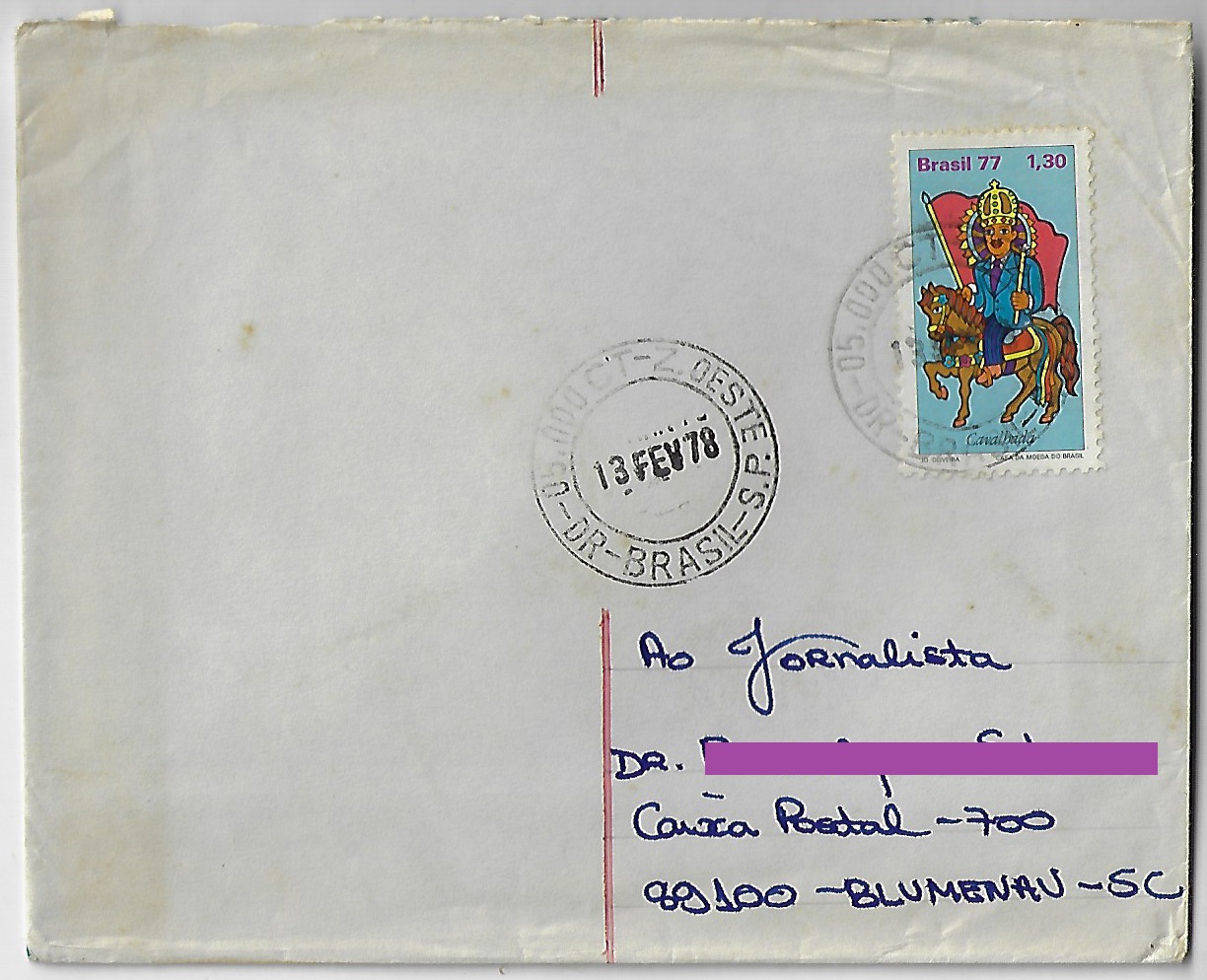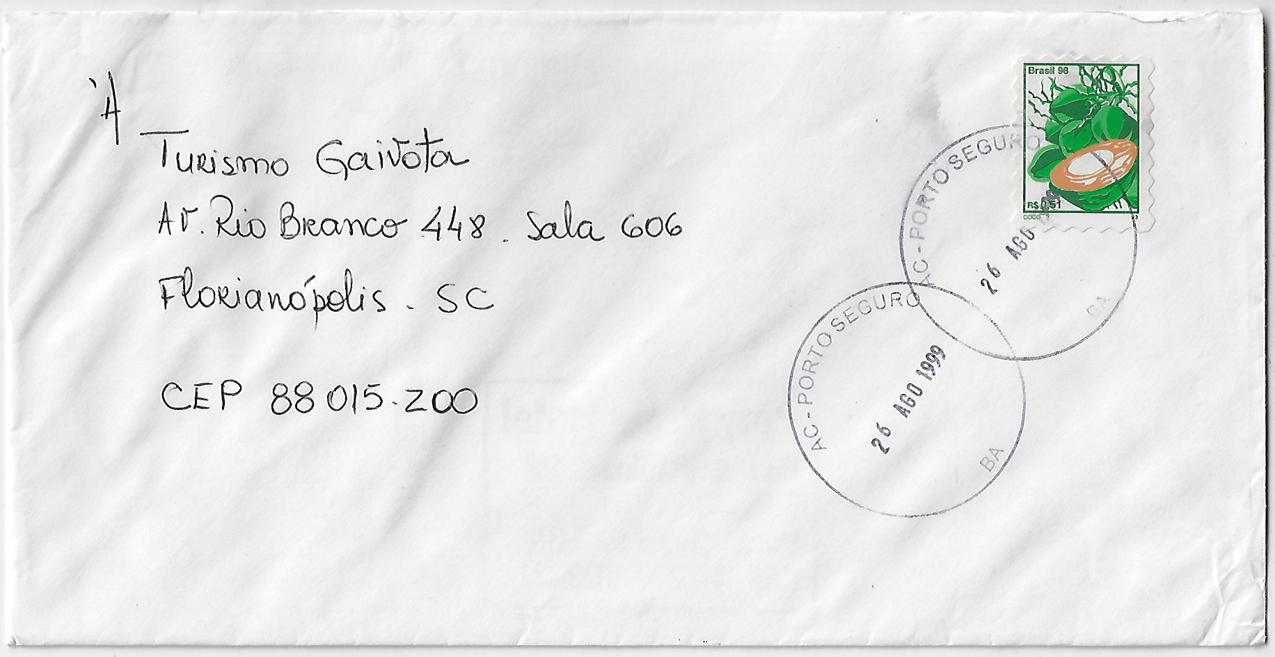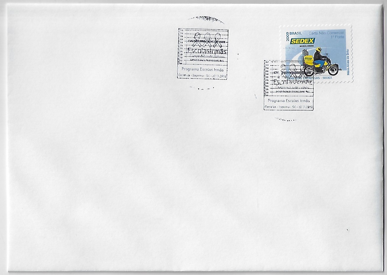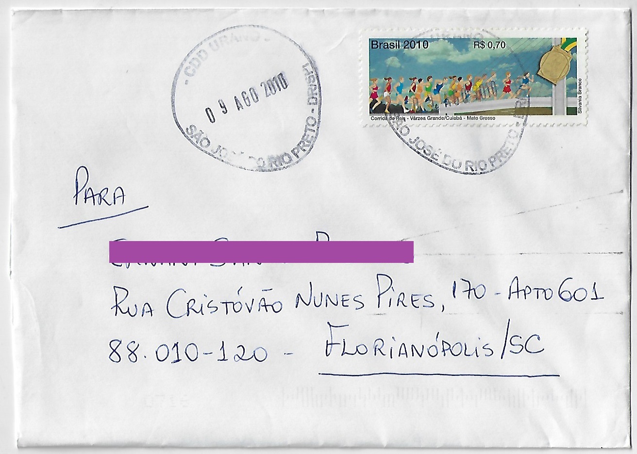 | 80355 | 2012, envelope enviado de São Paulo (10/9) para Blumenau, carimbo de ME - Mal Encaminhado para Joinville (18/9), 2 selos regulares | 10,00 | Foto |