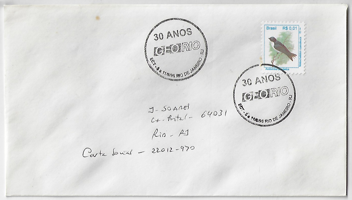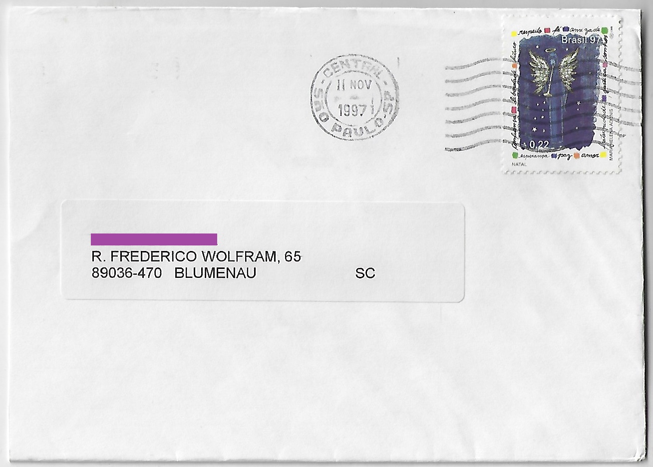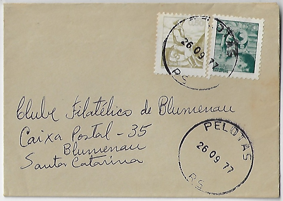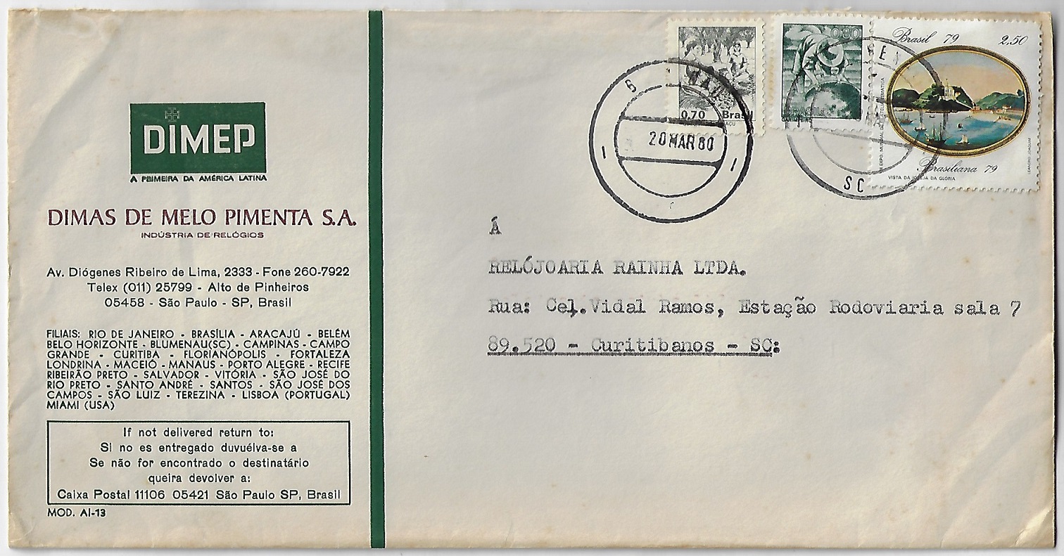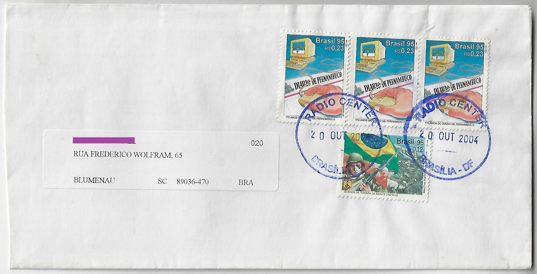 | 80355 | 2012, envelope enviado de São Paulo (10/9) para Blumenau, carimbo de ME - Mal Encaminhado para Joinville (18/9), 2 selos regulares | 10,00 | Foto |