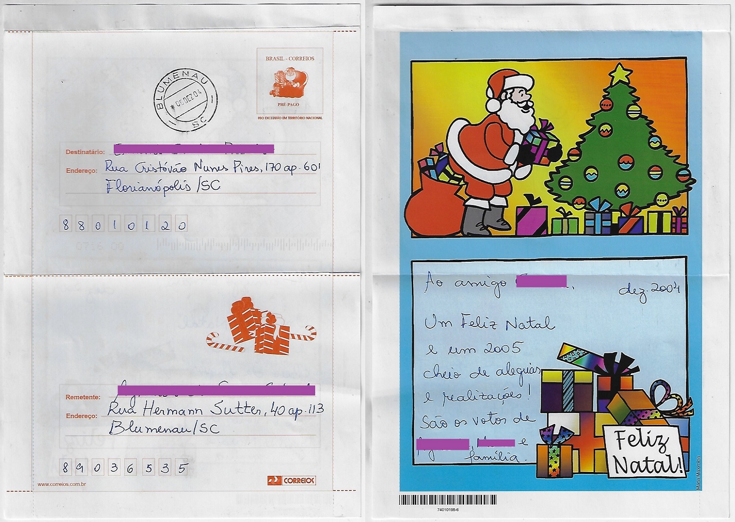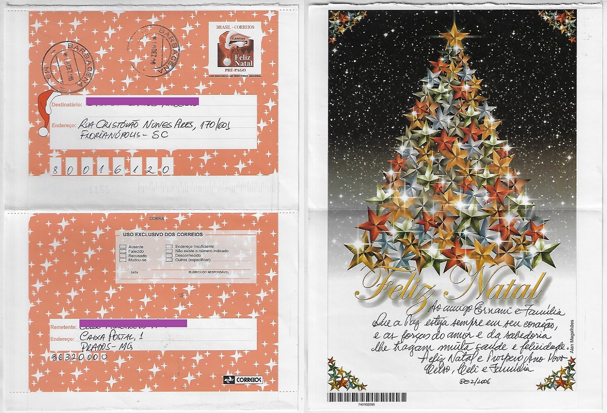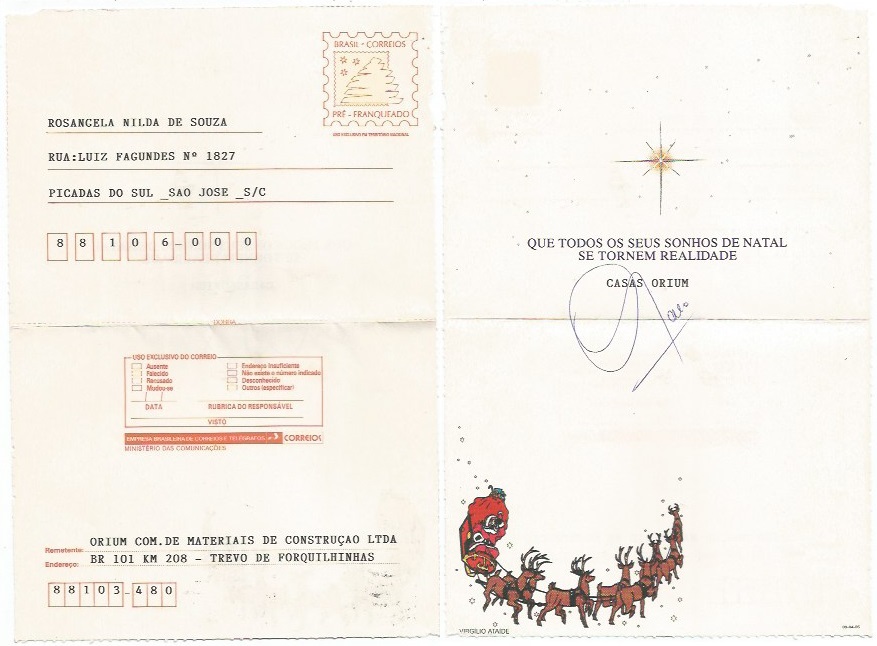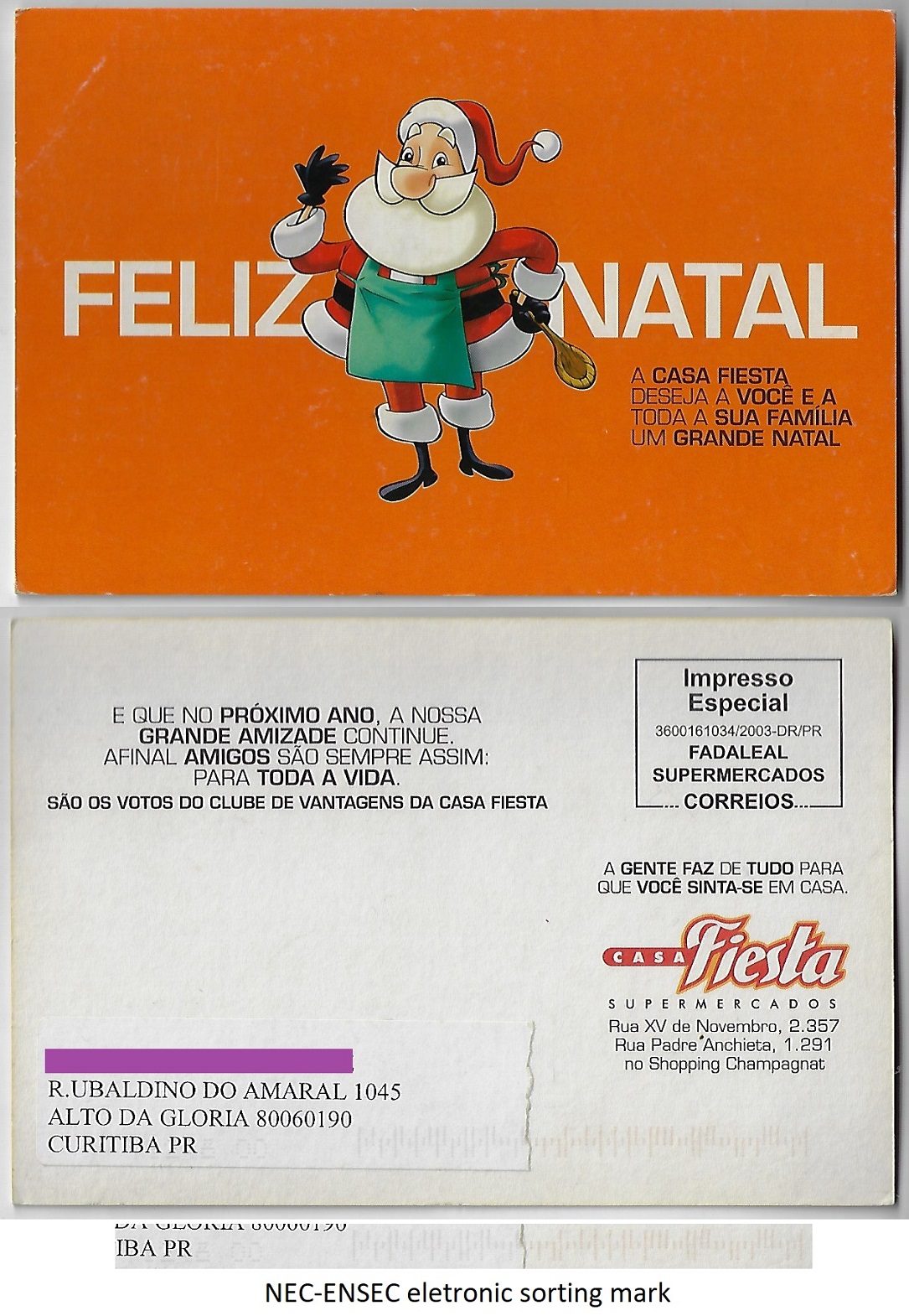 | 44447 | 2017, envelope de Natal, Agência Franqueada Centro Comercial Aluizio Bezerra Sul (26/6)para Florianópolis, porteado com franquia mecânica Mapa do Brasil, tipo H2.2. Pitney Bowes DM300/DM400 digital | 10,00 | Foto |