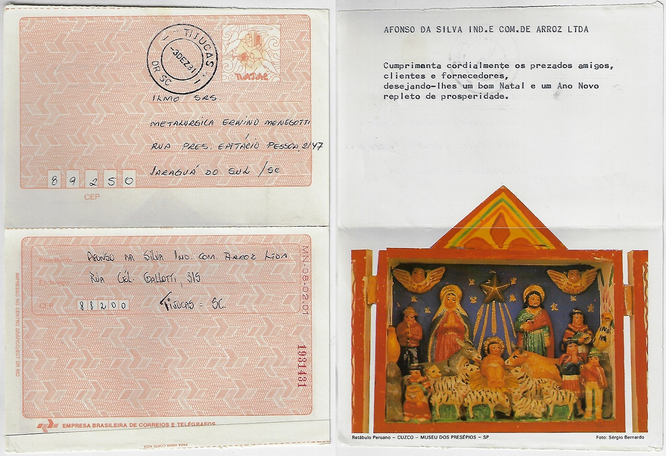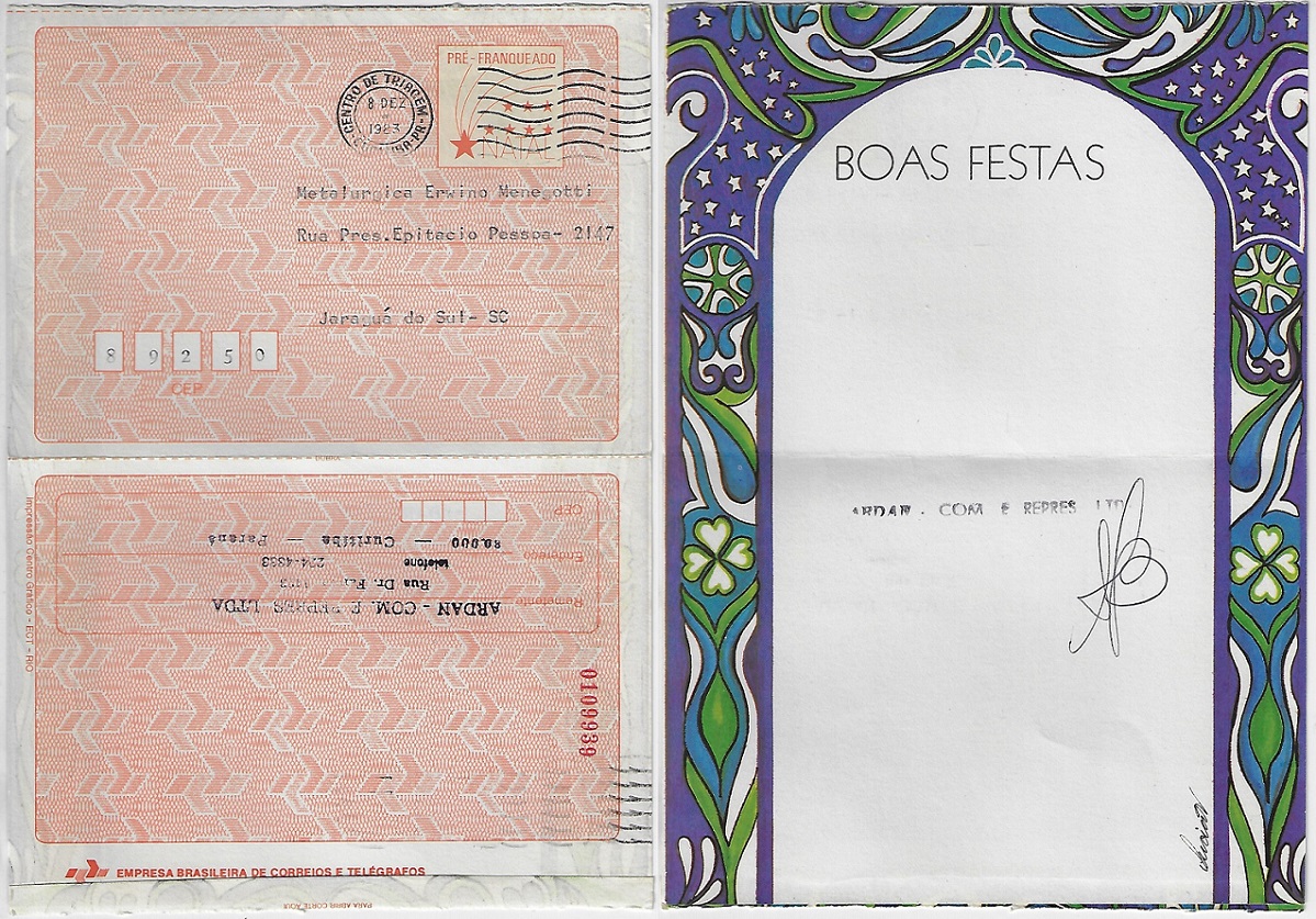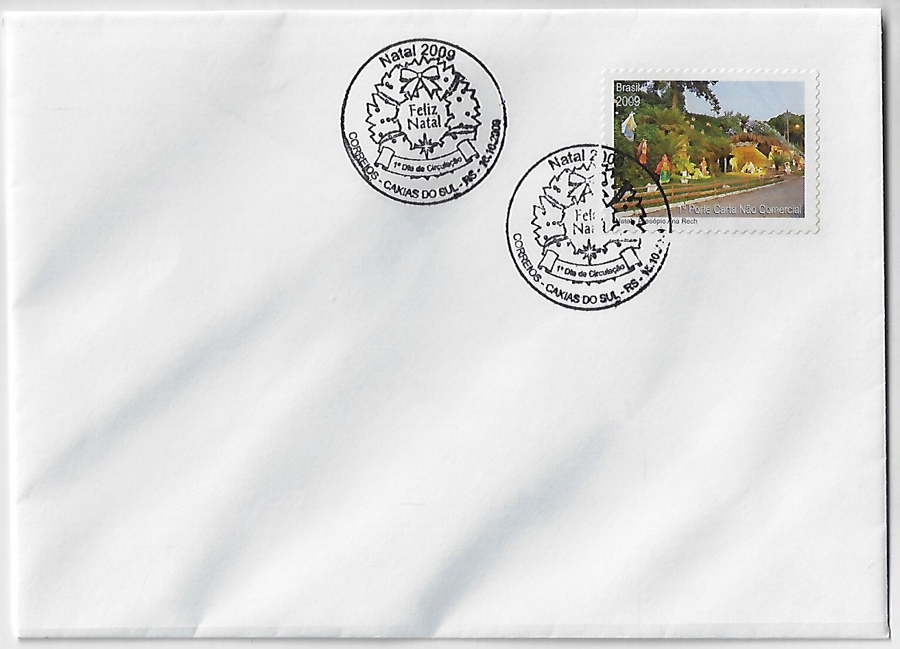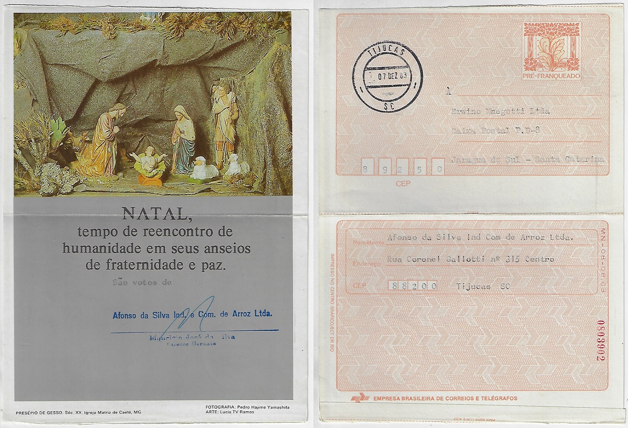 | 44447 | 2017, envelope de Natal, Agência Franqueada Centro Comercial Aluizio Bezerra Sul (26/6)para Florianópolis, porteado com franquia mecânica Mapa do Brasil, tipo H2.2. Pitney Bowes DM300/DM400 digital | 10,00 | Foto |