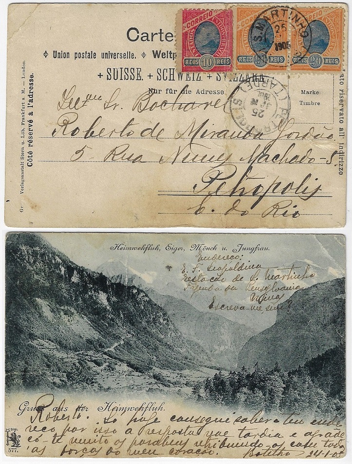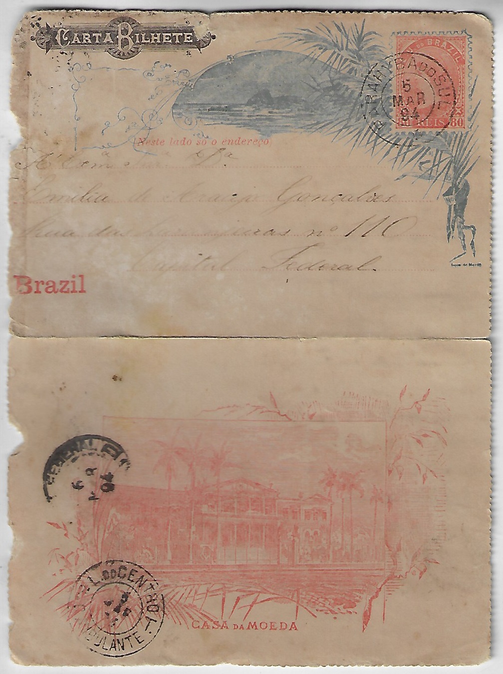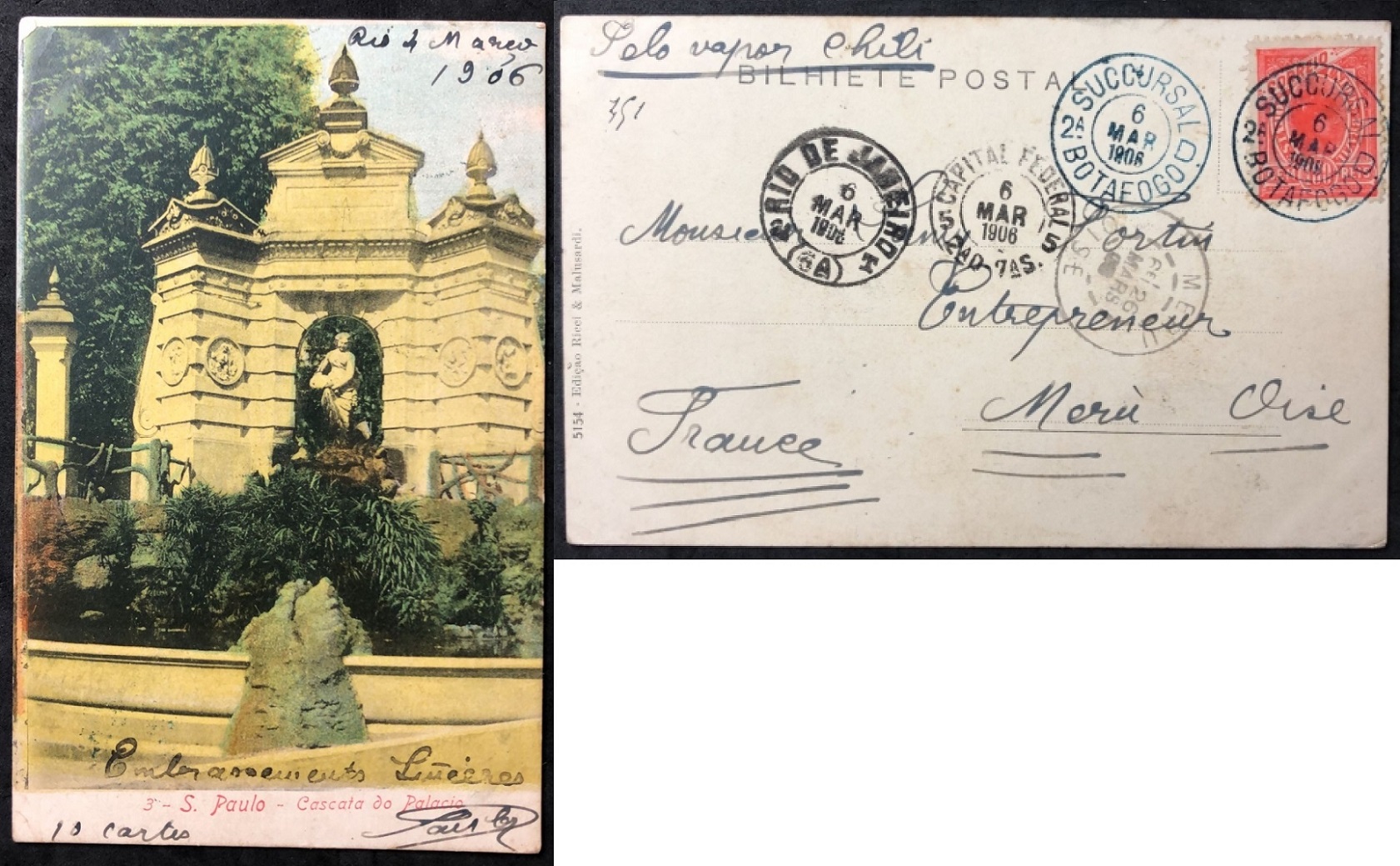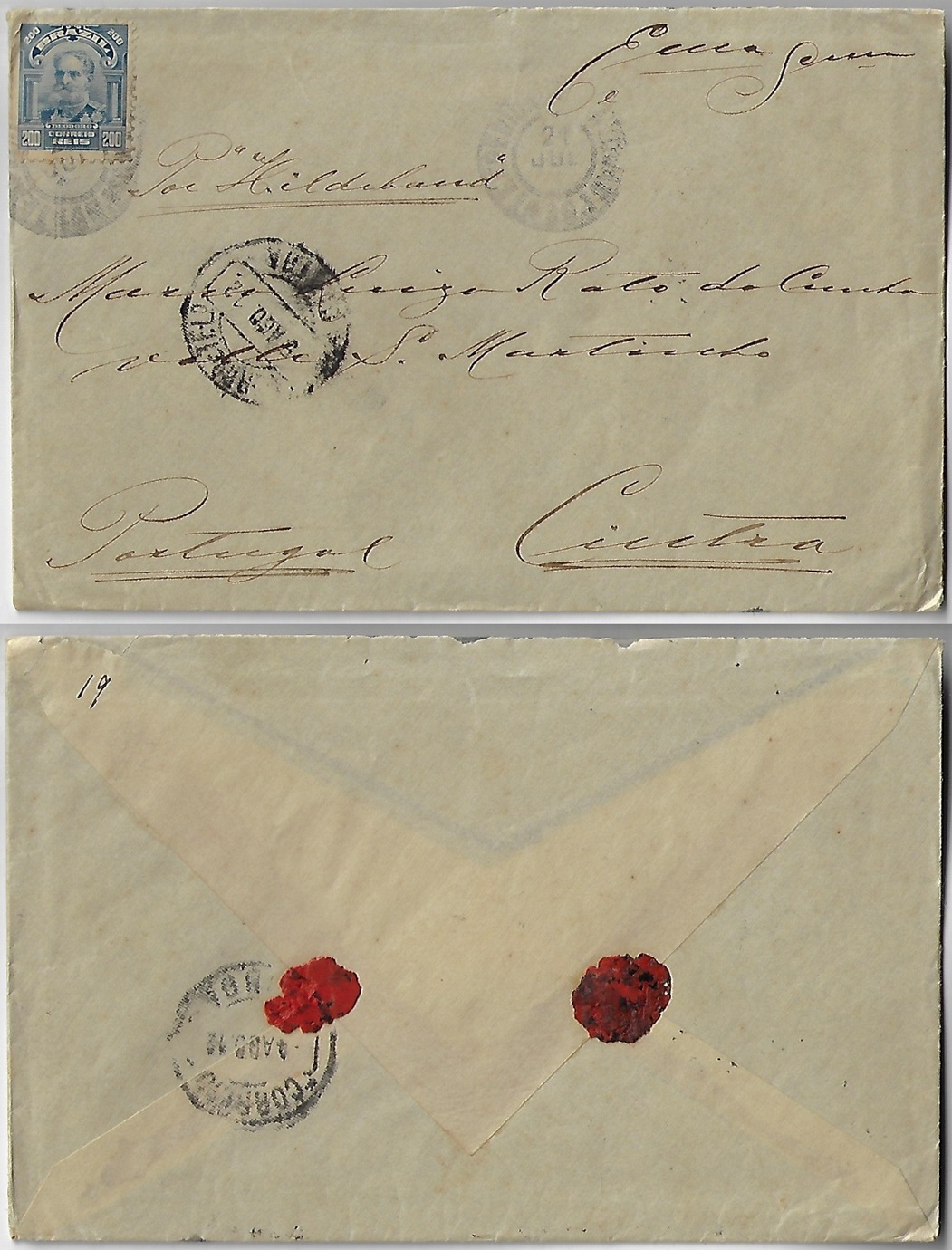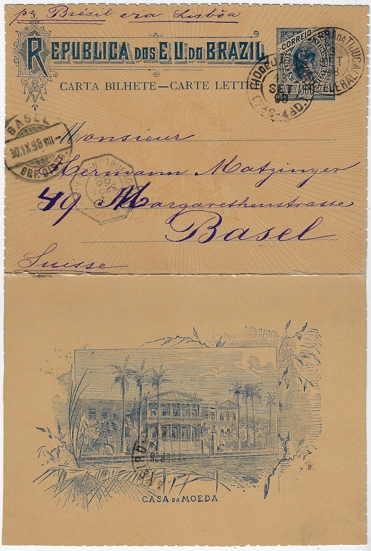 | 80677 | 1898, inteiro postal CB-73 enviado de Raiz da Serra da Tijuca (13/9) via Rio de Janeiro (13/9) para Basel / Suíça (30/9), com carimbo da Compagnie des Messageries Maritimes "Buenos Ayres à Bordeaux 1ª Brigada Linha J Nº 1" (14/9), transportado pelo Brésil | 75,00 | Foto |