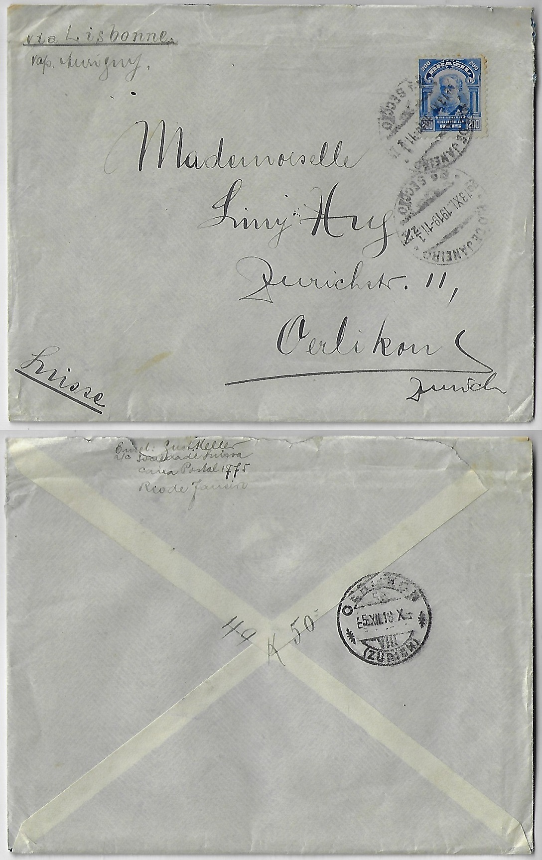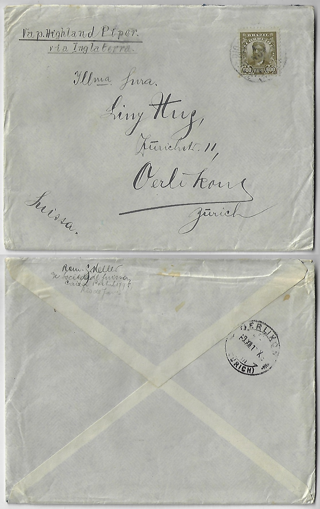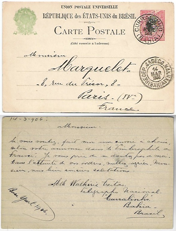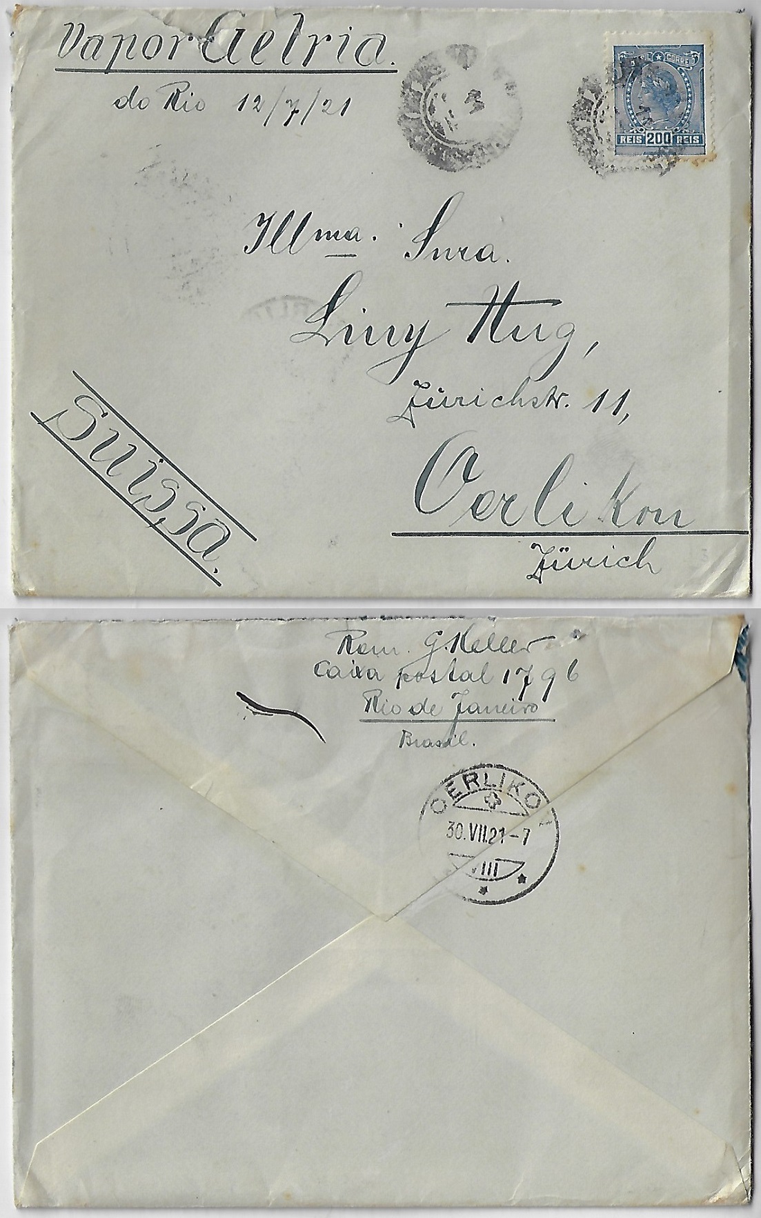 | 80677 | 1898, inteiro postal CB-73 enviado de Raiz da Serra da Tijuca (13/9) via Rio de Janeiro (13/9) para Basel / Suíça (30/9), com carimbo da Compagnie des Messageries Maritimes "Buenos Ayres à Bordeaux 1ª Brigada Linha J Nº 1" (14/9), transportado pelo Brésil | 75,00 | Foto |