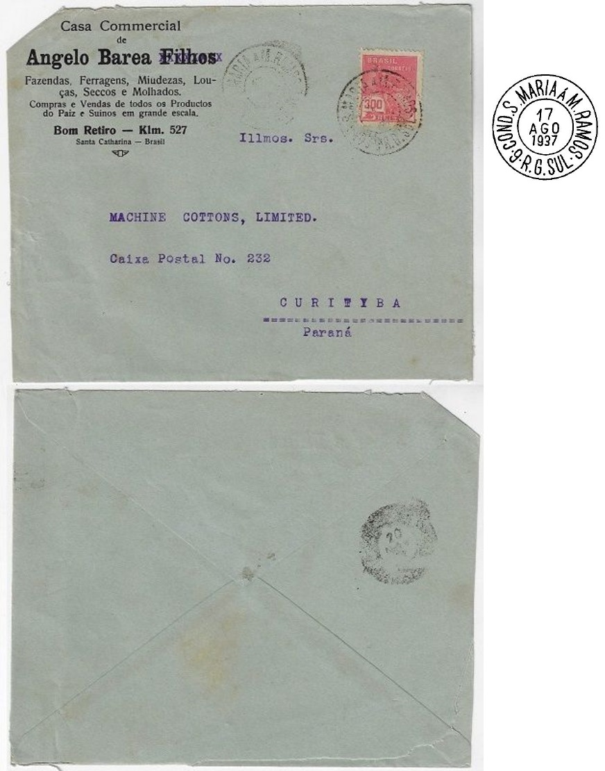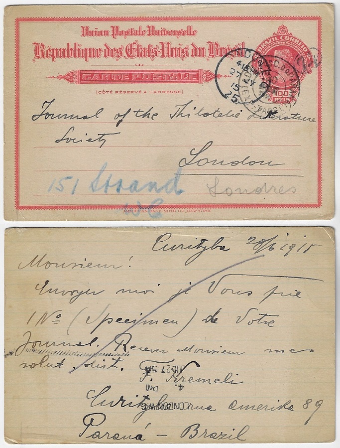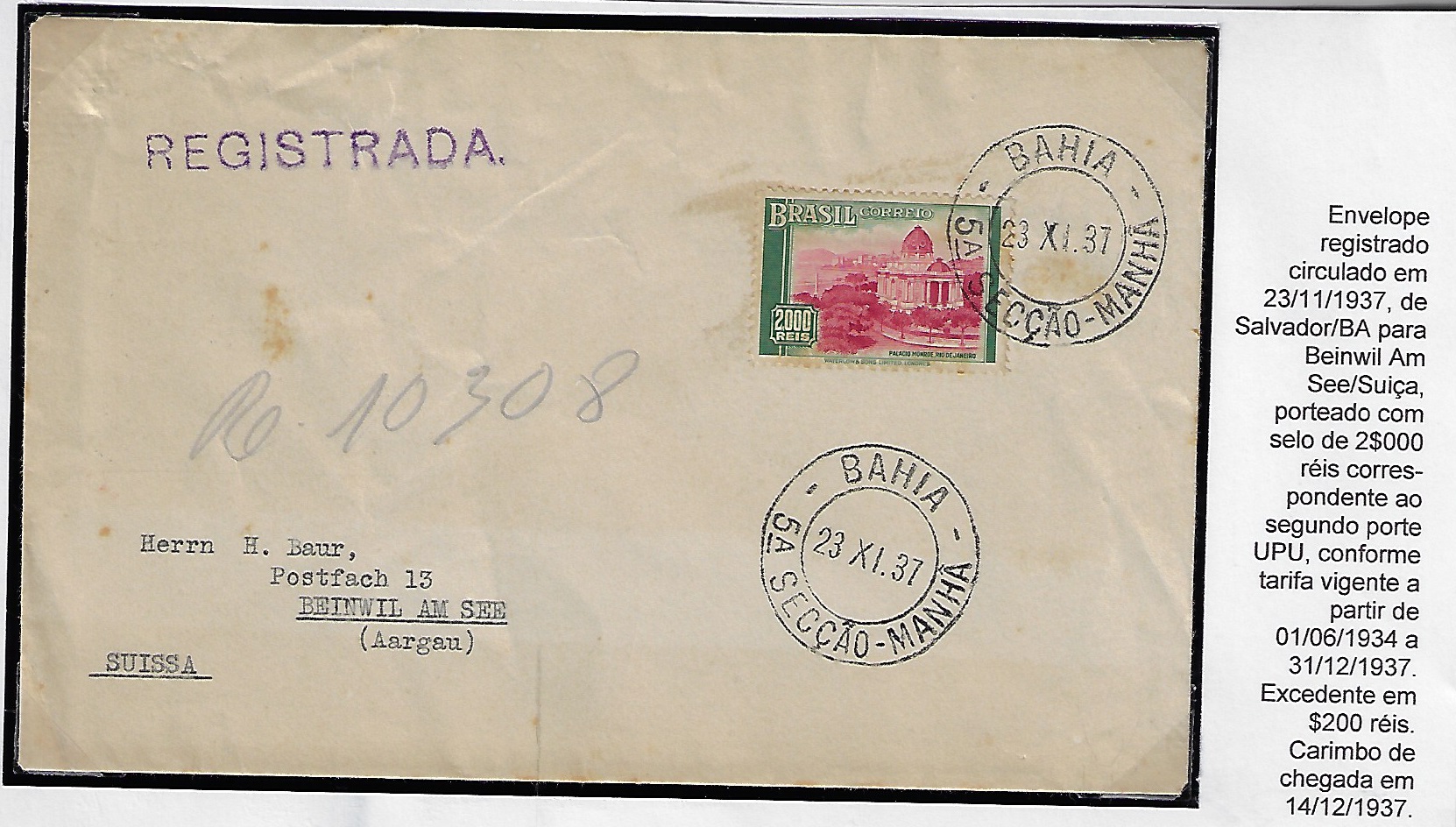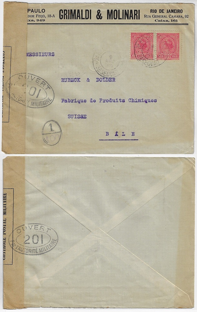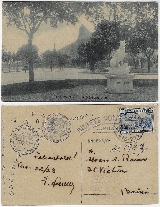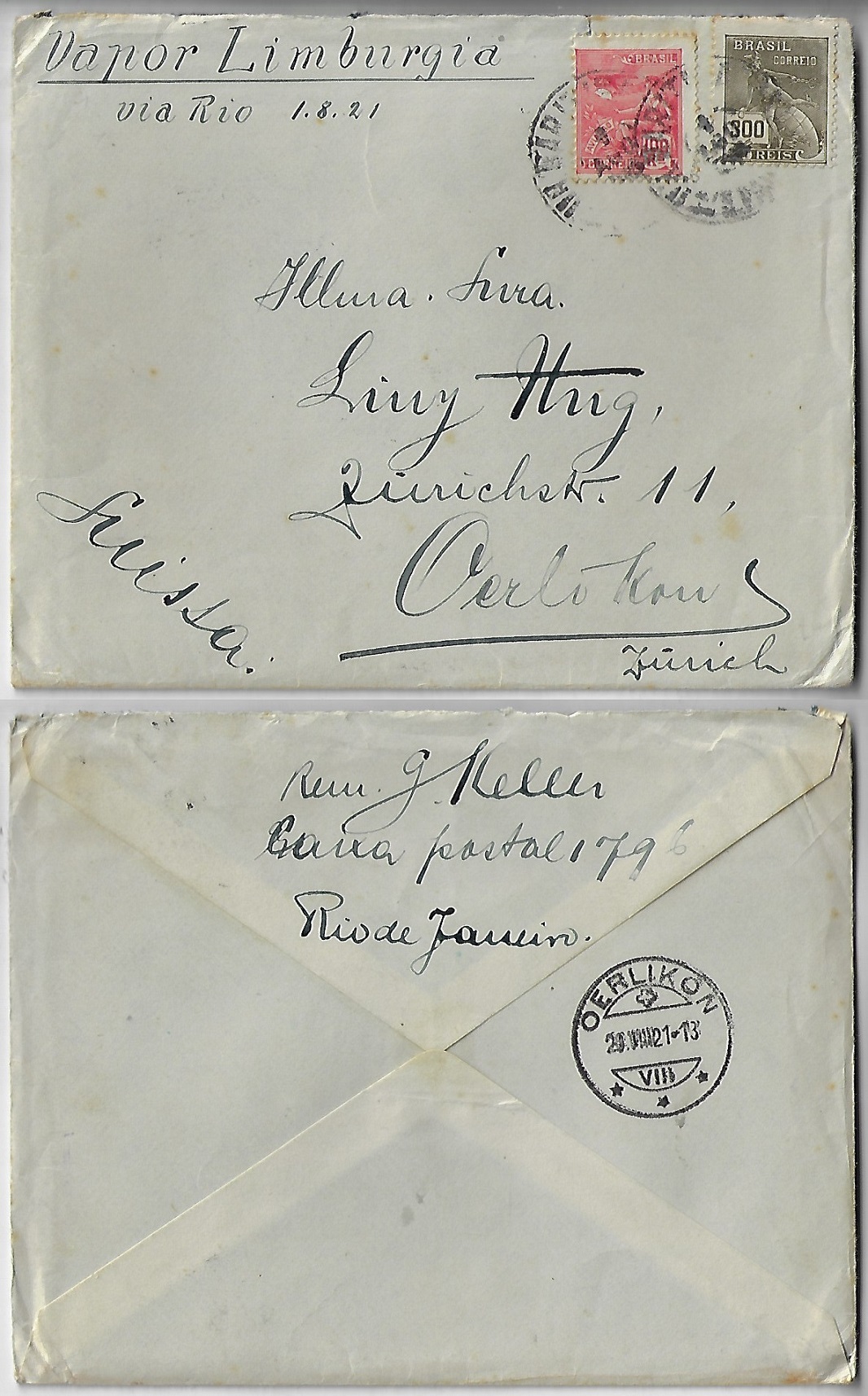 | 80677 | 1898, inteiro postal CB-73 enviado de Raiz da Serra da Tijuca (13/9) via Rio de Janeiro (13/9) para Basel / Suíça (30/9), com carimbo da Compagnie des Messageries Maritimes "Buenos Ayres à Bordeaux 1ª Brigada Linha J Nº 1" (14/9), transportado pelo Brésil | 75,00 | Foto |