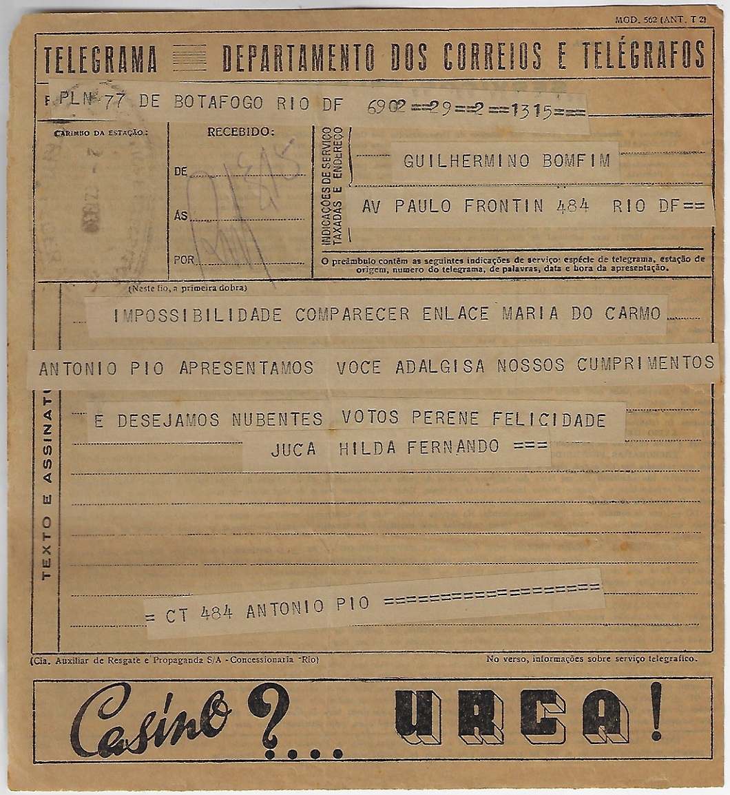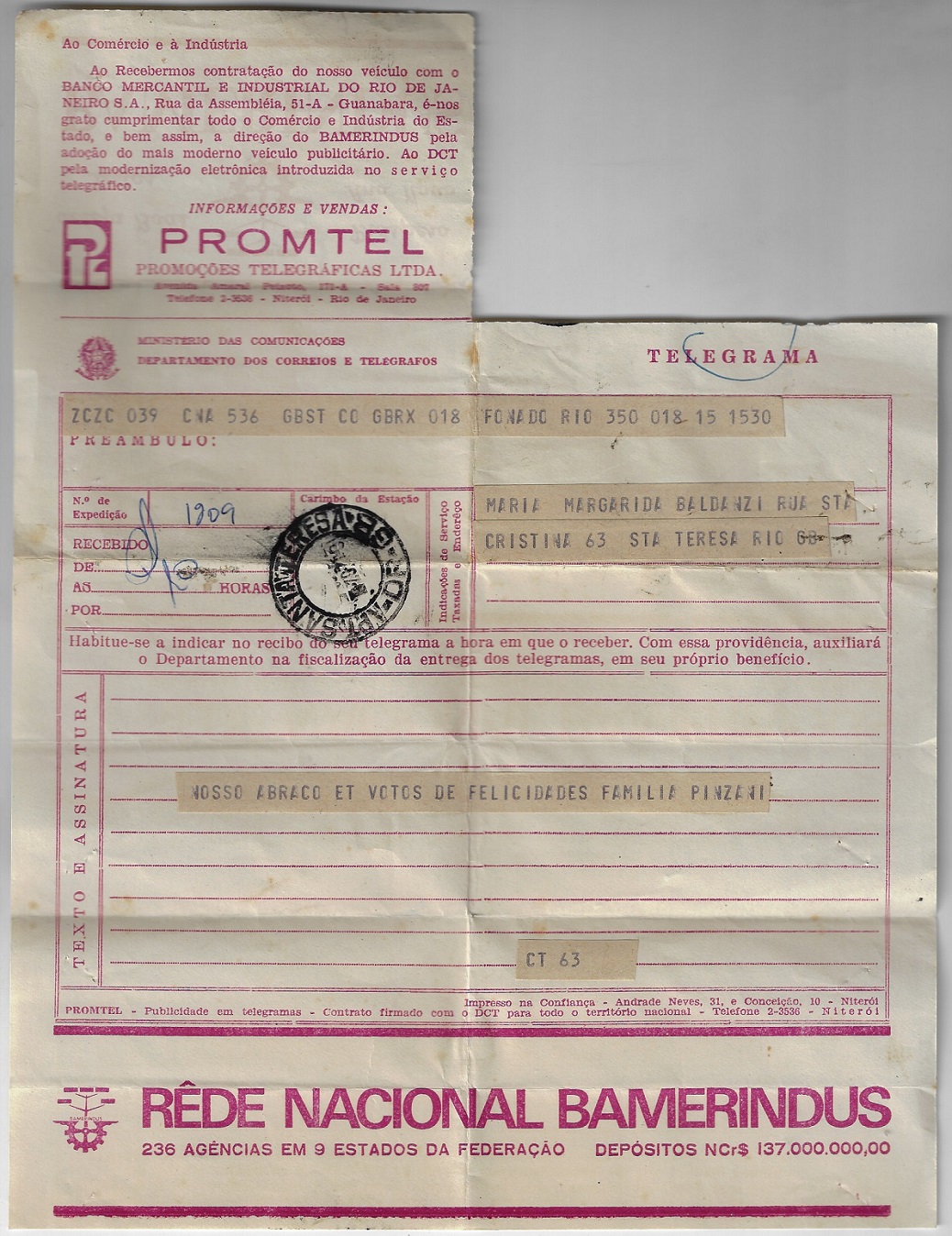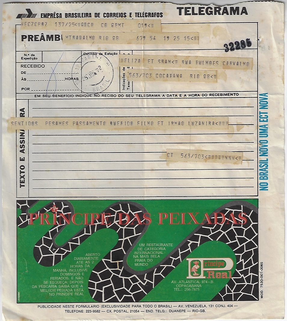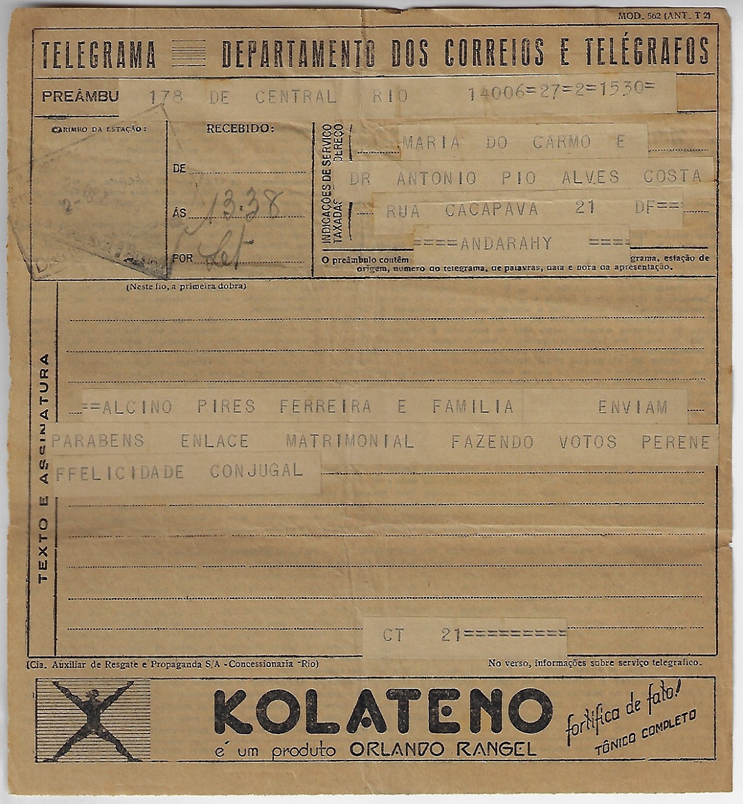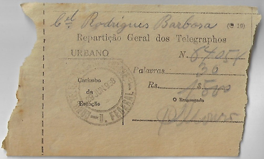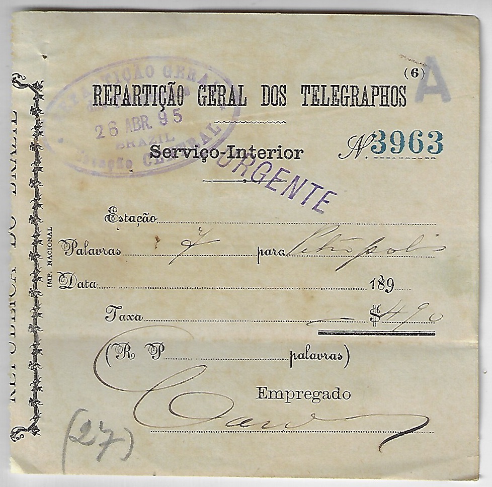 | 55357 | 1895, comprovante de telegrama expedido pela Repartição Geral dos Telégrafos do Rio de Janeiro (26/4) para Petrópolis | 30,00 | Foto |