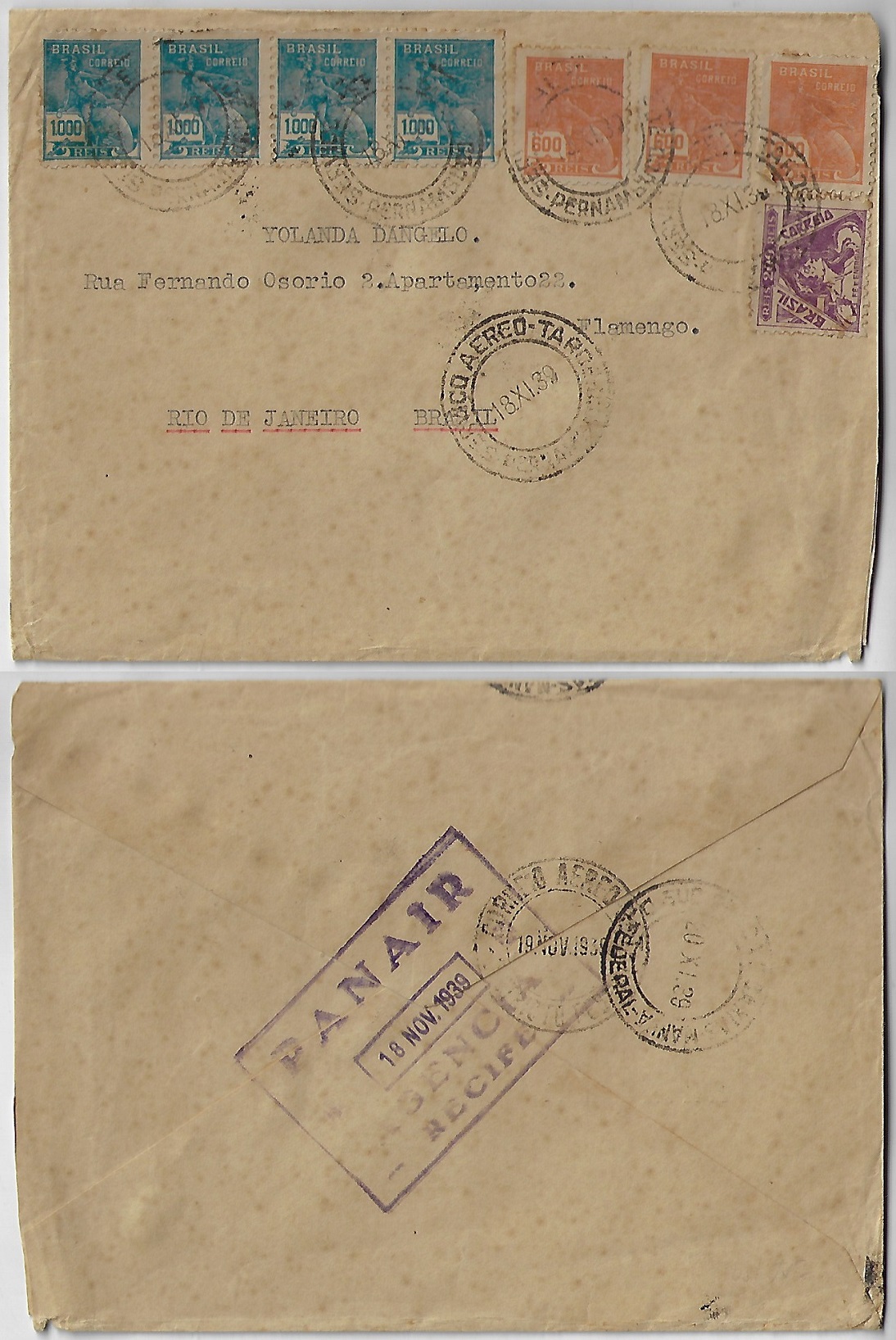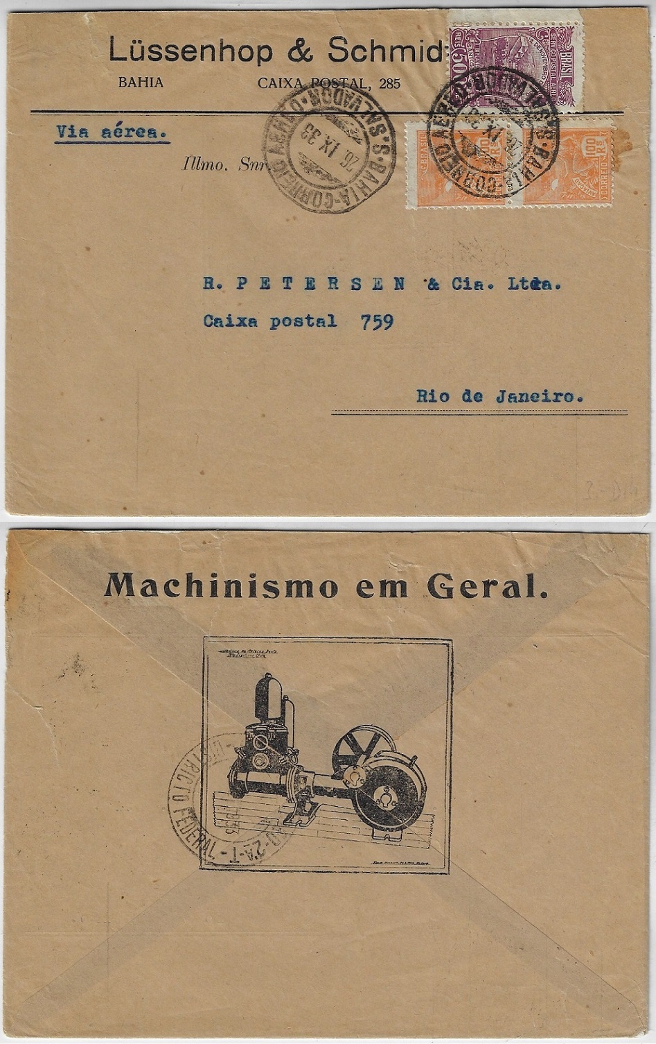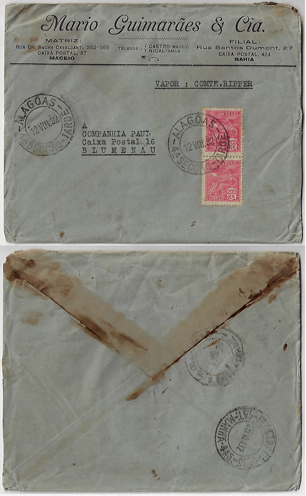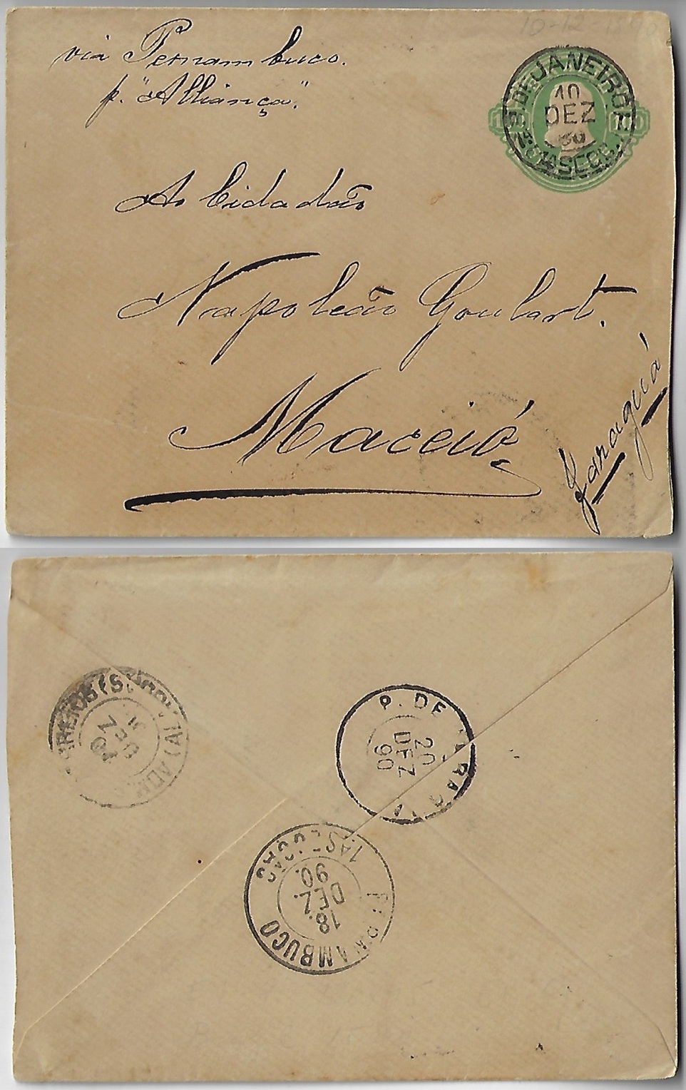 | 55849 | 1890, inteiro postal EN-9 enviado do Rio de Janeiro (10/12), via Pernambuco (18/12), via Porto de Jaraguá (20/12), para Maceió (20/12), pelo vapor Alliança da U.S. & Brazil Mail Steamship Company | 75,00 | Foto |