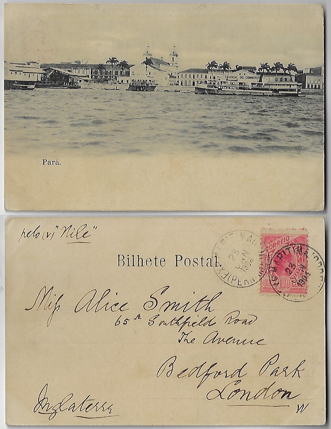 | 58931 | 1904, cartão postal com foto preto e branco de vista de Belém a partir do Rio Amazonas, enviado de Recife (Expedição Marítima 23/1) para Londres / Grã-Bretanha, porteado com selo Madrugada 100 Réis, pelo vapor Nile, da Royal Mail Steam Packet Co Ltd | 75,00 | Foto |