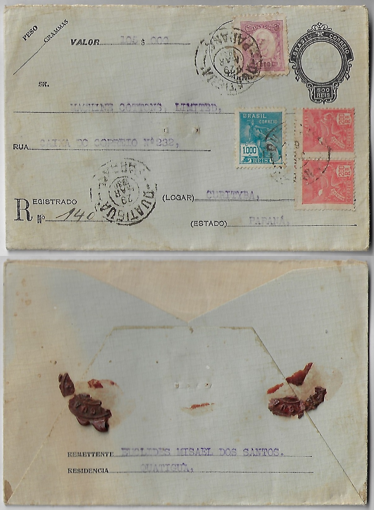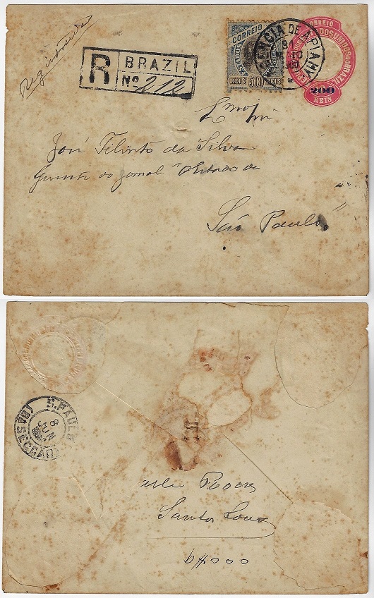 | 69603 | 1900, Inteiro postal EN-53 registrado de Apiahy (toponímia = rio dos índios) / SP (31/5) para São Paulo (8/6), selo complementar Madrugada 500 Réis, pedaços faltando no verso (120 UF) | 84,33 | Foto |