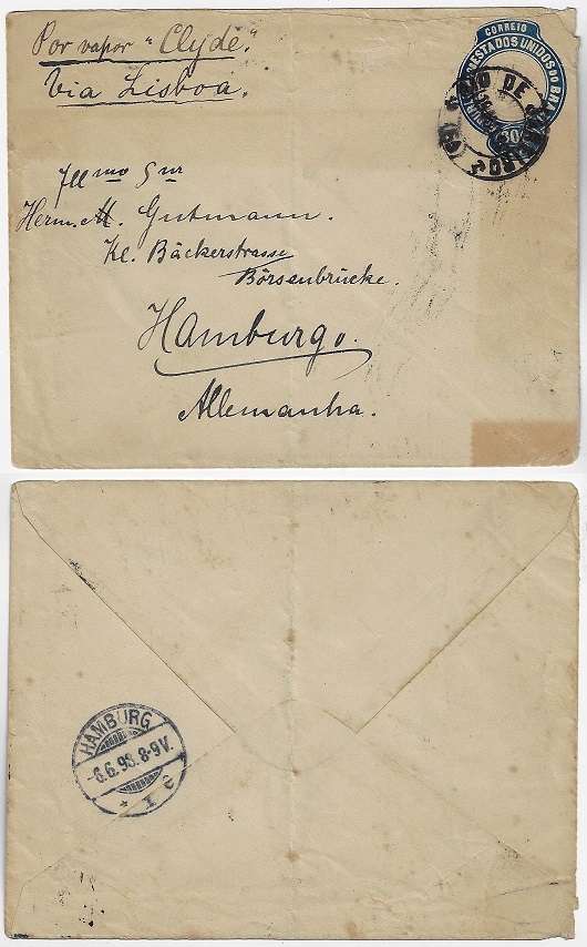 | 60901 | 1898, Inteiro Postal EN-49 enviado do Rio de Janeiro (19/5) para Hamburgo / Alemanha (6/6), indicação manuscrita pelo vapor Clyde, da Royal Mail Steam Packet Company | 75,00 | Foto |