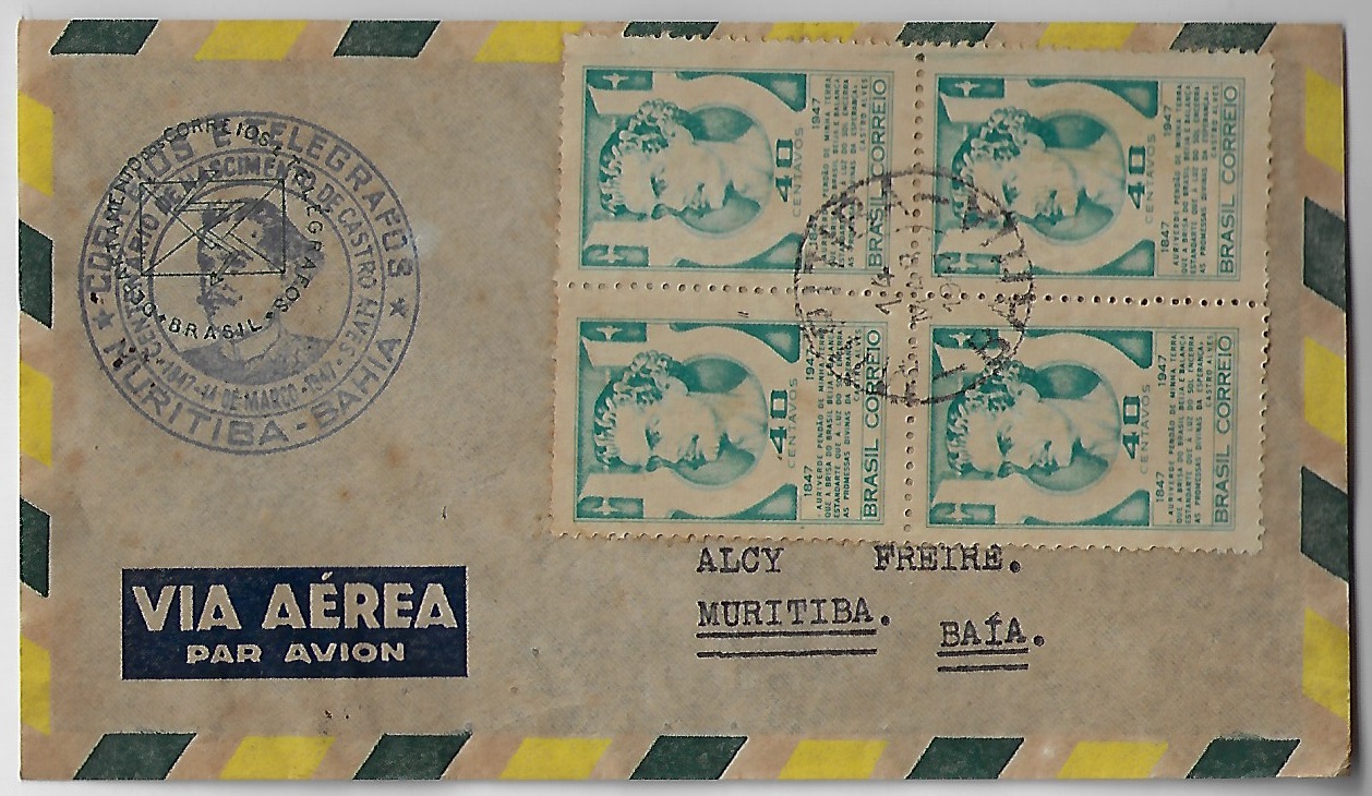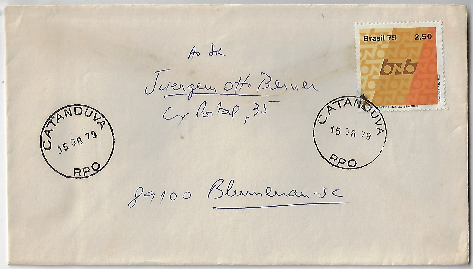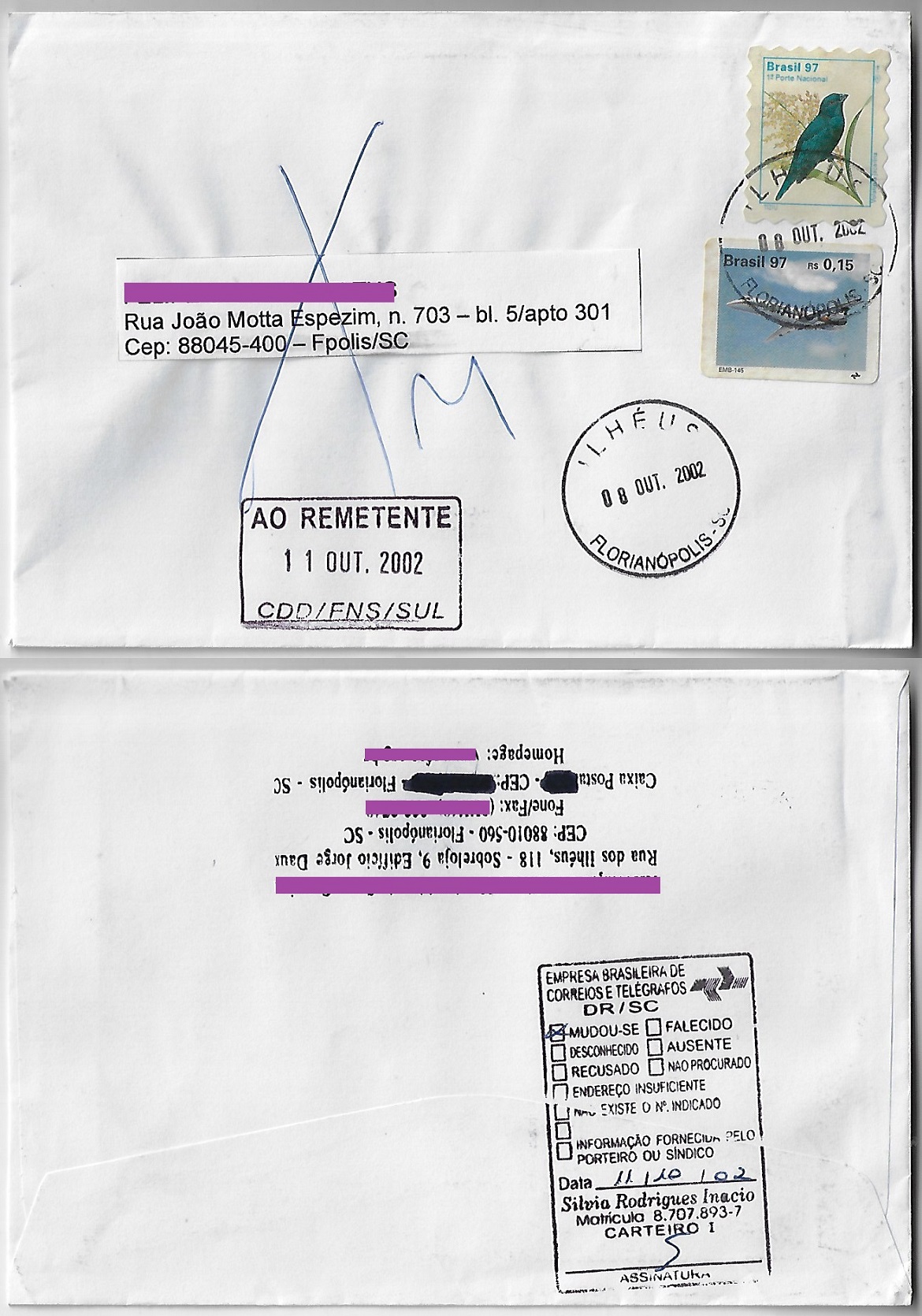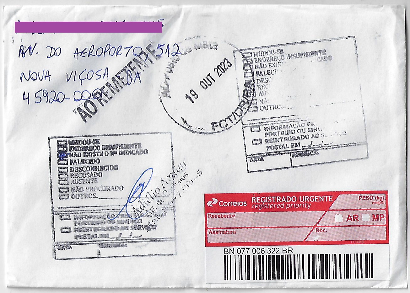 | 82046 | 2023, envelope registrado enviado de Biguaçu para Nova Viçosa, agência Posto da Mata (19/10), retornado ao remetente, carimbos de serviço | 10,00 | Foto |
