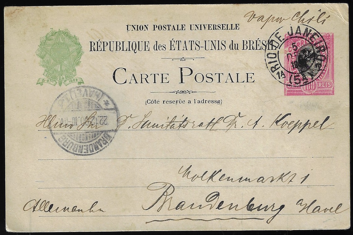 | 63684 | 1900, inteiro postal BP-57B enviado do Rio de Janeiro (5/12) para Brandenburg an der Havel / Alemanha (22/12), variante sem o segundo acento em "réserve", transportada pelo Vapor Chili, da Compagnie des Messageries Maritimes (80 UF) | 75,00 | Foto |
