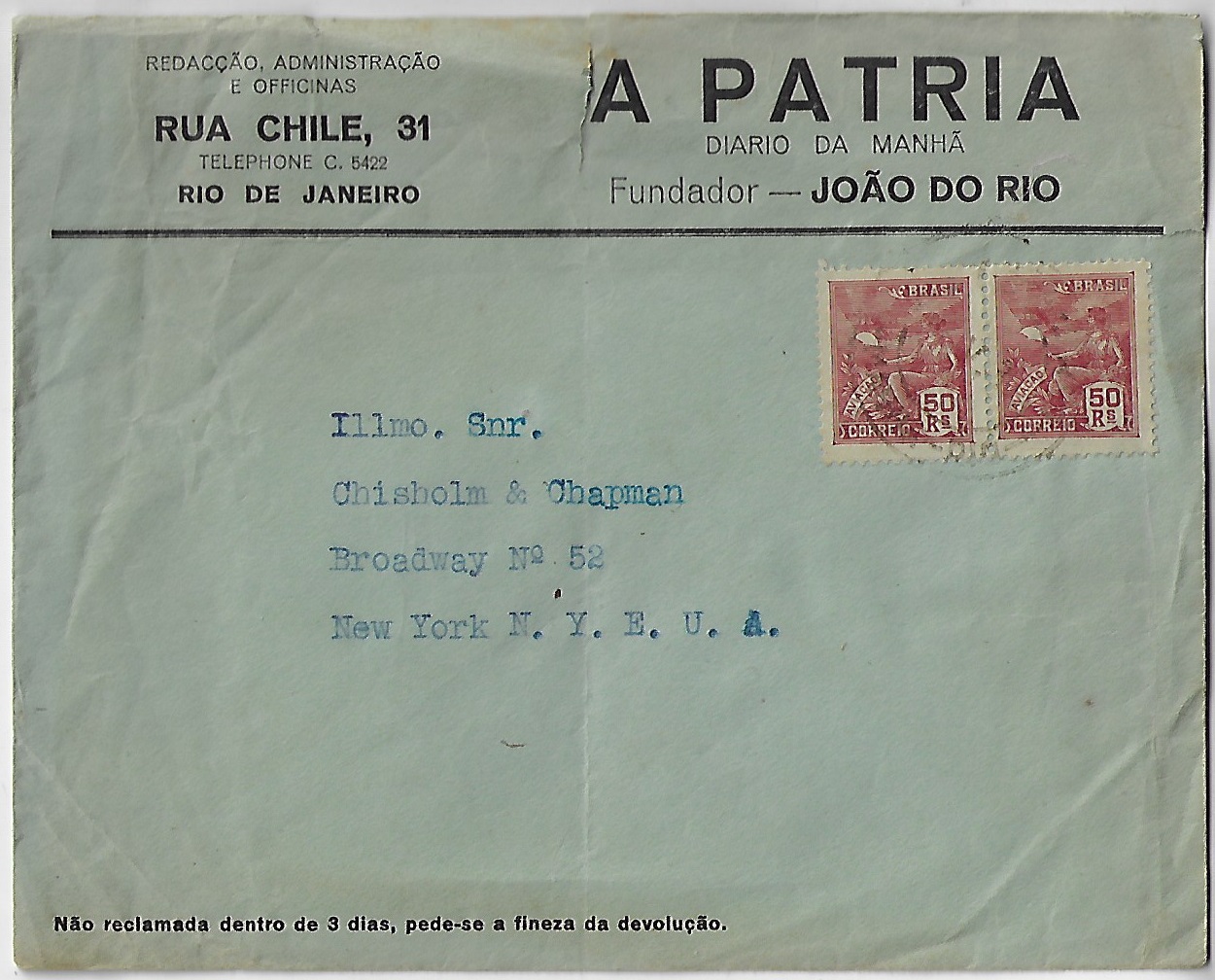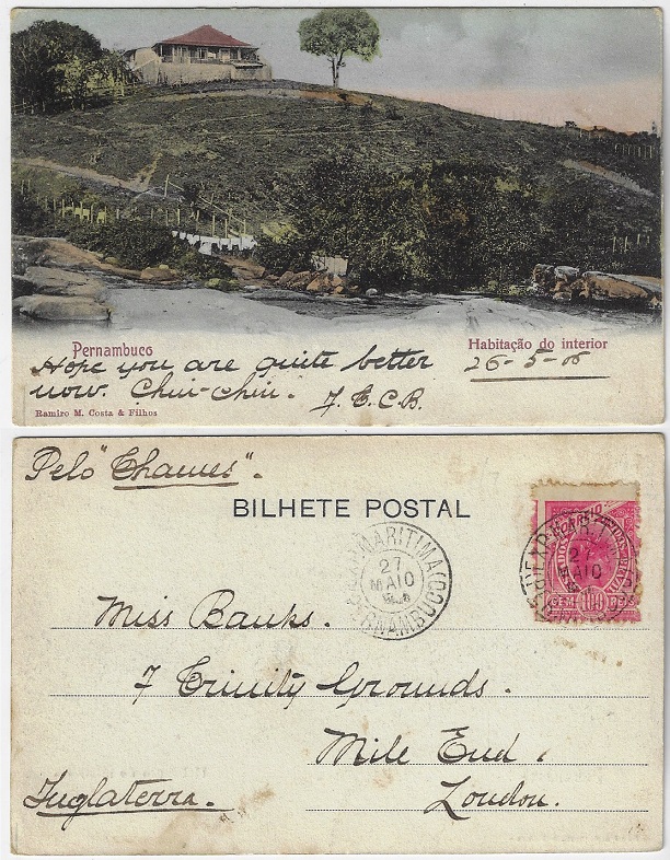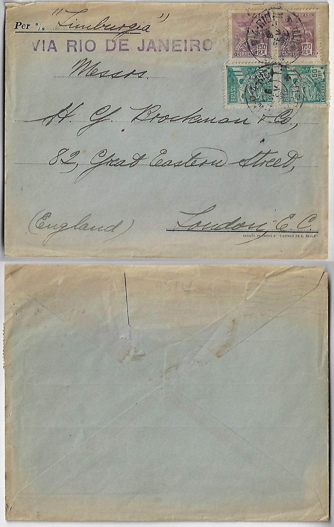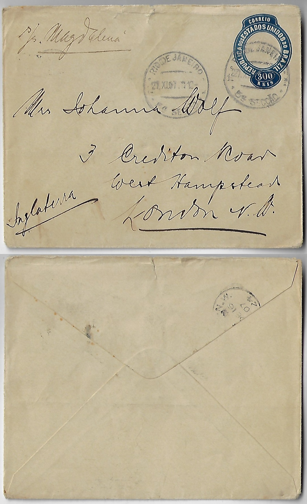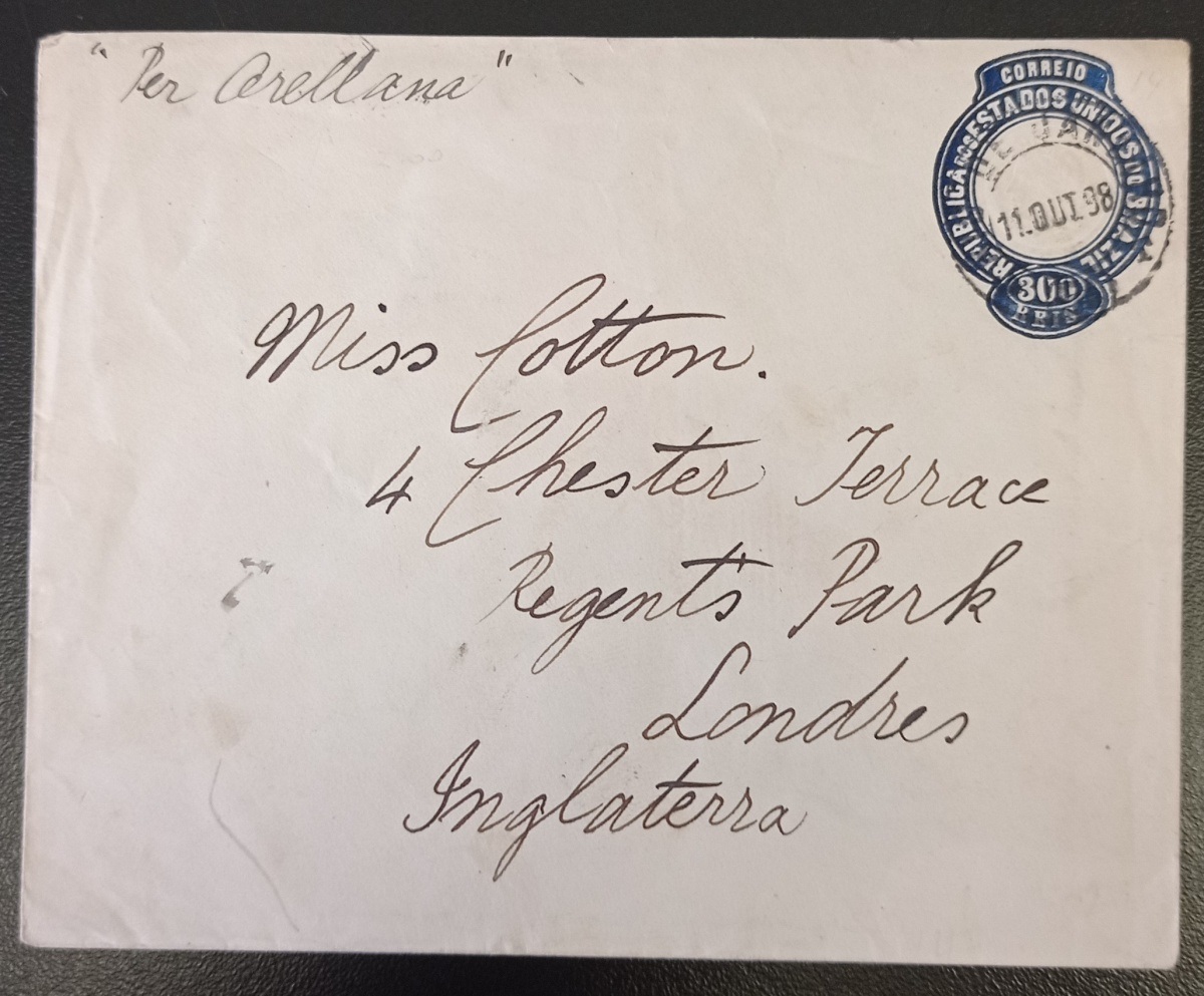 | 69323 | 1898, inteiro postal EN-49 enviado do Rio de Janeiro (11/10), para Londres / Grã-Bretanha (31/10), indicação manuscrita "pelo Orellana" vapor da Pacific Steam Navigation Company vindo de Montevidéu | 75,00 | Foto |