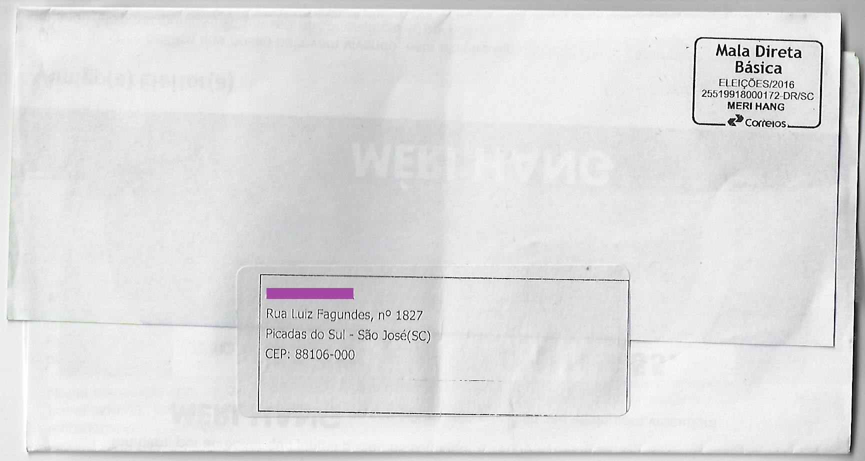 | 66799 | 2016, folder postada como "Mala Direta Básica - Eleições", da candidata a vereadora Meri Hang | 10,00 | Foto |
