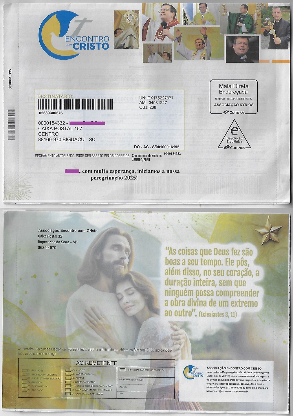 | 66803 | 2025, peça postada como "Mala Direta Endereçada", da Associação Kyrios Encontro com Cristo | 10,00 | Foto |