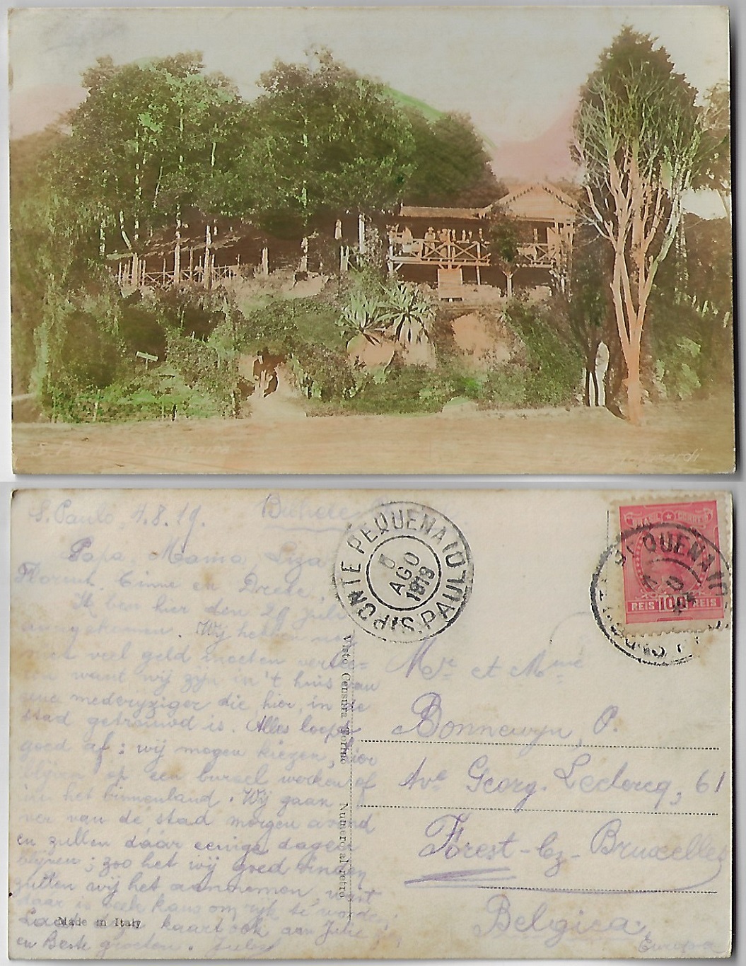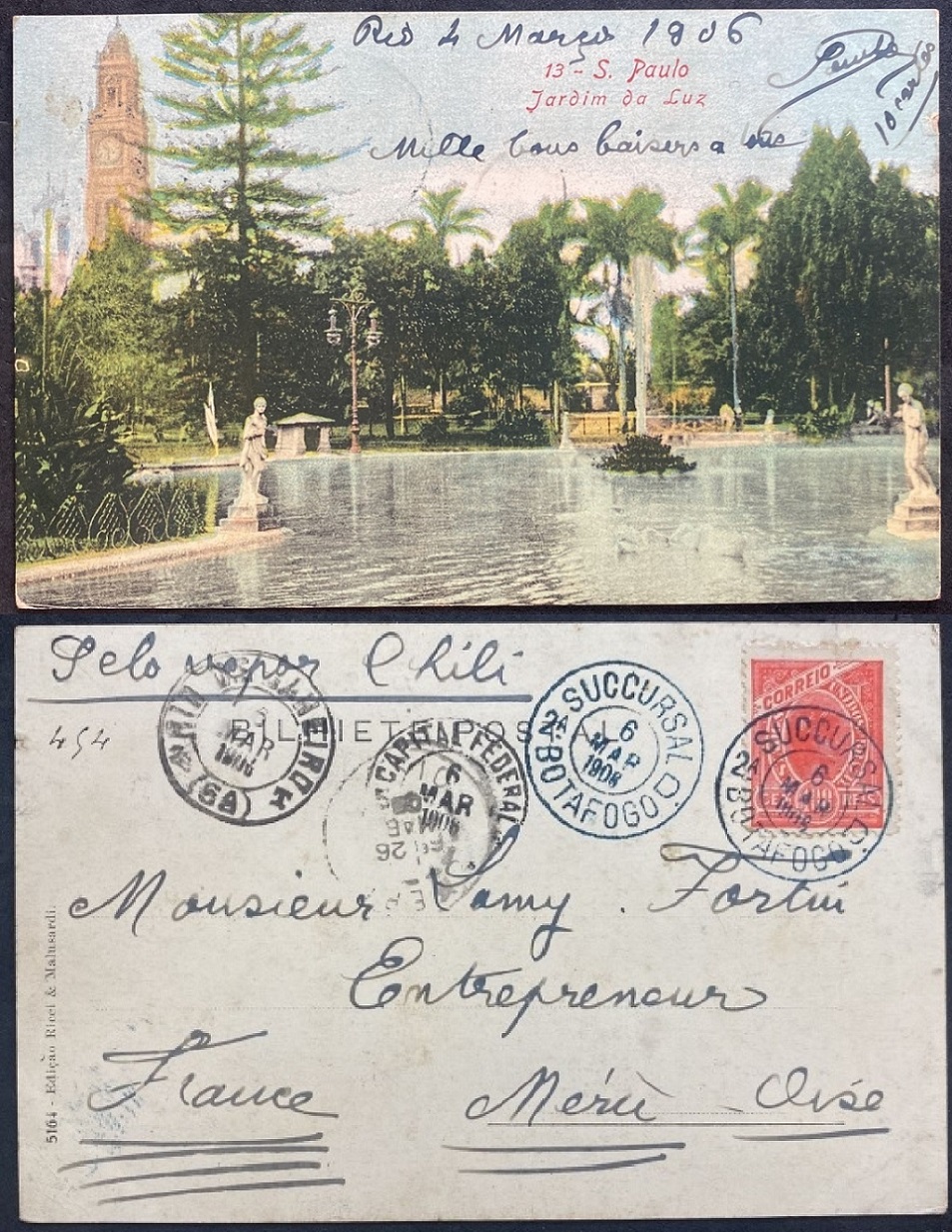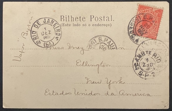 | 69237 | 1902, cartão postal com foto colorizada do Jardim Público, em São Paulo, Editor Rosenhain e Meyer, enviado de São Paulo (30/11) para New York / EUA, passagem pelo Rio de Janeiro (1/12), transportada pelo Vapor Byron, da Lamport & Holts | 75,00 | Foto |