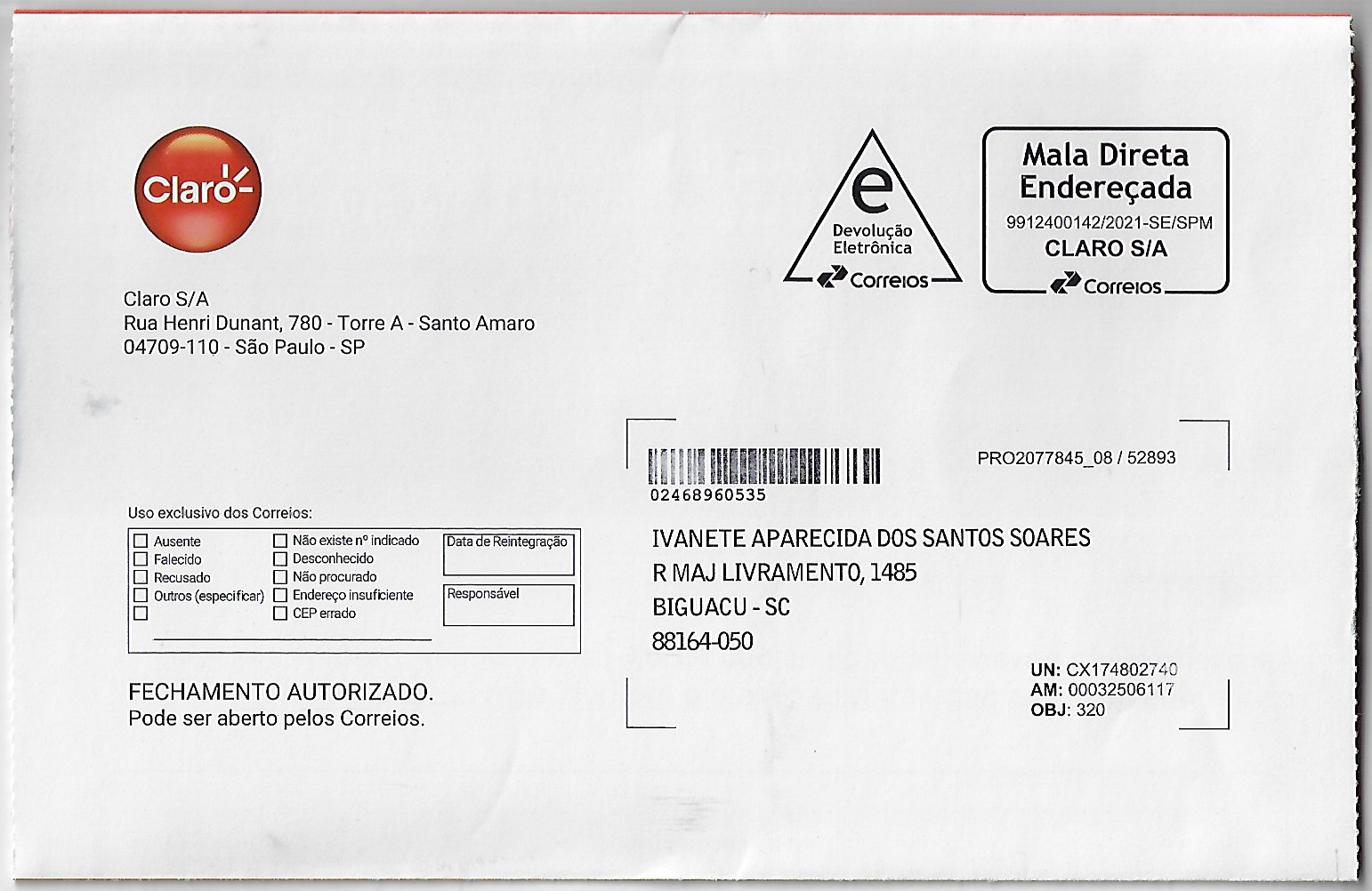 | 69522 | 2021, folder postado como "Mala Direta Endereçada", da Claro SA, concessionária de telefonia móvel, telefonia fixa, banda larga e TV por assinatura | 10,00 | Foto |