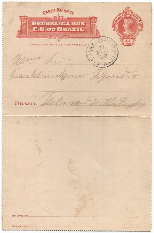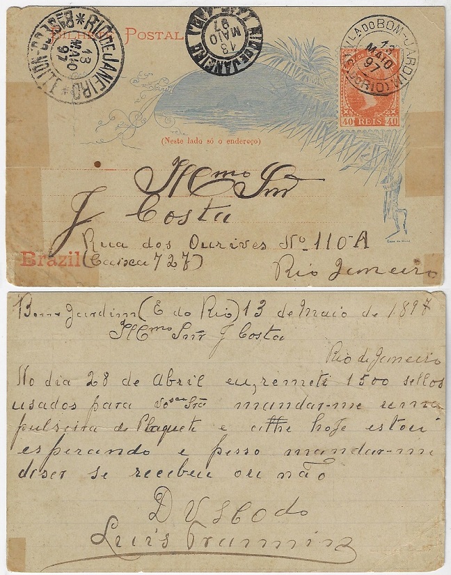 | 69634 | 1897, Inteiro Postal BP-38l, de Vila do Bom-Jardim / RJ (13/5) para Rio de Janeiro (13/5), reforços no papel feitos com charneira (30 UF) | 33,00 | Foto |