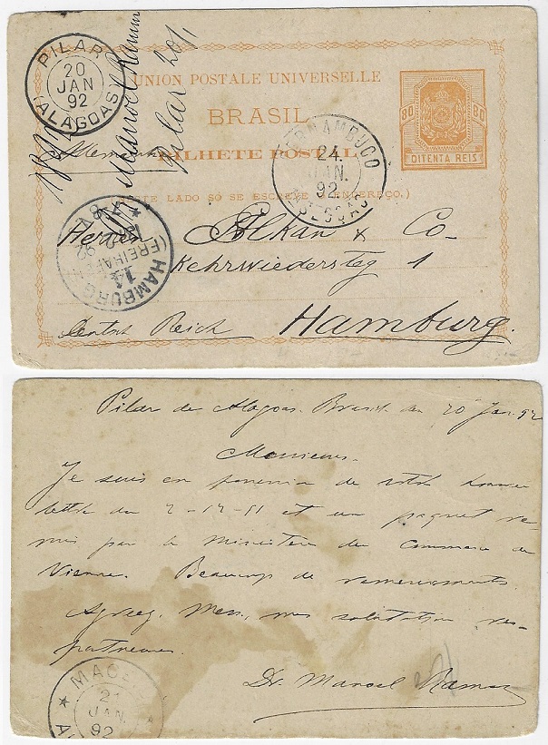 | 69616 | 1892, Inteiro postal BP-5, de Pilar de Alagoas / Alagoas (20/1) para Hamburgo / Alemanha (13/2), passagem por Maceió (21/1) e Pernambuco (24/1) (120 UF) | 120,00 | Foto |