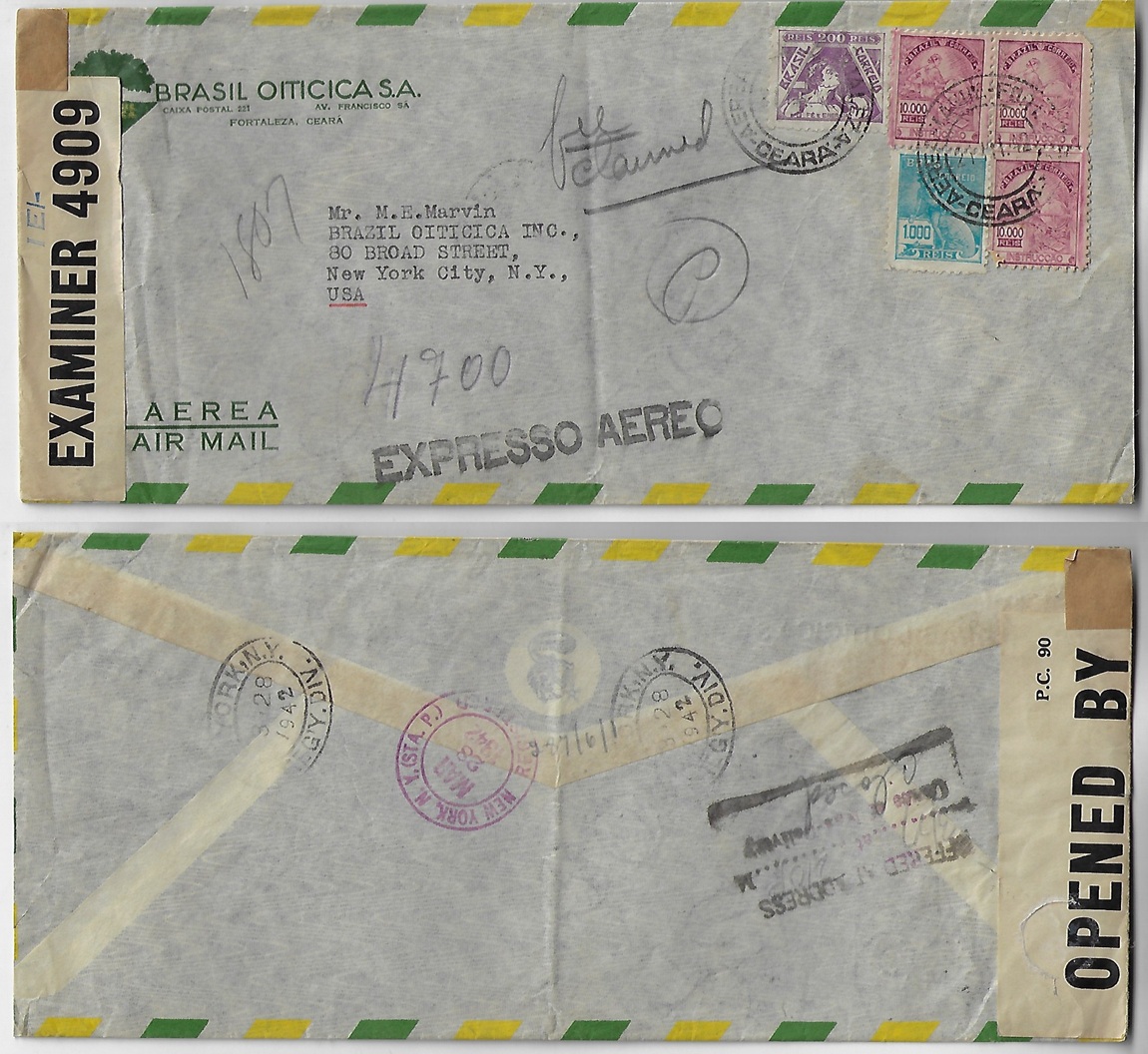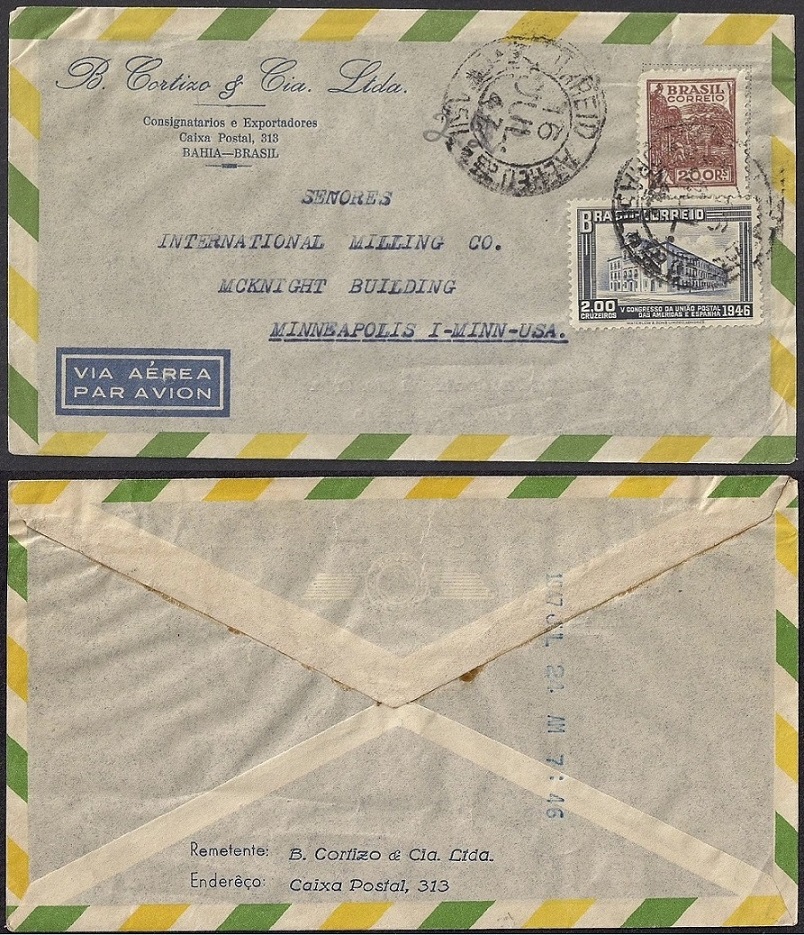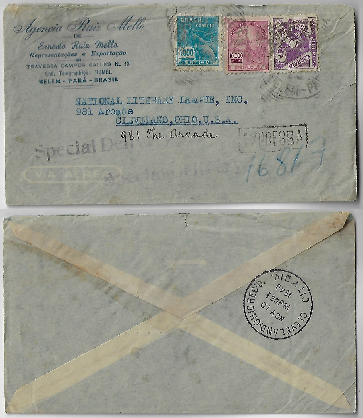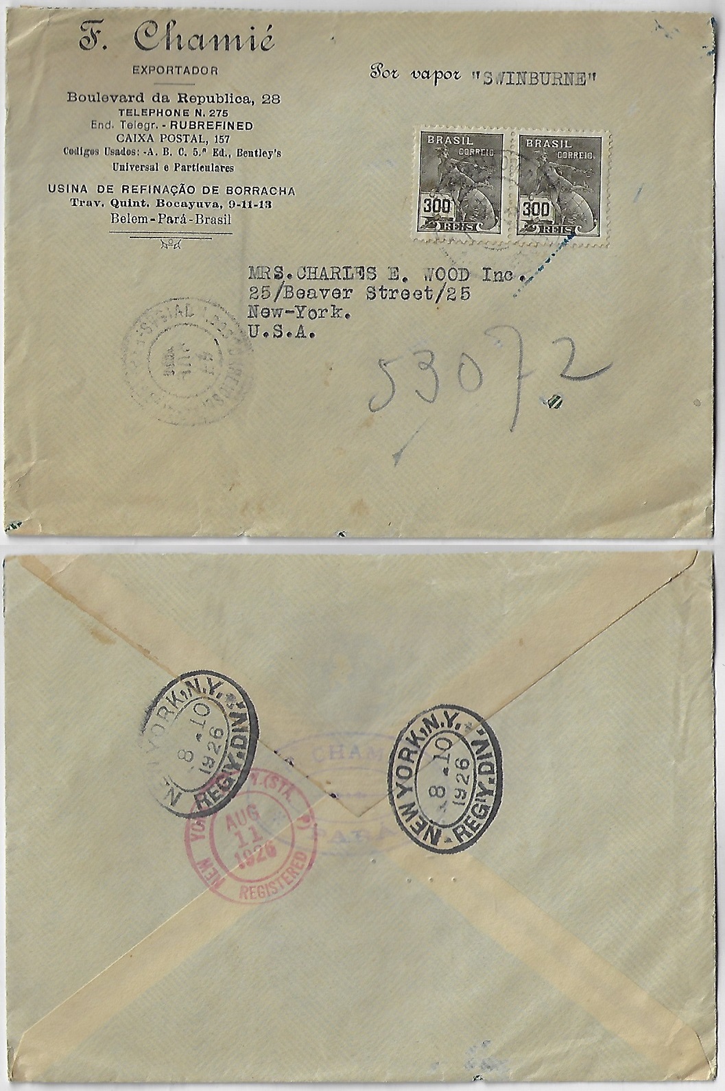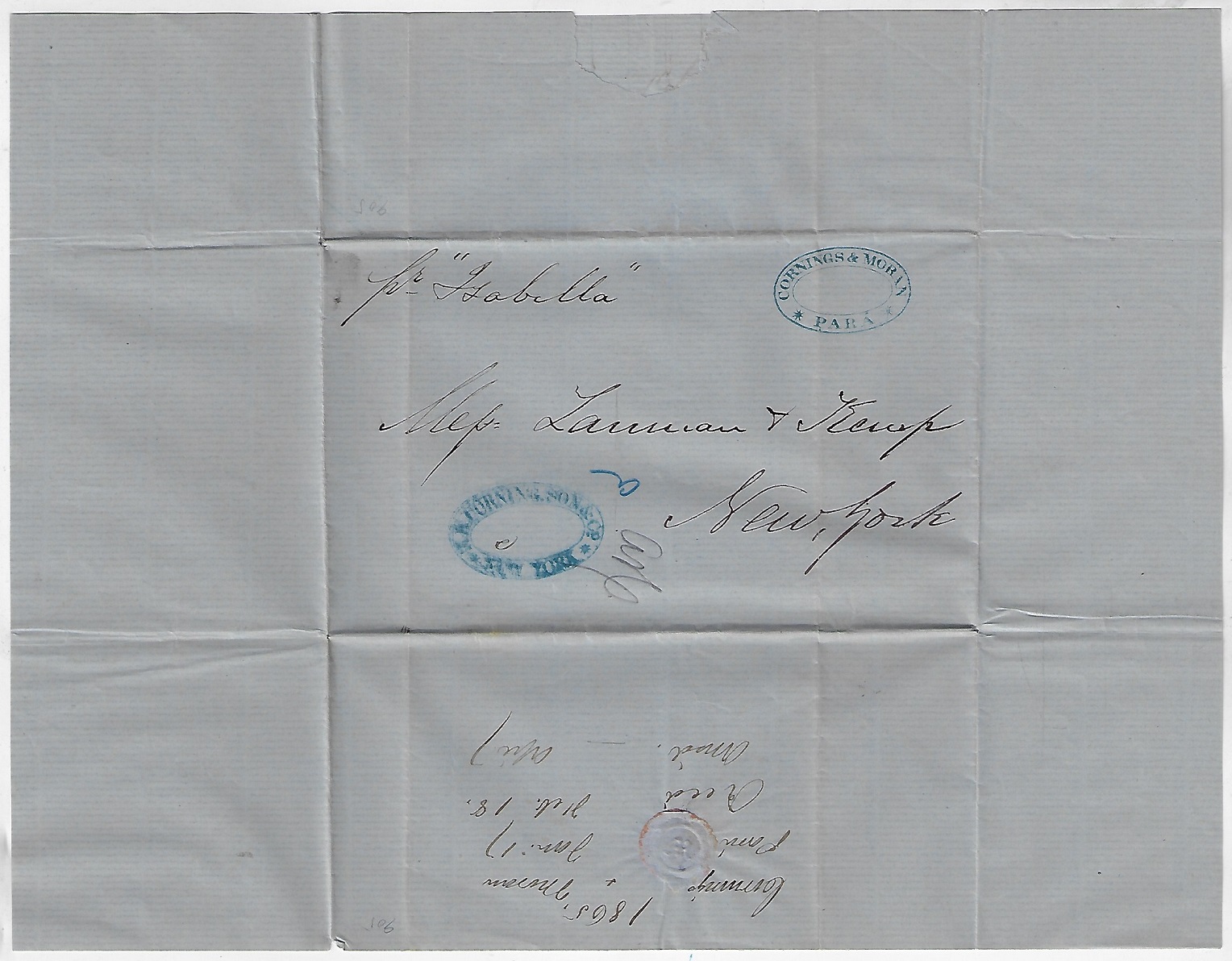 | 83204 | 1865, sobrecarta completa do Pará (17/1) para New York (18/2), com indicação manuscrista de ter sido transportada pelo vapor Isabella, carimbo da empresa "Cornings & Moran" e "Hanson K. Corning, Son & Co" | 107,00 | Foto |