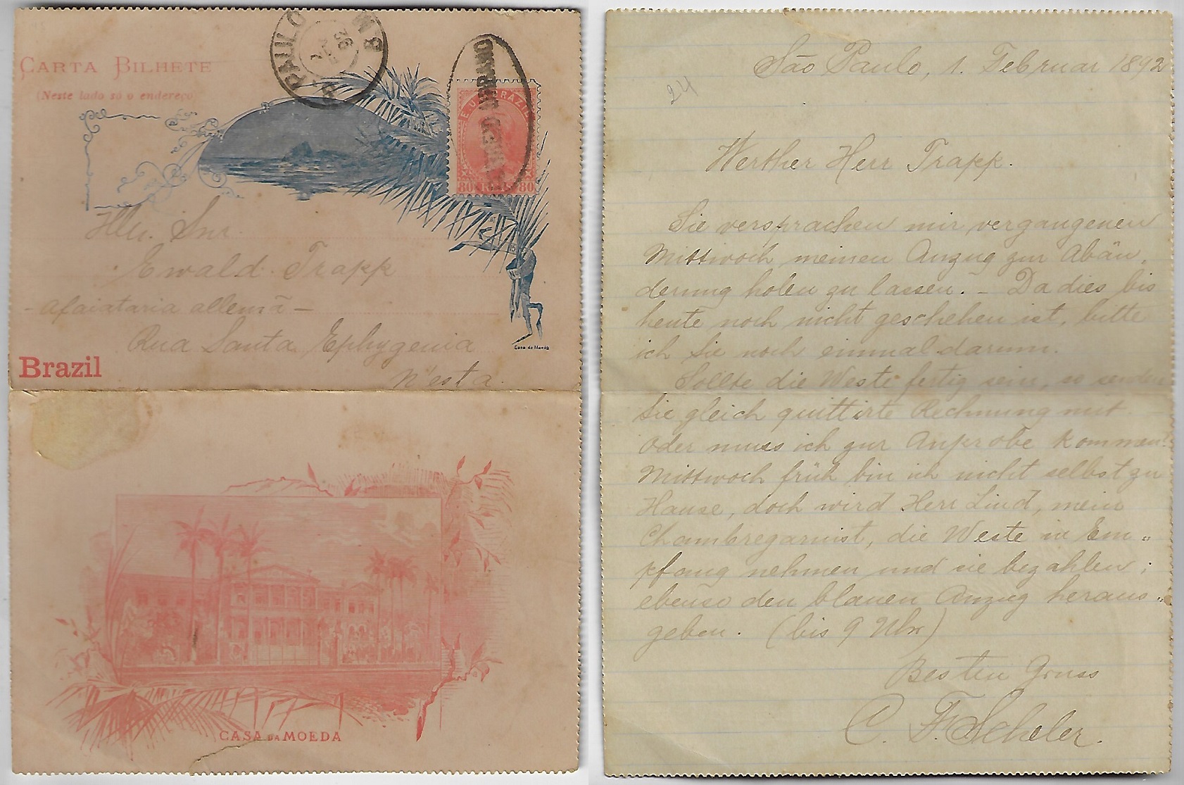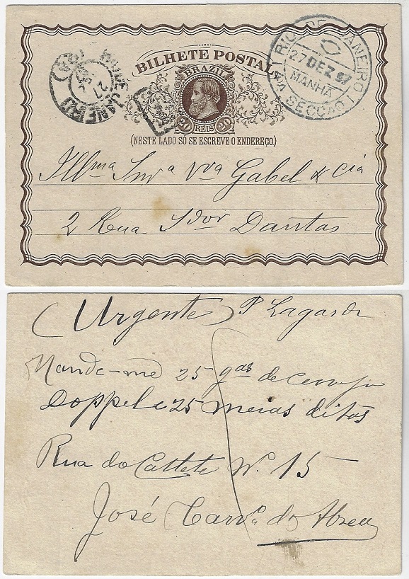 | 84882 | 1892, inteiro postal BP-22 circulado no Rio de Janeiro (21/5) para Fábrica de Cerveja, endereçado para Carlos Augusto Silly, com pedido | 100,00 | Foto |