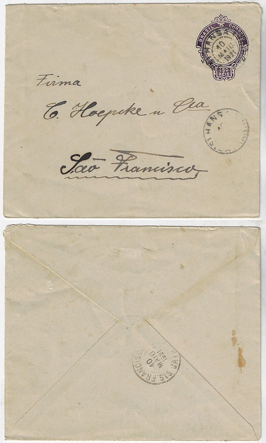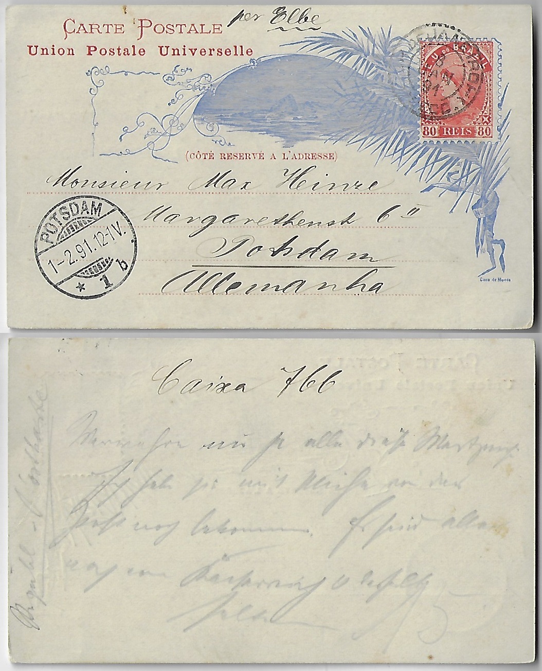 | 70668 | 1891, inteiro postal BP-27, selo 80 Réis, enviado do Rio de Janeiro (8/1) para Potsdam / Alemanha (1/2), indicação pelo "Elbe", da Royal Mail Steam Packet Company, dimensões 129x79 mm (80 UF) | 80,00 | Foto |