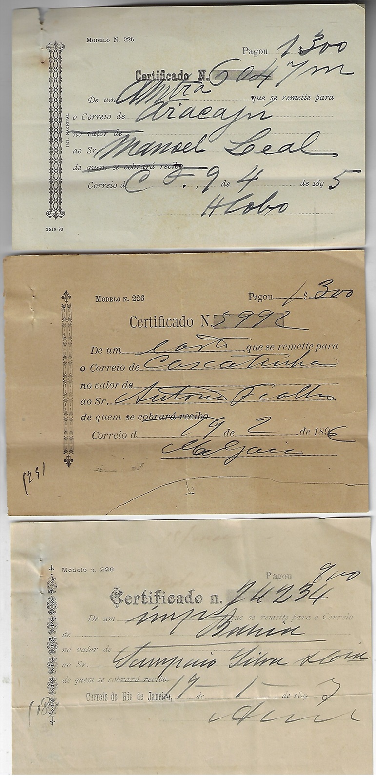 | 73060 | 1895/1897, 3 comprovantes de envio registrado de uma amostra, carta e impresso, todos diferentes, mas todos do Modelo 226 | 55,00 | Foto |