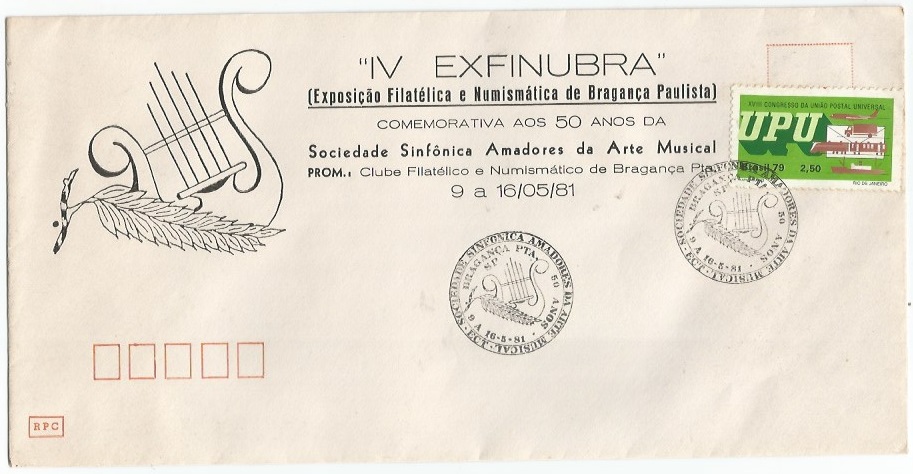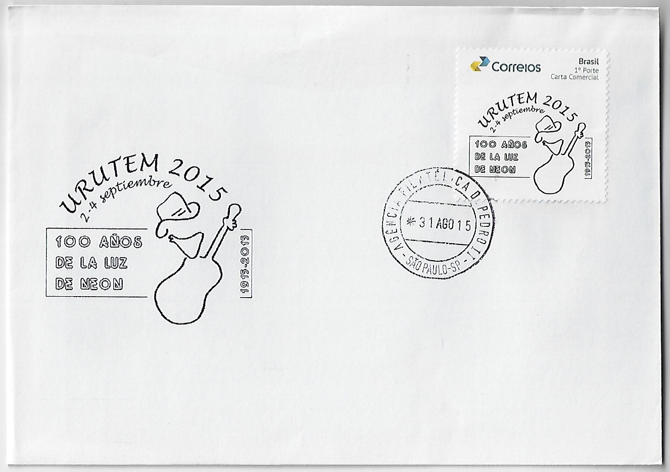 | 78491 | 2015, envelope com selo personalizado Urutem - Exposição Filatélica Temática Uruguai - Brasil, 100 anos da Luz de Neon, Violão, Música, Chapéu | 20,00 | Foto |