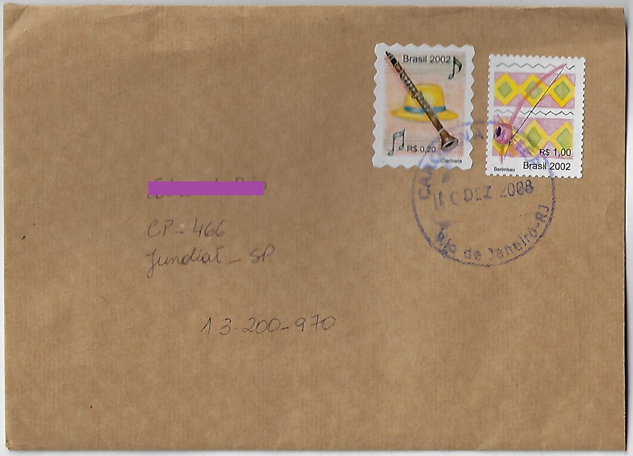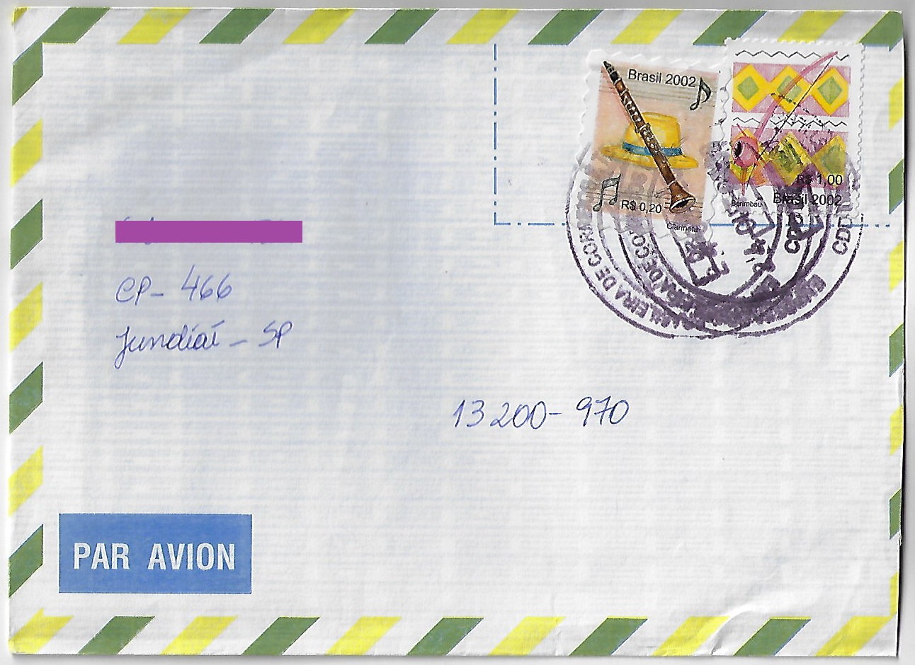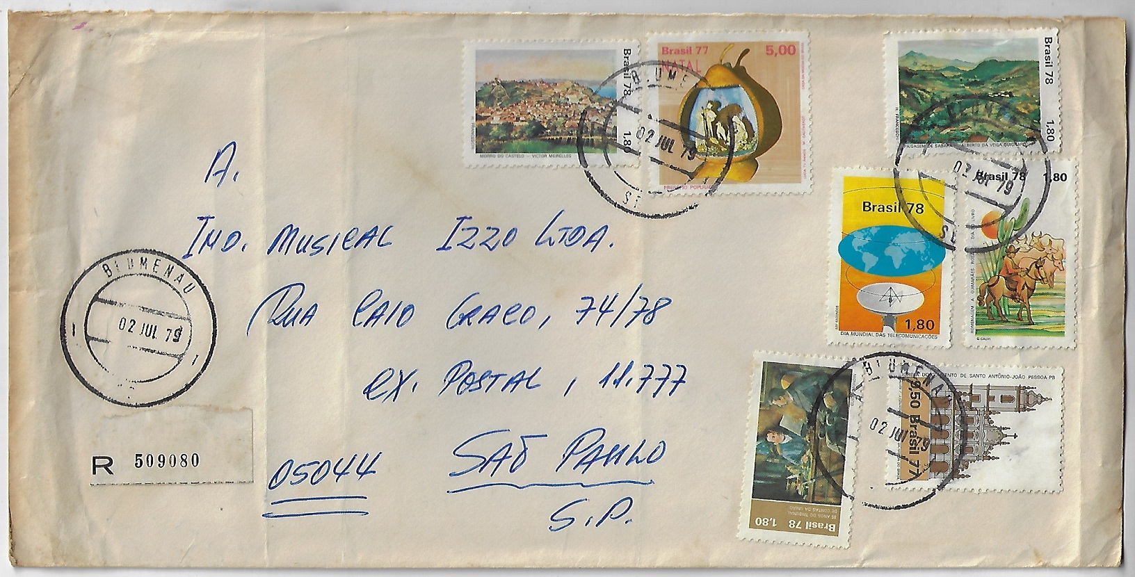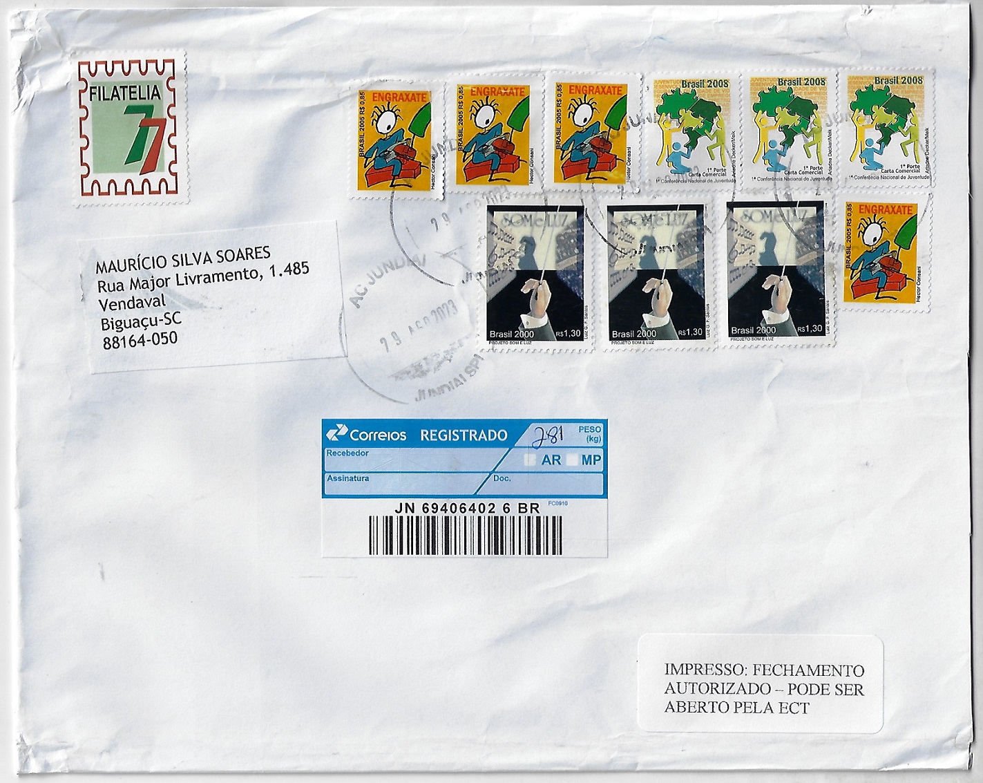 | 82488 | 2023, envelope impresso registrado enviado de Jundiaí (29/8) para Biguaçu, porteado com selo C-2353, Projeto Som e Luz, Mão e Batuta, C-2729, 1ª Conferência Nacional da Juventude e 4 regulares | 10,00 | Foto |