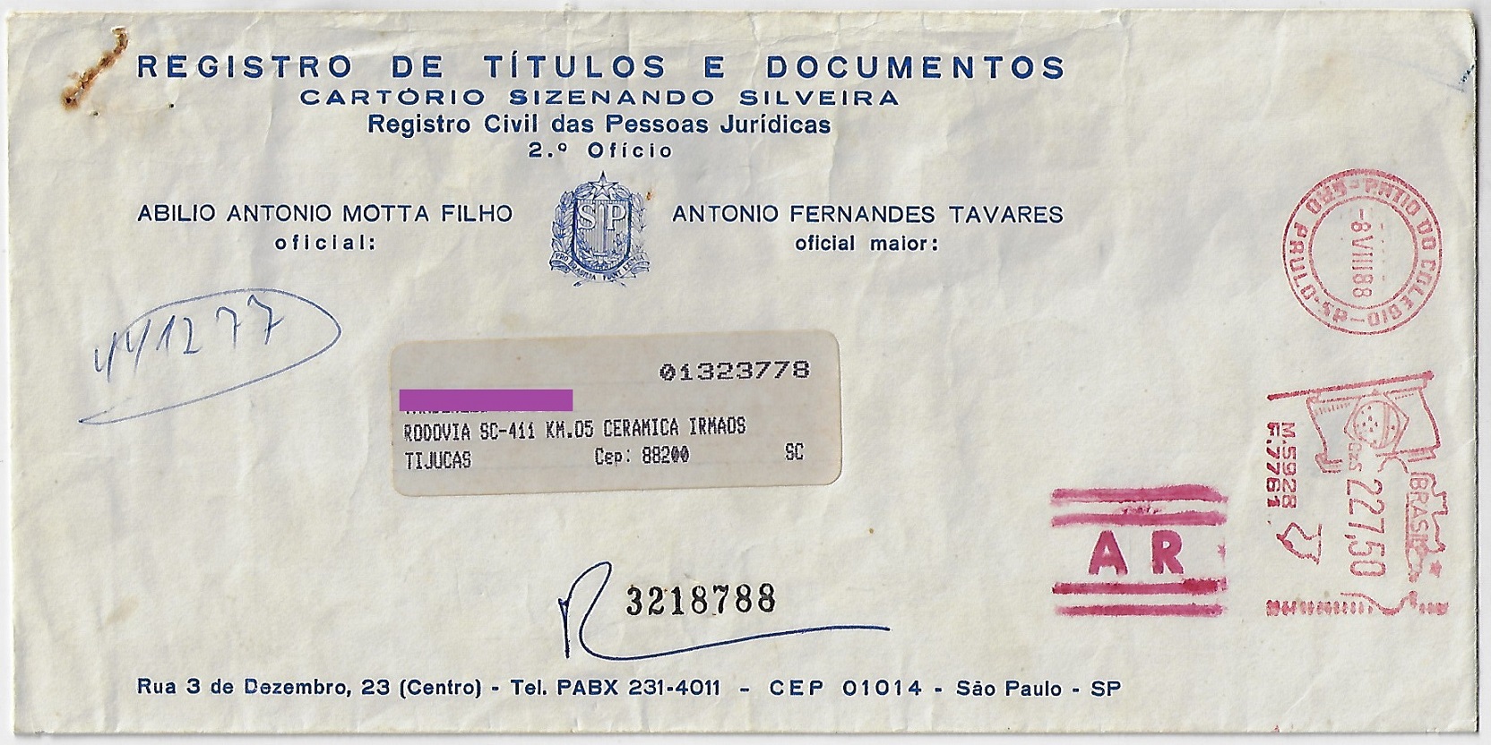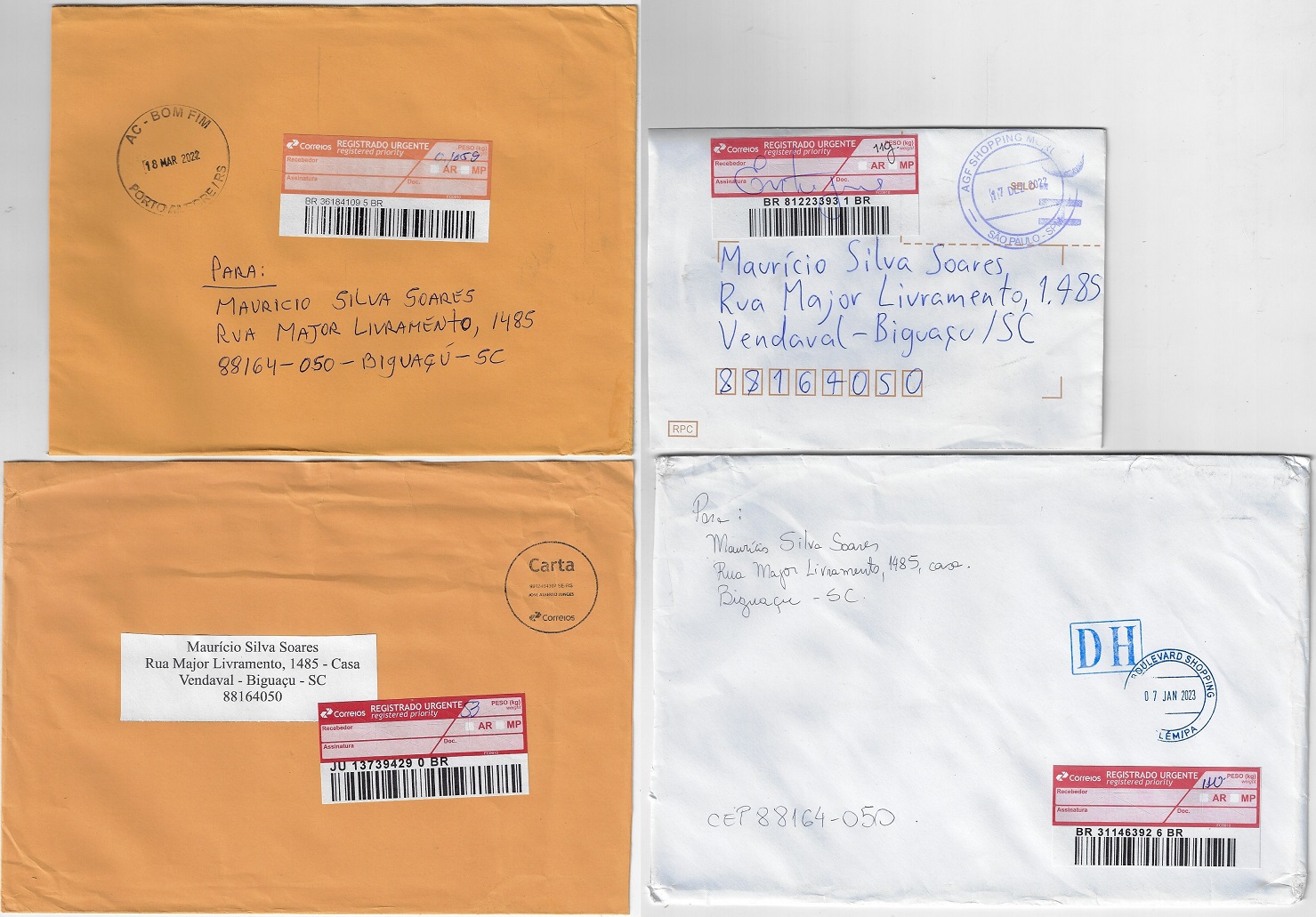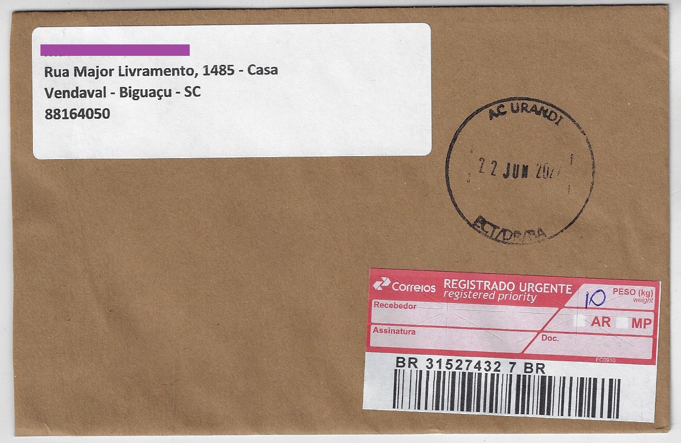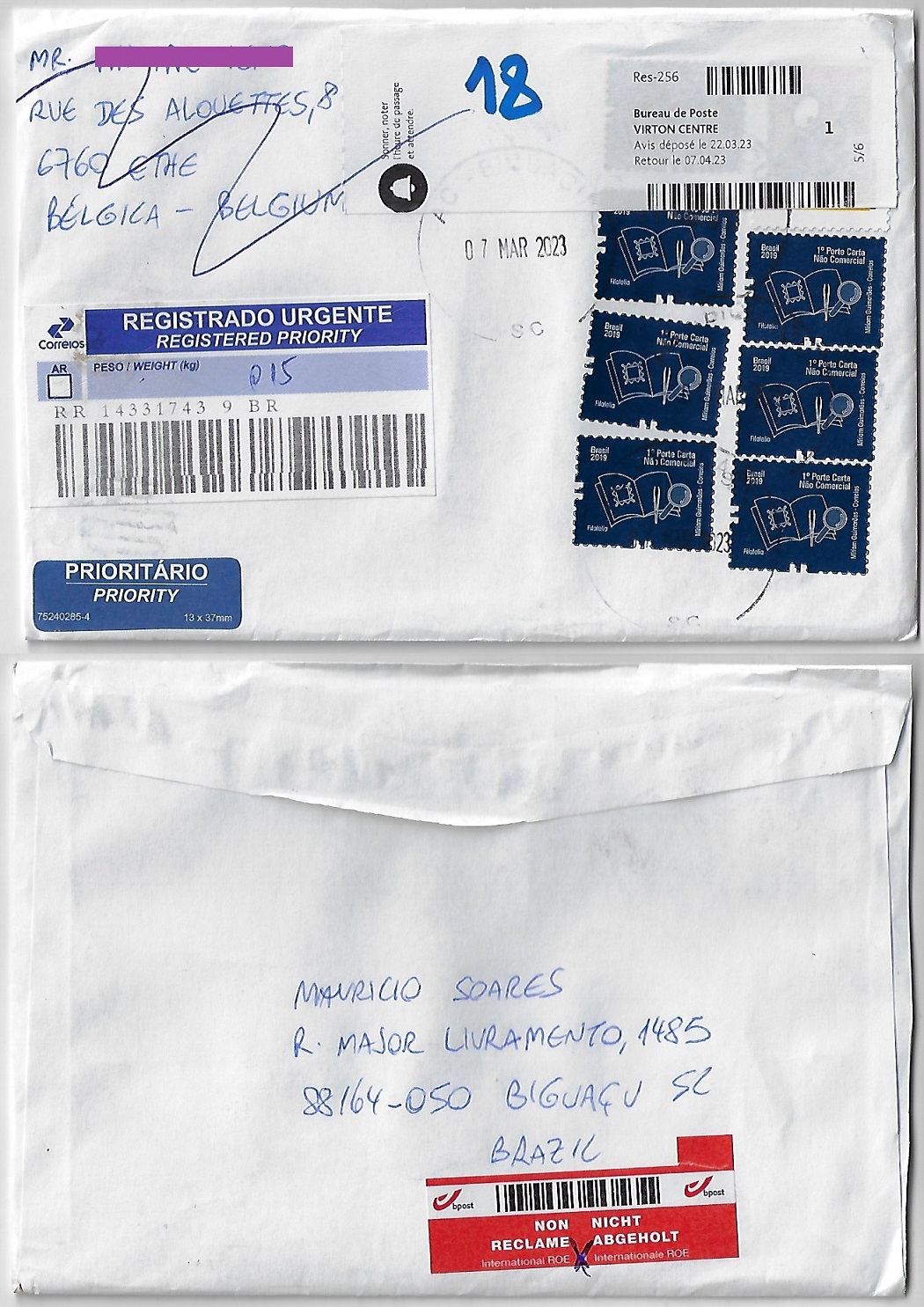 | 83000 | 2023, envelope prioritário registrado enviado de Biguaçu (7/3) para Ethe / Bélgica (22/3), retorando ao remetente em 7/4 | 10,00 | Foto |