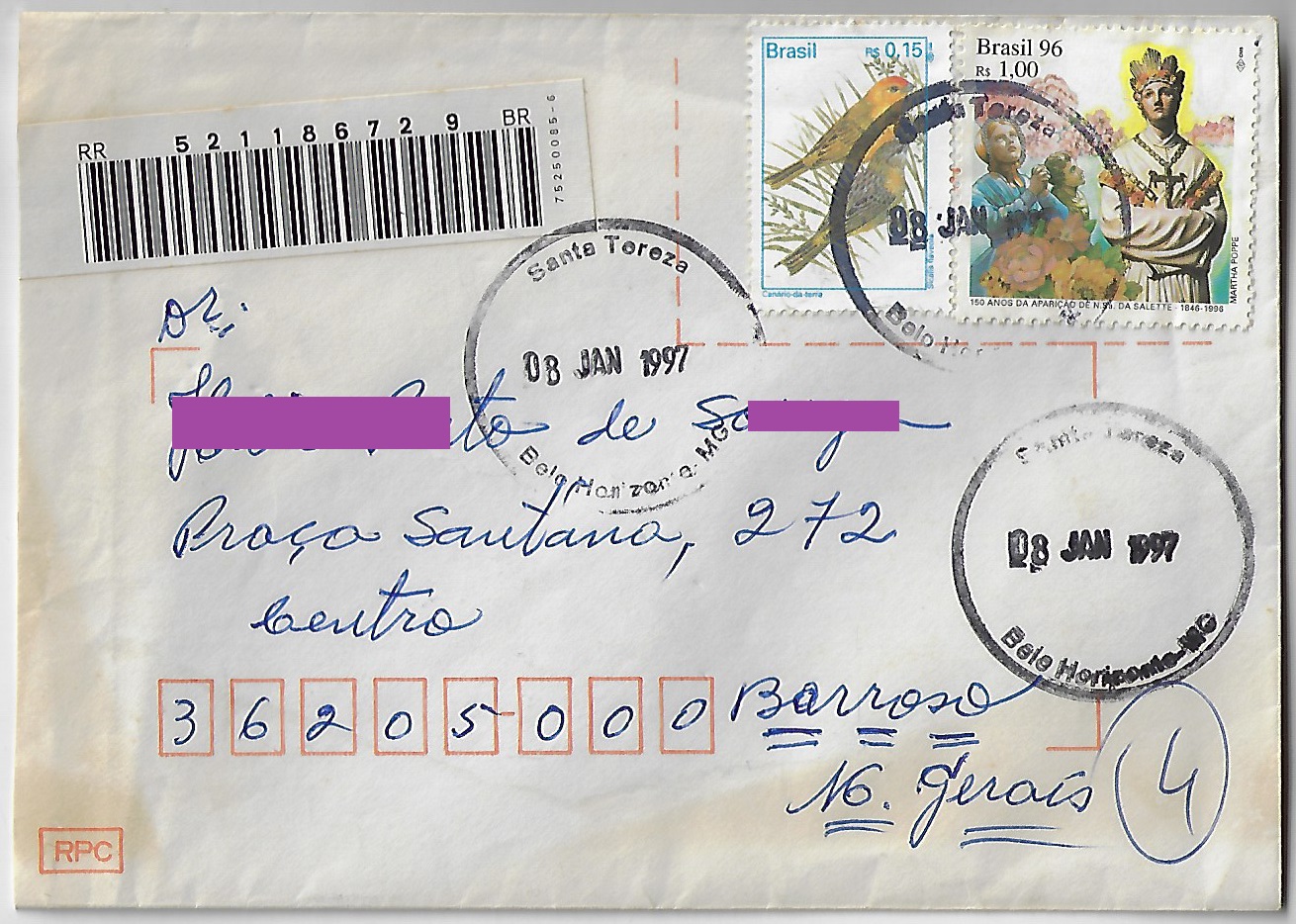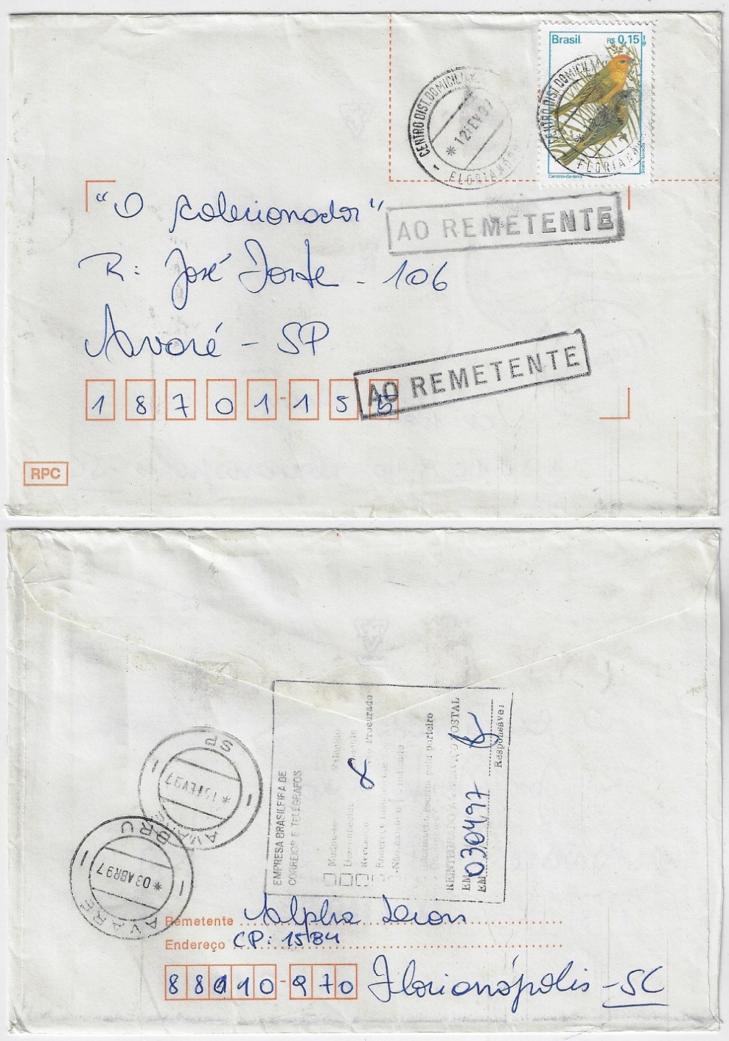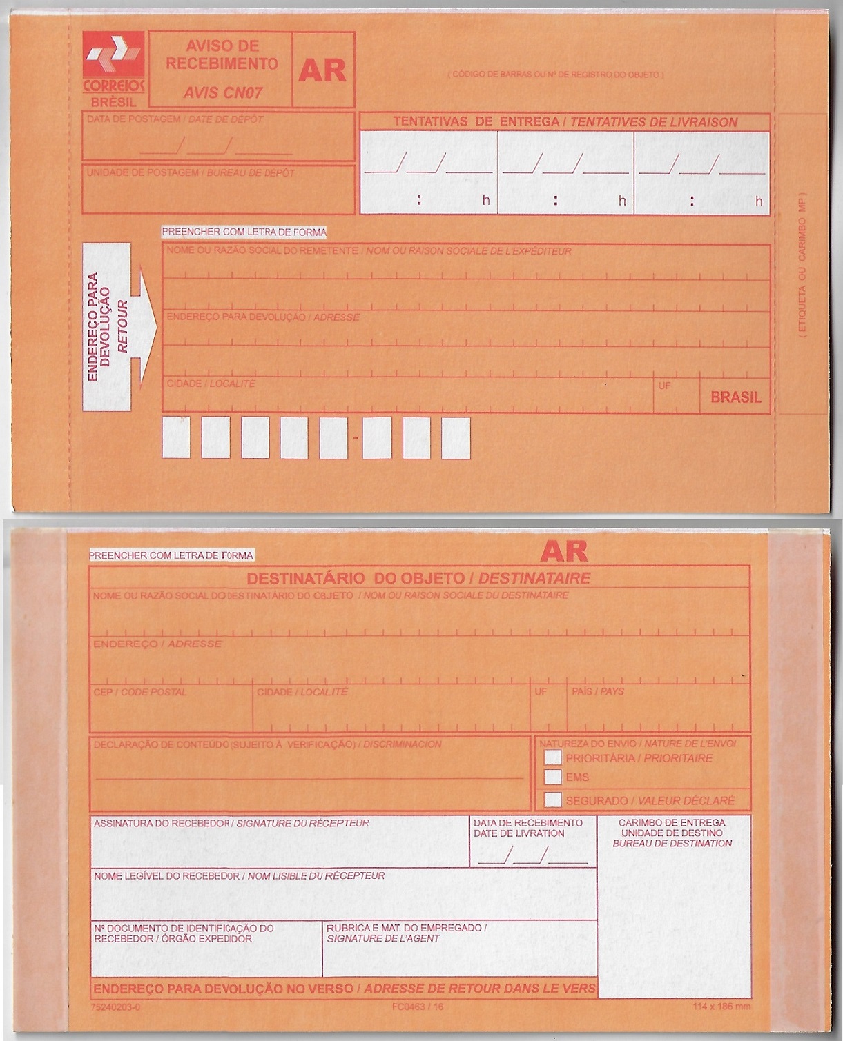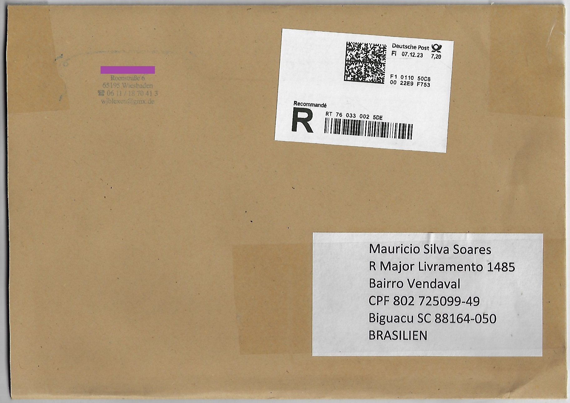 | 83000 | 2023, envelope prioritário registrado enviado de Biguaçu (7/3) para Ethe / Bélgica (22/3), retorando ao remetente em 7/4 | 10,00 | Foto |