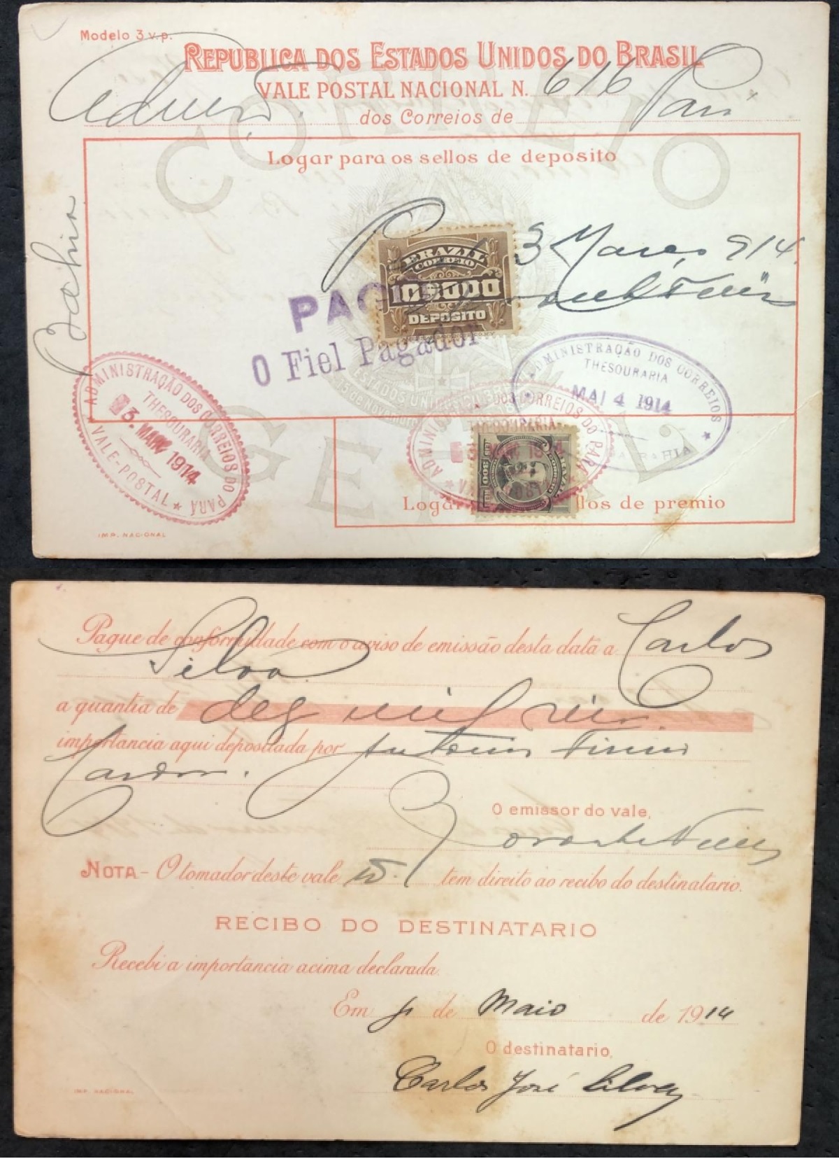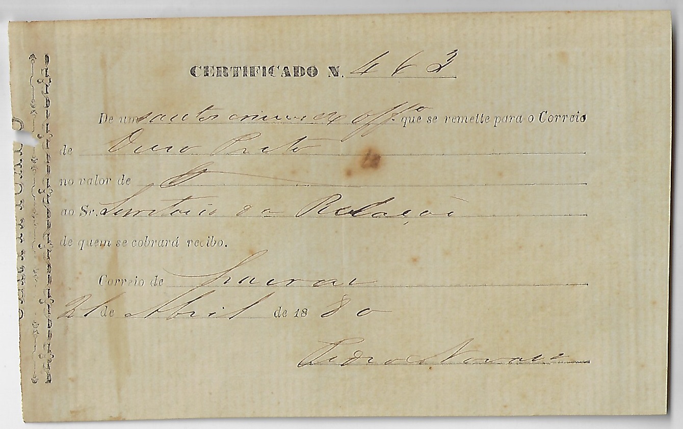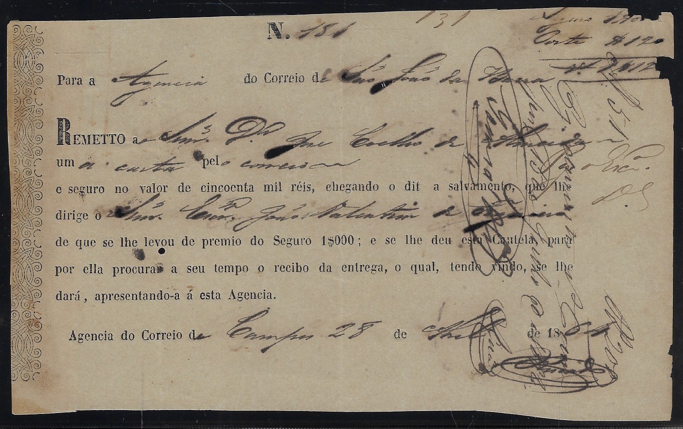 | 78421 | 1864, recibo de carta registrada com seguro de 50.000 Réis enviada de Campos (28/4) para São João da Barra (15/6) | 100,00 | Foto |