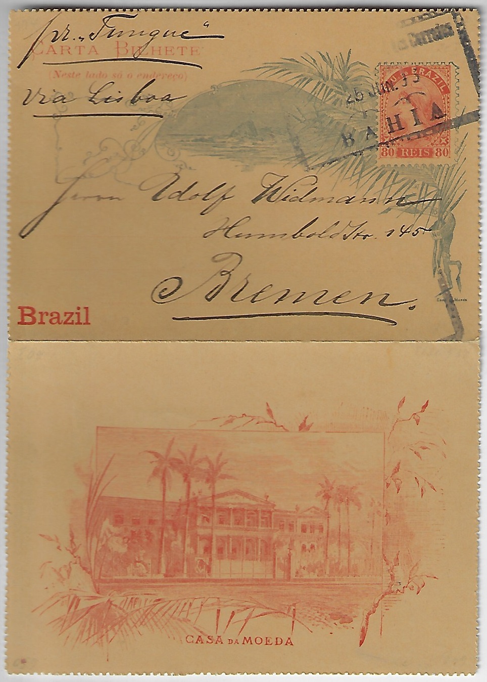 | 78684 | 1893, inteiro postal CB-38 enviado de Salvador (25/6) para Bremen / Alemanha, indicação manuscrito "pelo Tungue via Lisboa", navio da Mala Real Portuguesa | 75,00 | Foto |