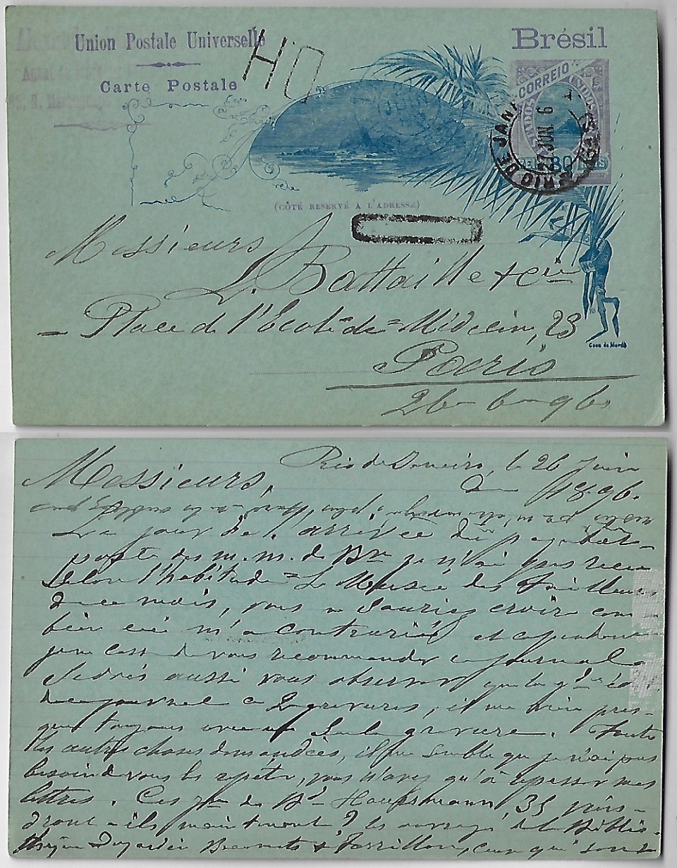| 78714 | 1896, inteiro postal BP-48e selo 80 Réis enviado do Rio de Janeiro (27/6) para Paris / França, carimbos "DH" e "clipe", carimbo marítimo francês (27/6) | 80,00 | Foto |