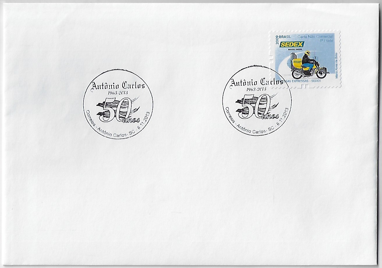 | 78741 | 2013, envelope com carimbo comemorativo aos 50 anos de Antônio Carlos | 10,00 | Foto |