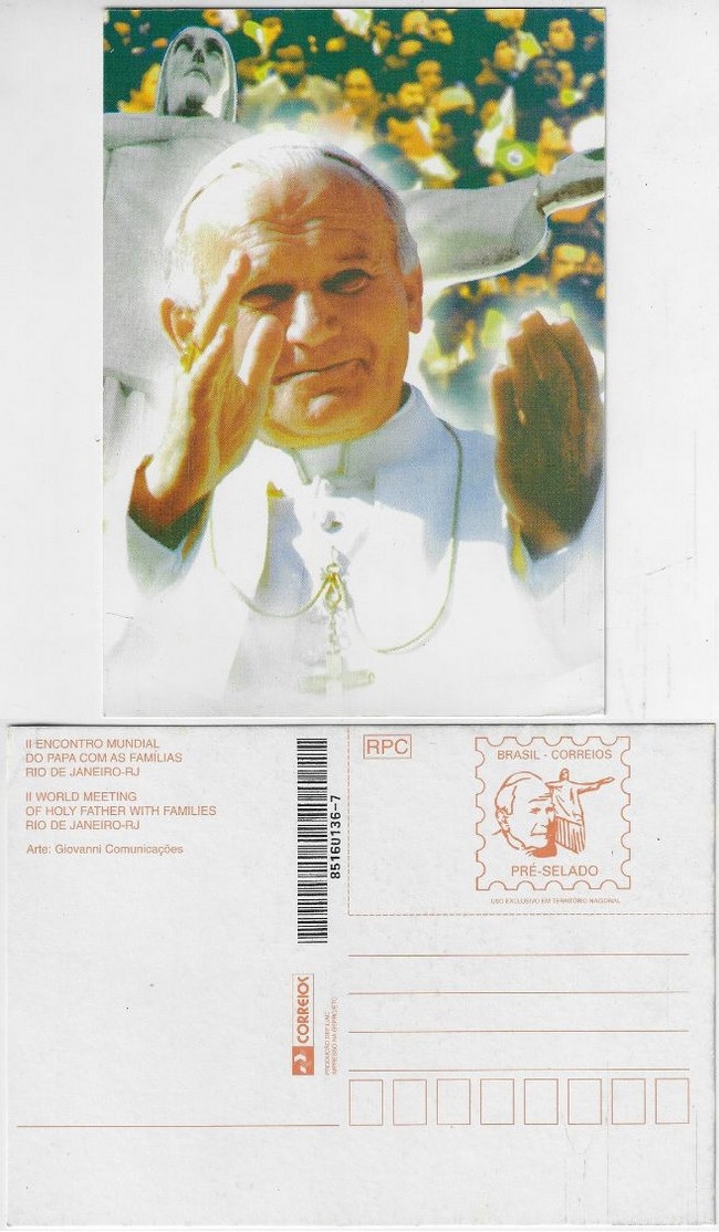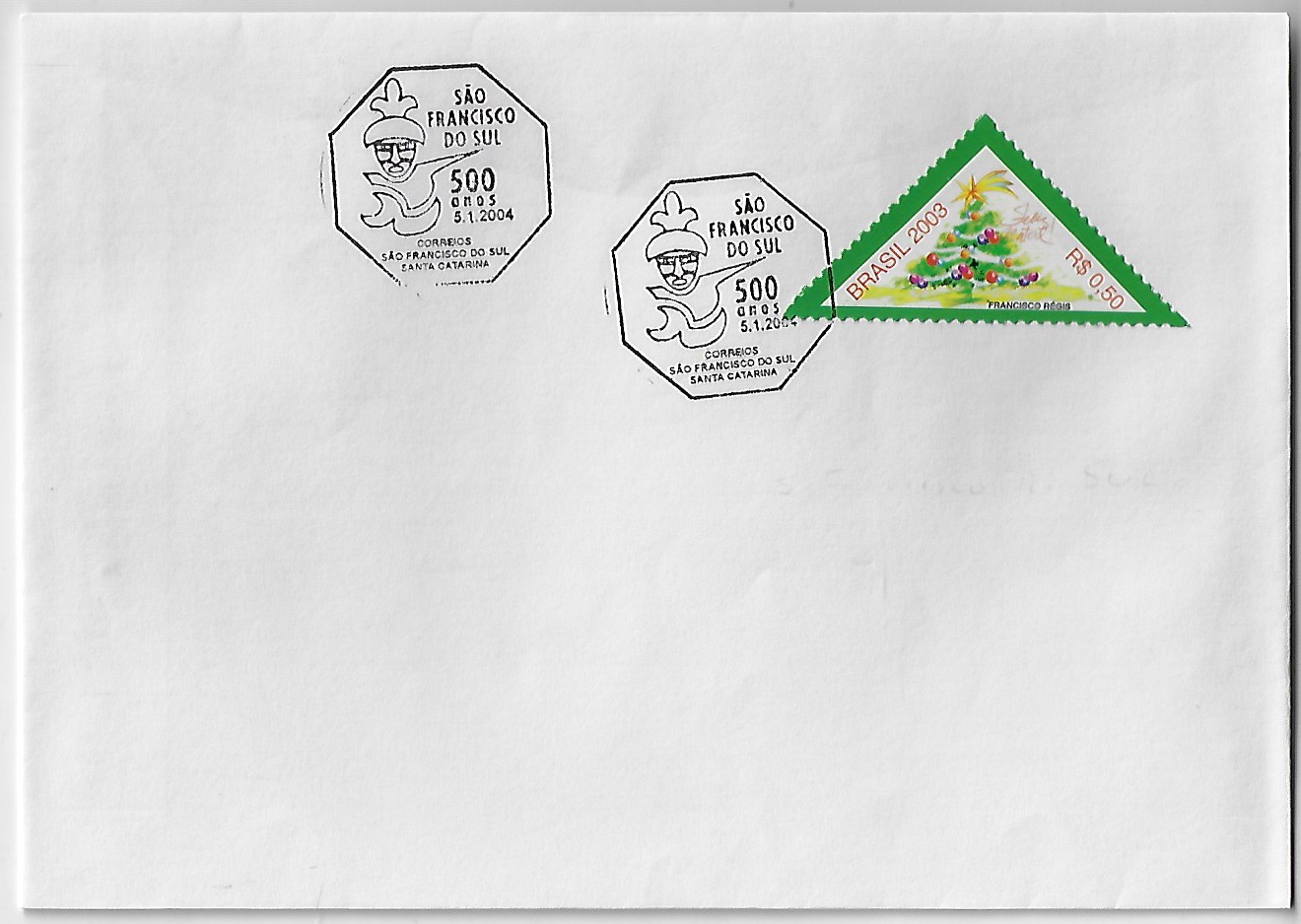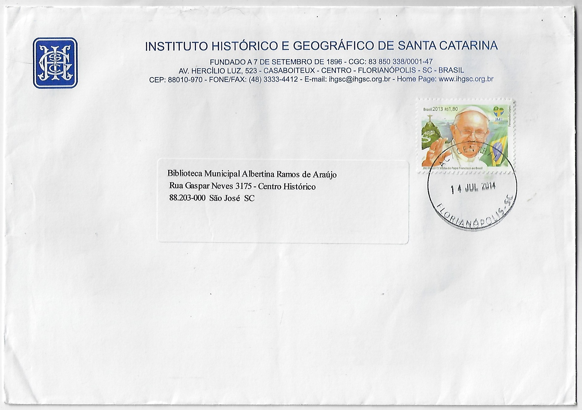 | 80015 | 2014, envelope enviado de Florianópolis (14/7) para São José, selo RHM-C-3290, Jornada Mundial da Juventude, Visita do Papa Francisco ao Rio de Janeiro | 10,00 | Foto |