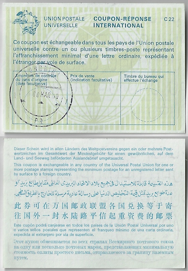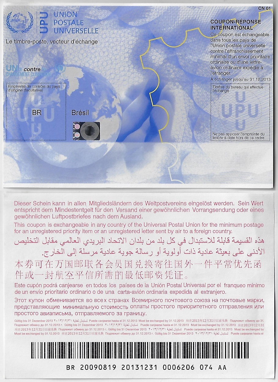 | 80397 | 2013, coupon-réponse international com mão segurando globo terrestre, ONU contra as mudanças climáticas | 20,00 | Foto |