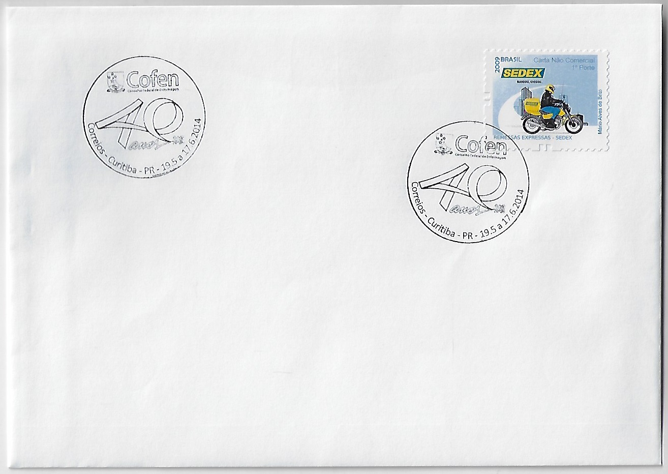 | 79031 | 2014, envelope com carimbo comemorativo aos 40 anos do Conselho Federal de Enfermagem, de Curitiba | 10,00 | Foto |
