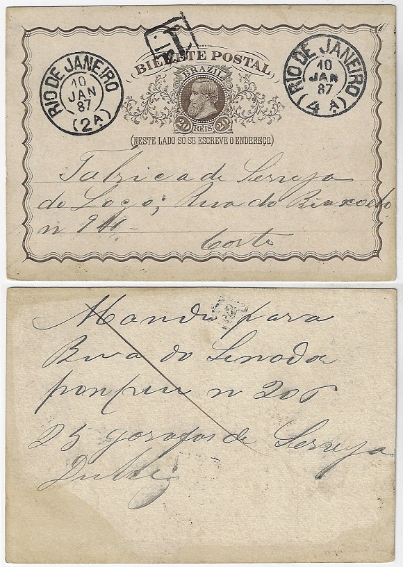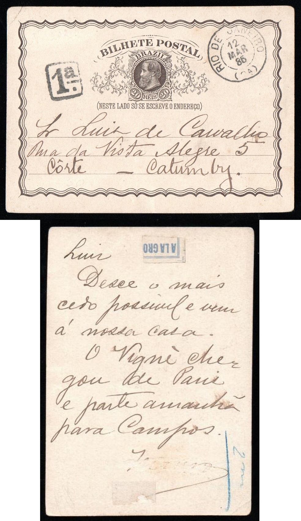 | 79131 | 1885, inteiro postal BP-11 D. Pedro II 20 Réis circulado no Rio de Janeiro (15/1), carimbo "1ª." (40 UF) | 30,00 | Foto |
