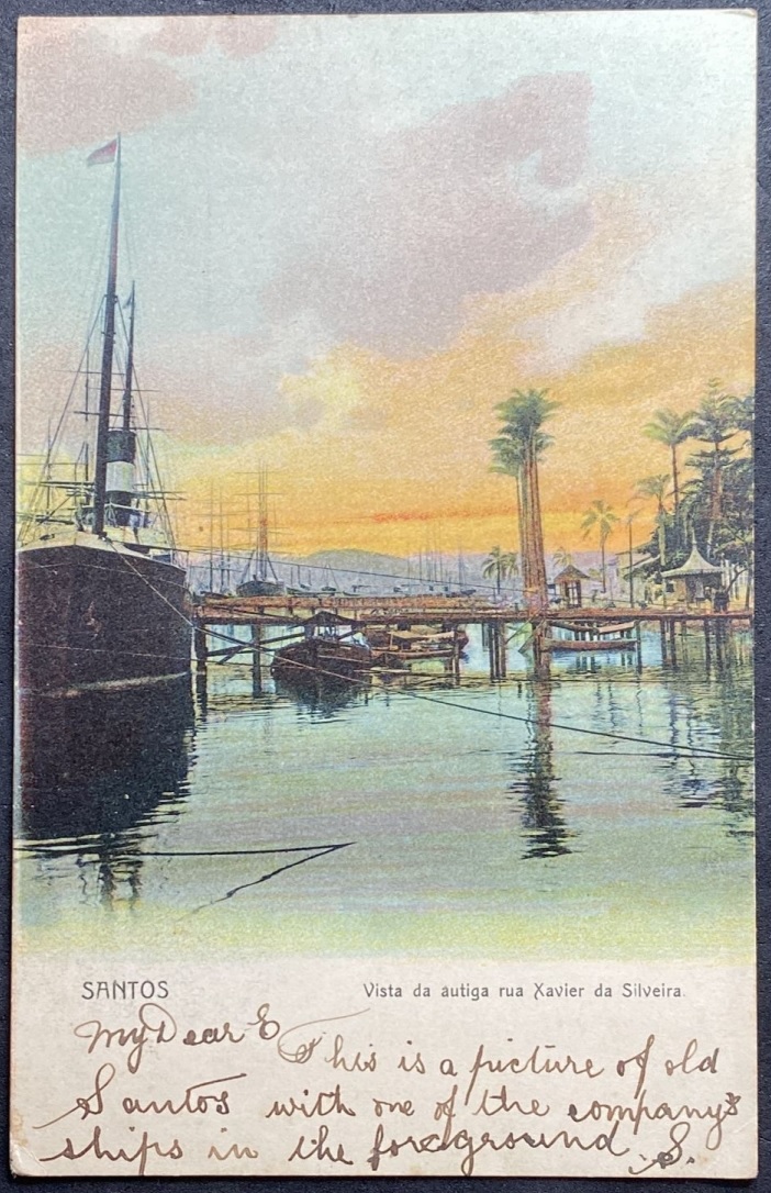 | 79216 | 1900s, cartão postal com foto colorizada de Vista da antiga Rua Xavier da Silveira, em Santos, Editor H. Eckmann, enviado para Halifax / Grã-Bretanha, porteado com selo Madrugada 100 Réis, pelo navio Atlantique, da Compagnie des Messageries Maritimes | 75,00 | Foto |